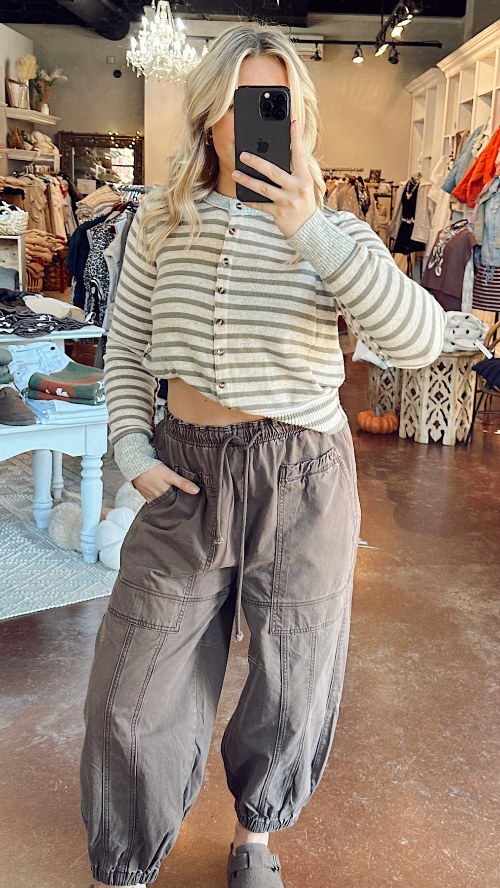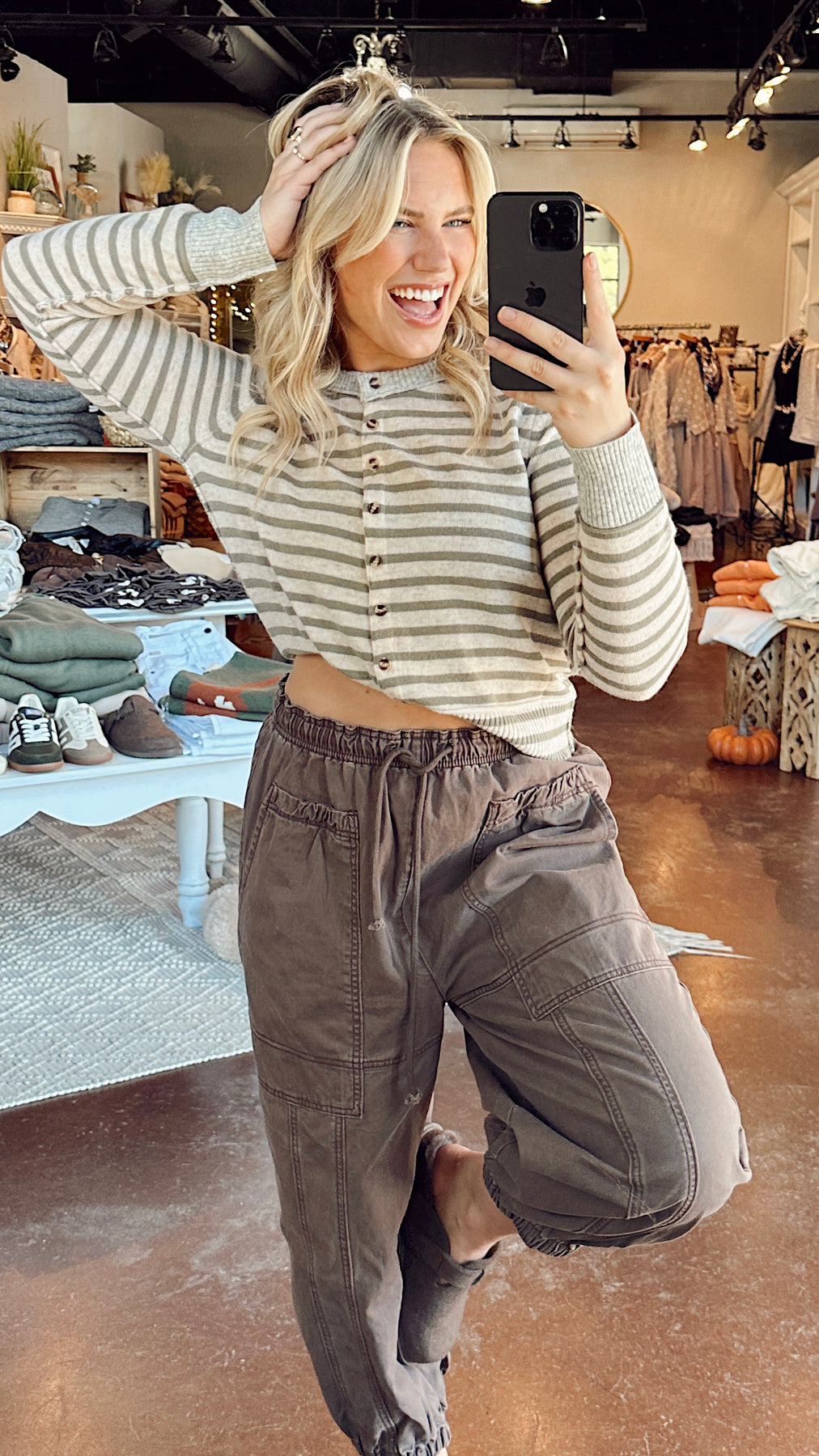 The Mavery Pants are your new go-to for relaxed style and comfort. These brown jogger pants feature a playful tie waist that lets you adjust the fit just right. Perfect for lounging or running errands, they blend cozy fabric with a flattering shape, making casual days feel a little more fun.