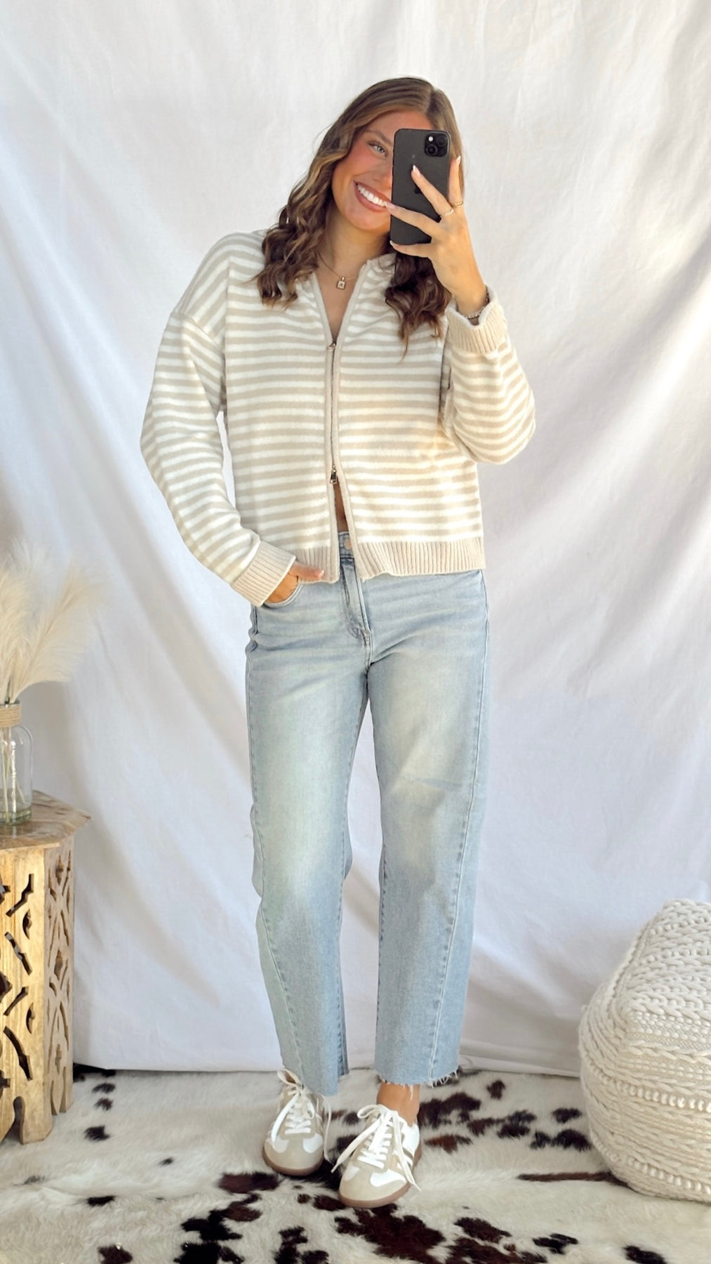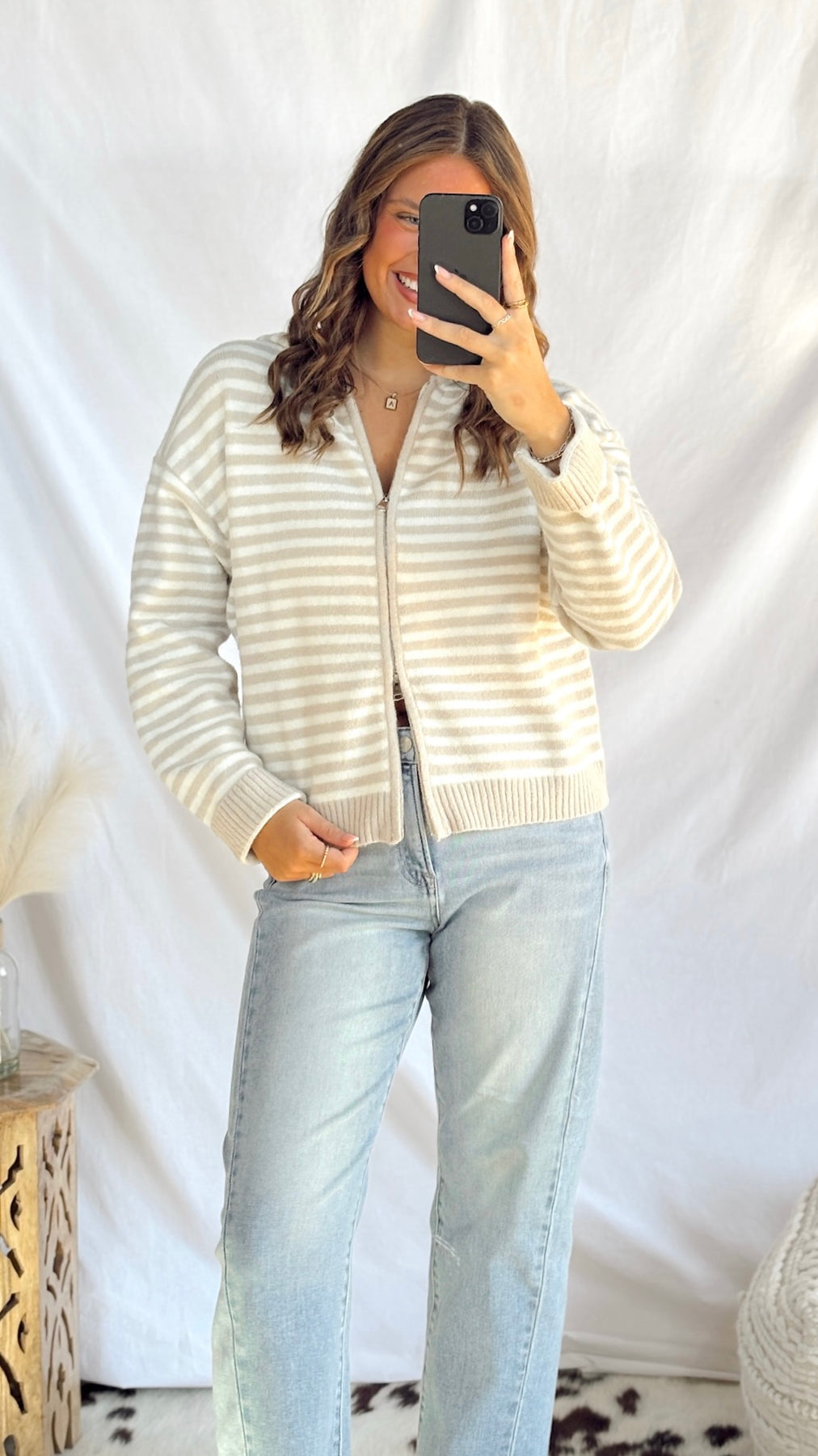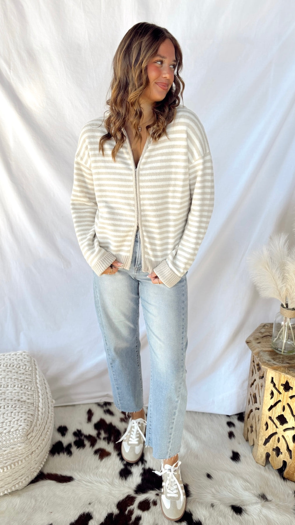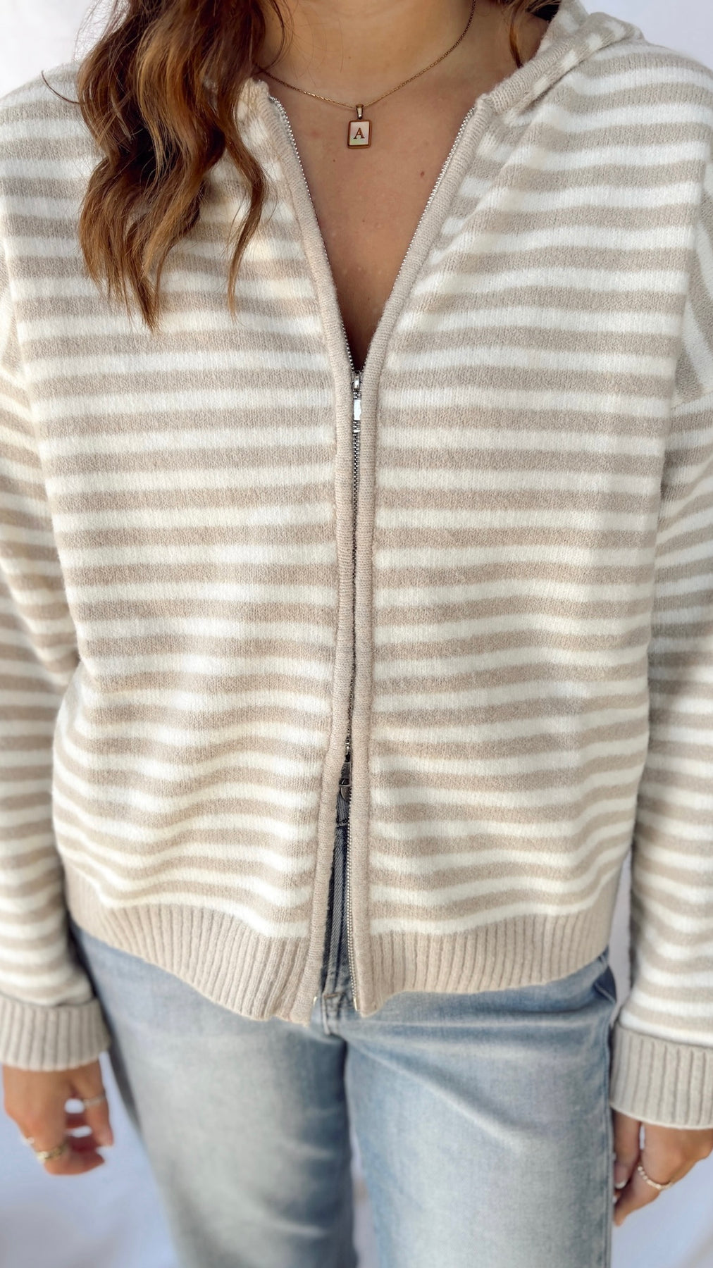 The Gracie Zip-Up Sweater in soft beige is your new go-to layer for effortless style. Featuring classic stripes and a convenient zip-up front, this cozy sweater transitions seamlessly from casual weekends to relaxed workdays.
