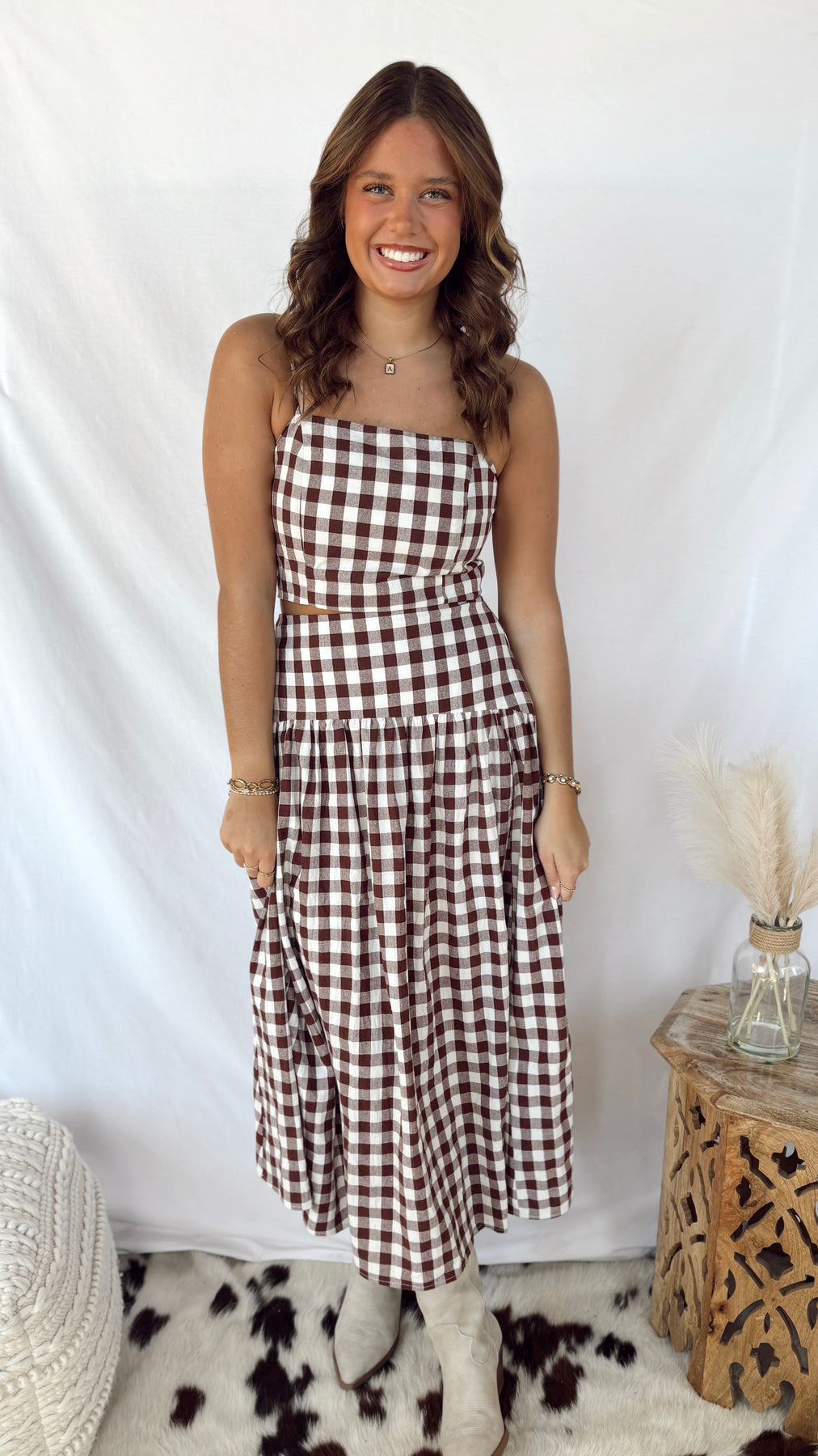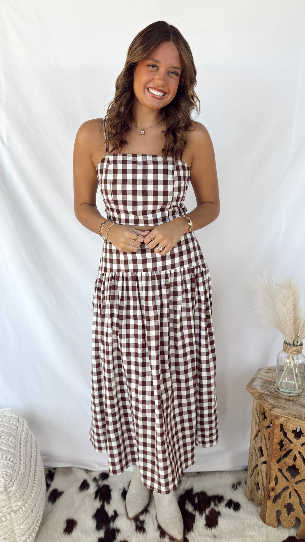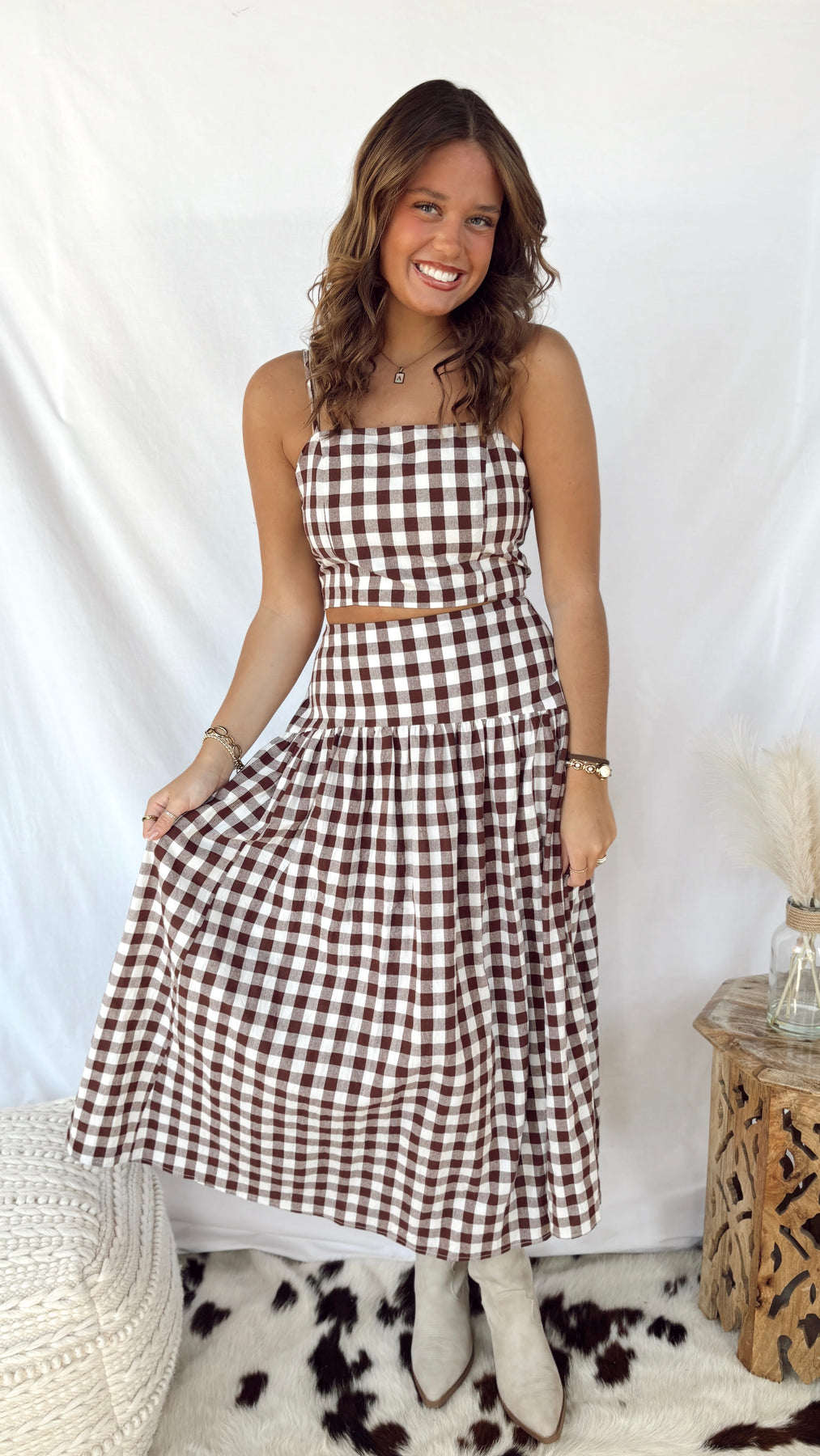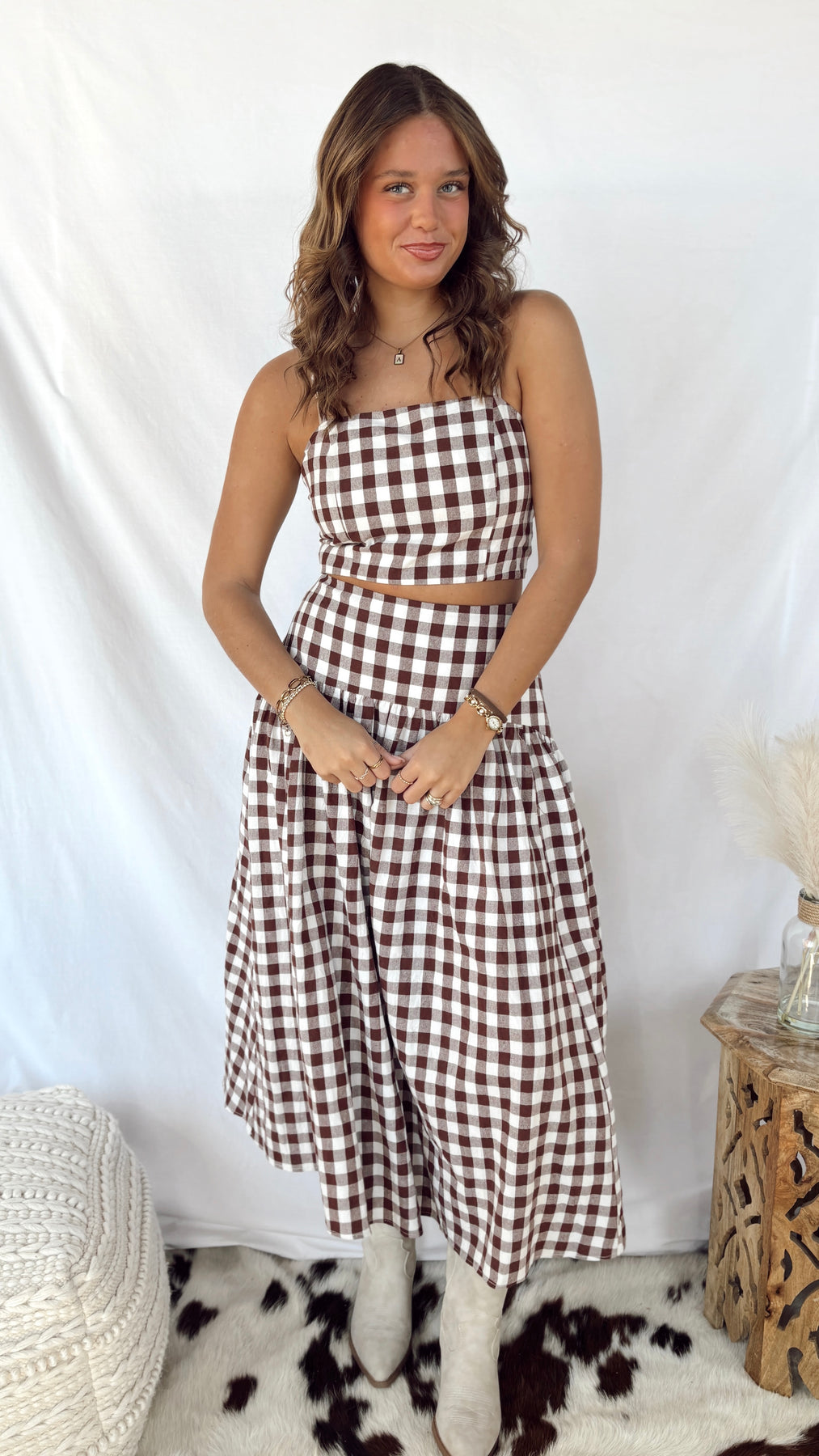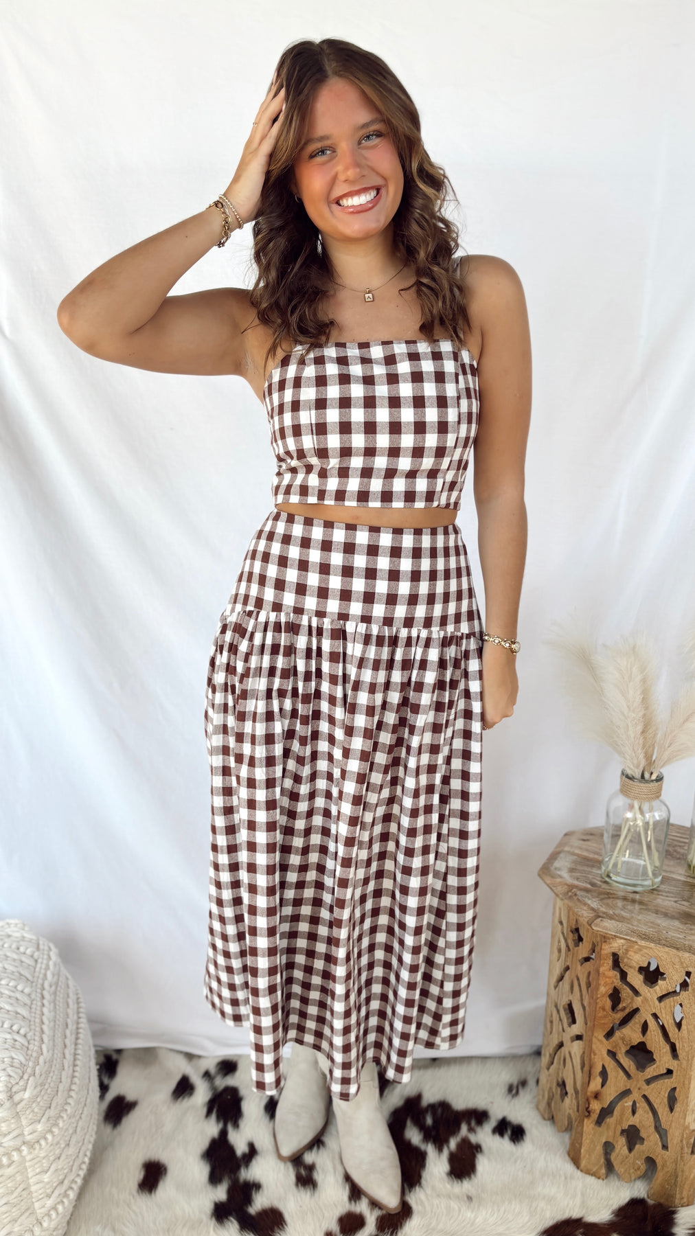 The Heidi Top is your go-to cropped piece for effortless style. Featuring a charming gingham pattern in warm brown and white, this stap top brings a playful vintage vibe to any outfit. Perfect for pairing with high-waisted jeans or skirts, it's the ideal layer for transitional weather. Simple, cute, and endlessly versatile—this is the top you'll reach for again and again.