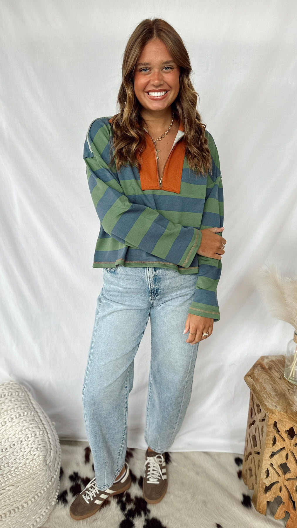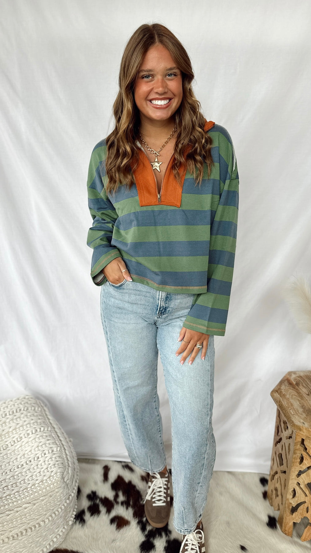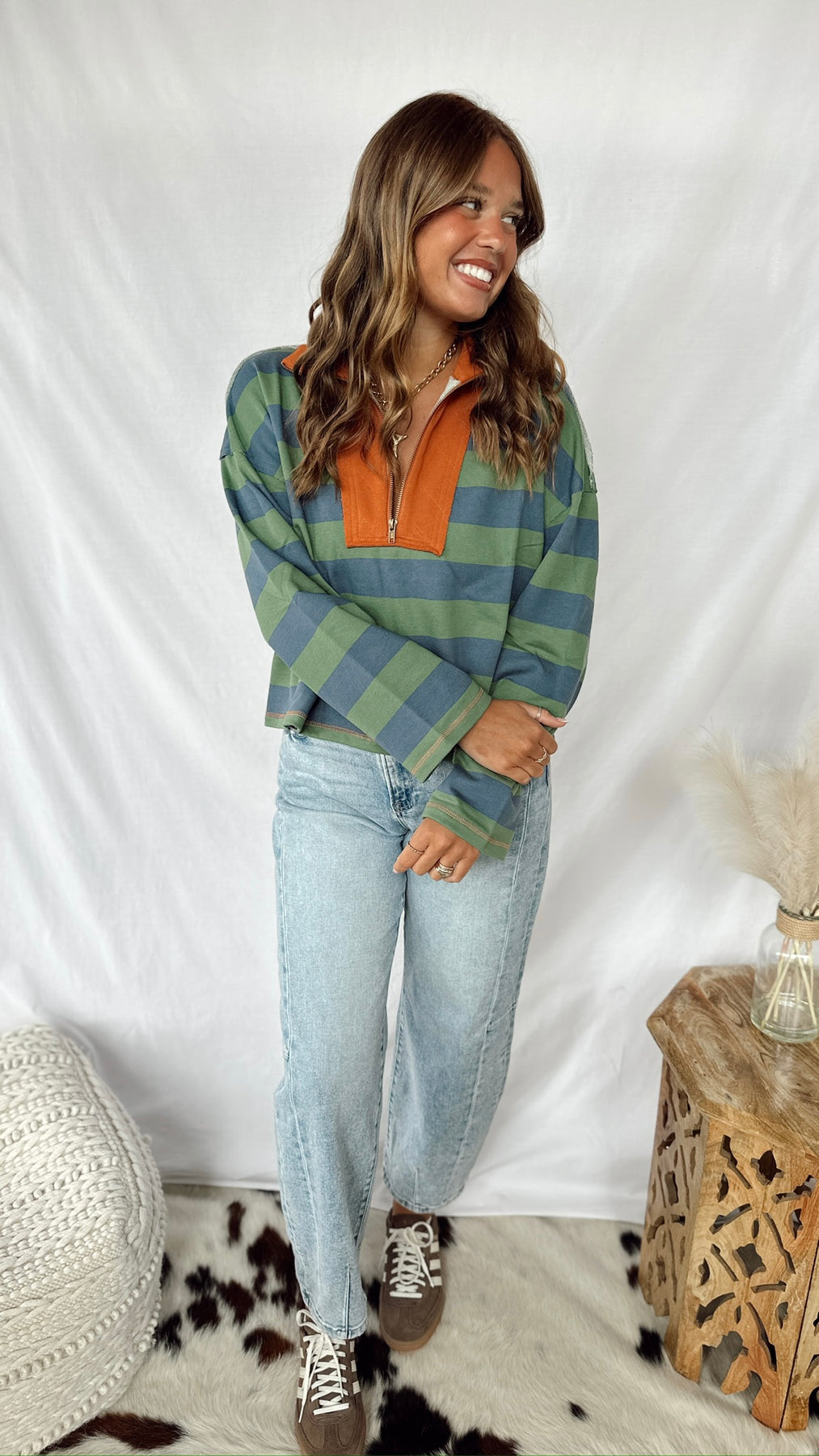 The Jasper Top brings fun to your wardrobe with its vibrant blue and green stripes paired with a bold orange collar. This long-sleeved quarter-zip top offers a comfy, casual fit perfect for layering or wearing on its own. Add a pop of color and playful style to your everyday look with this easygoing top.