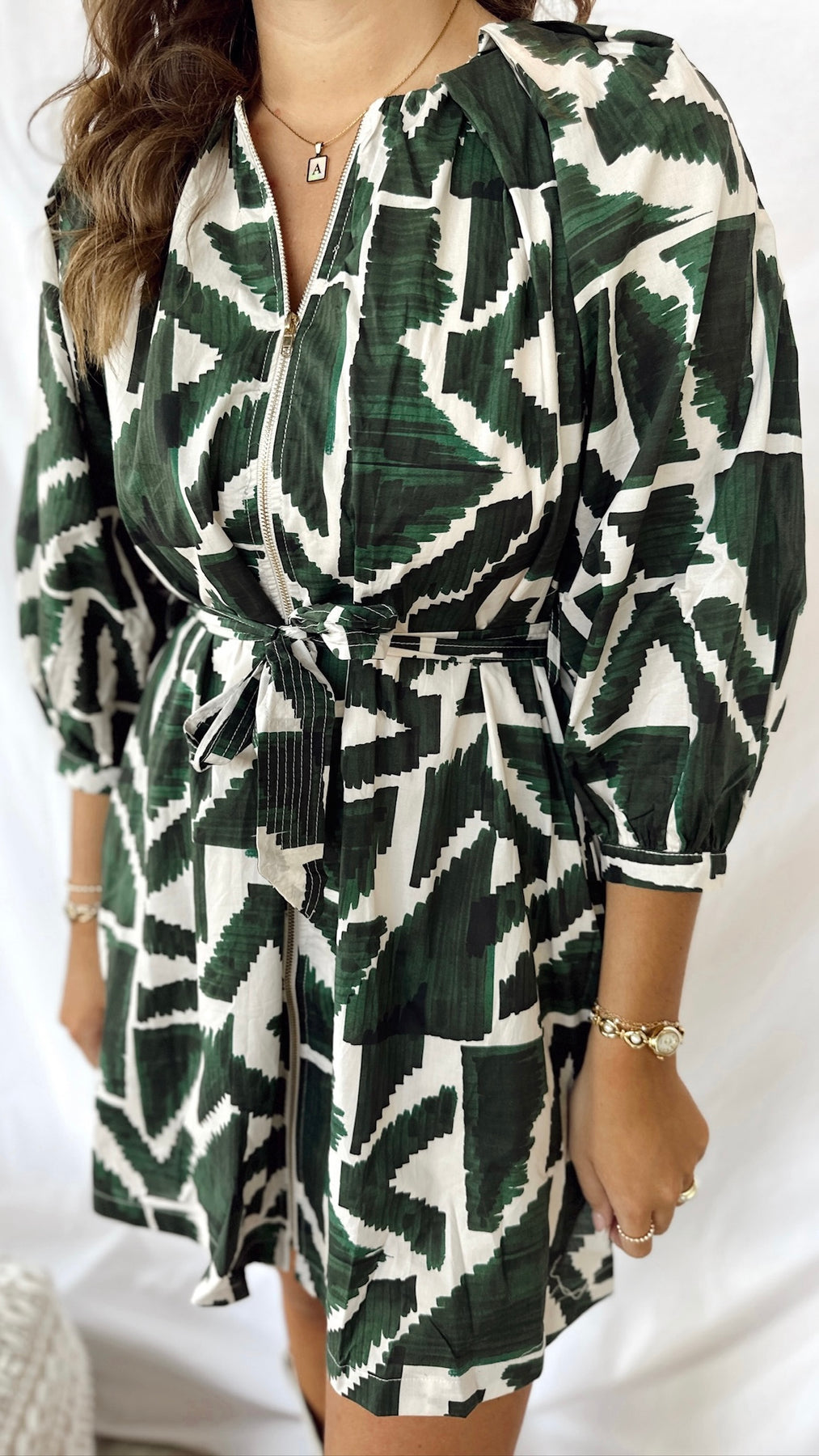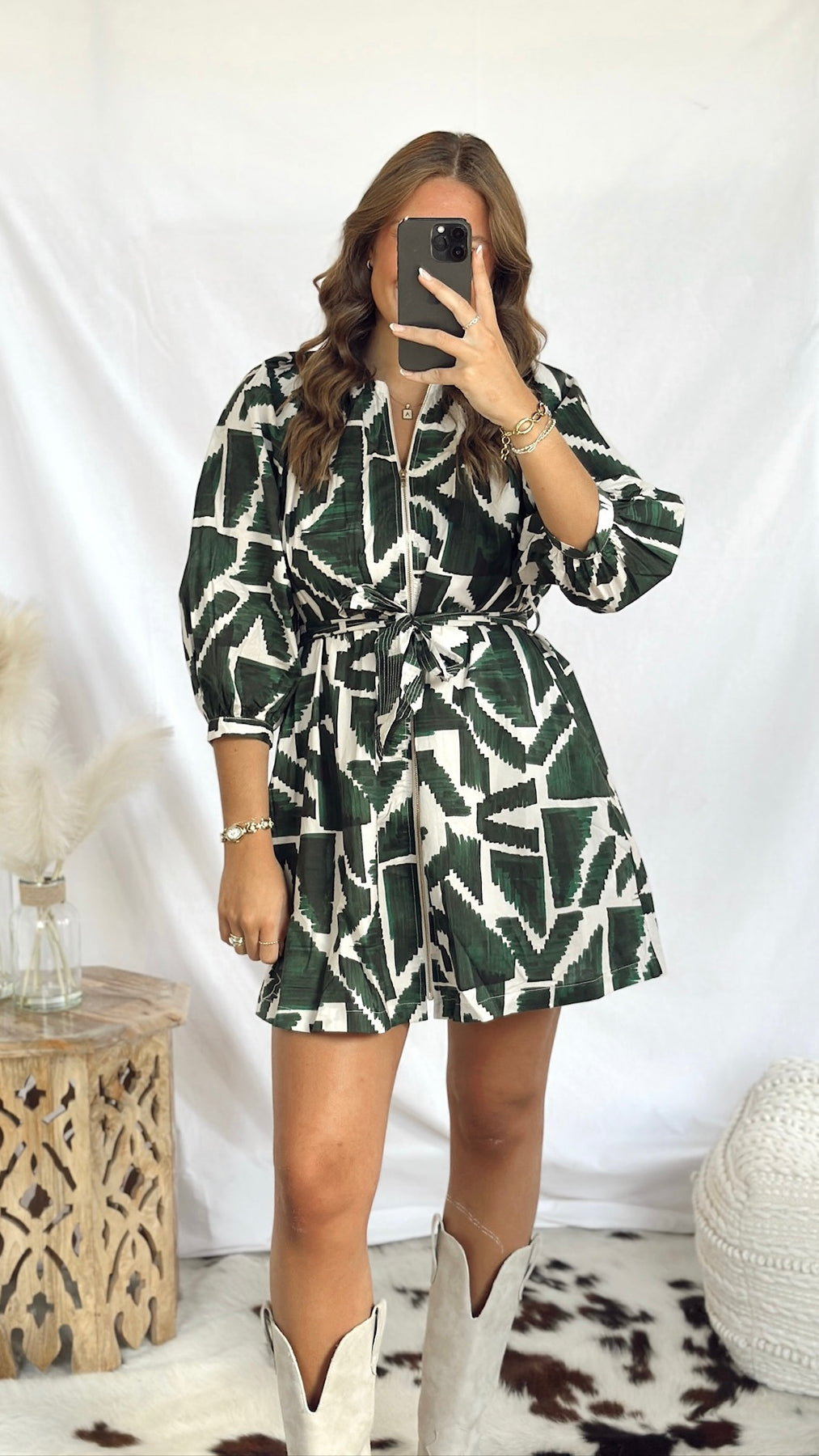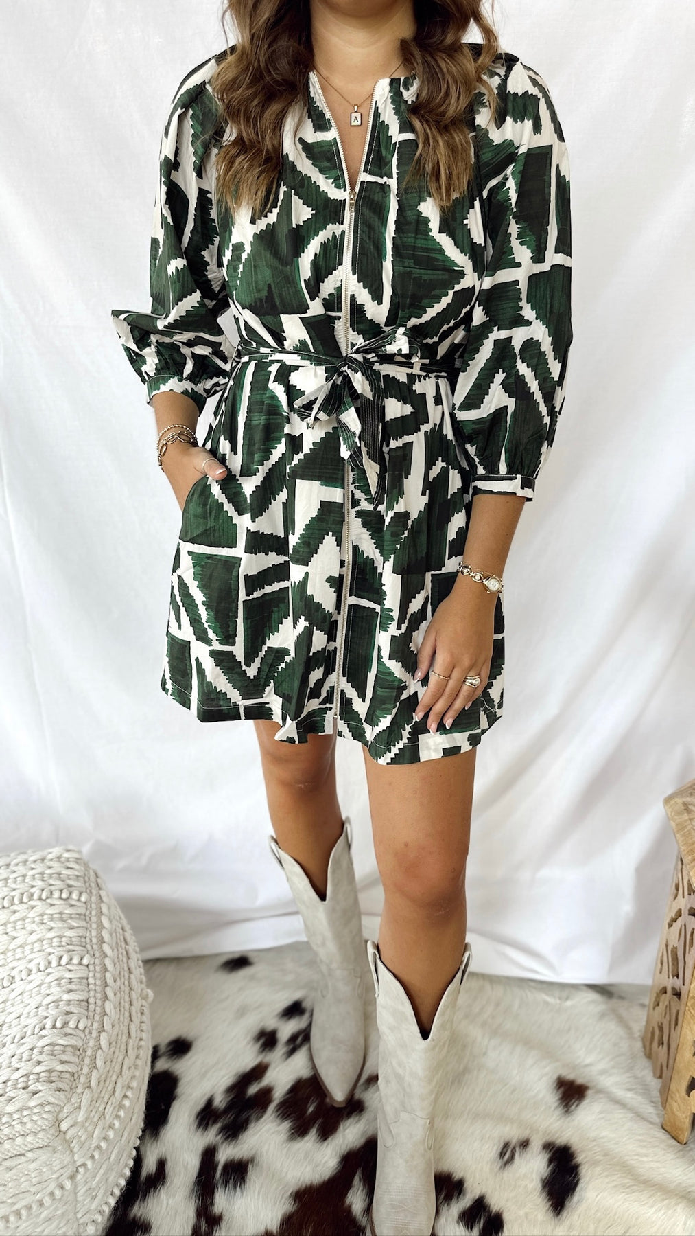 The Kara Dress features a playful green abstract pattern that adds a fresh, vibrant vibe to your wardrobe. Its flattering tie belt lets you customize the fit for comfort and style. Perfect for casual outings or dressy occasions, this dress combines fun design with easy wearability.