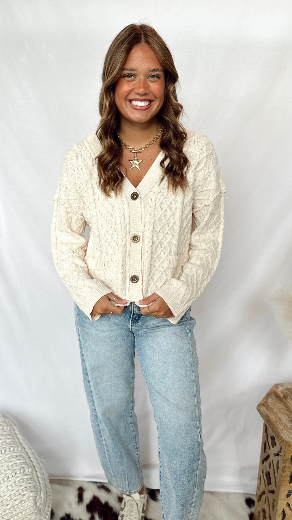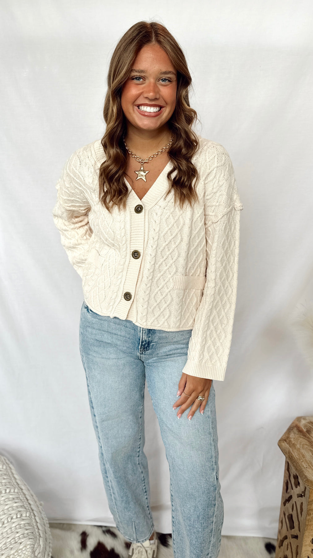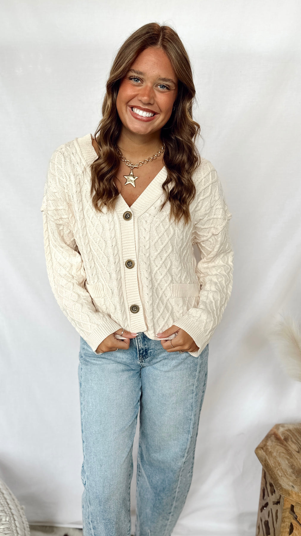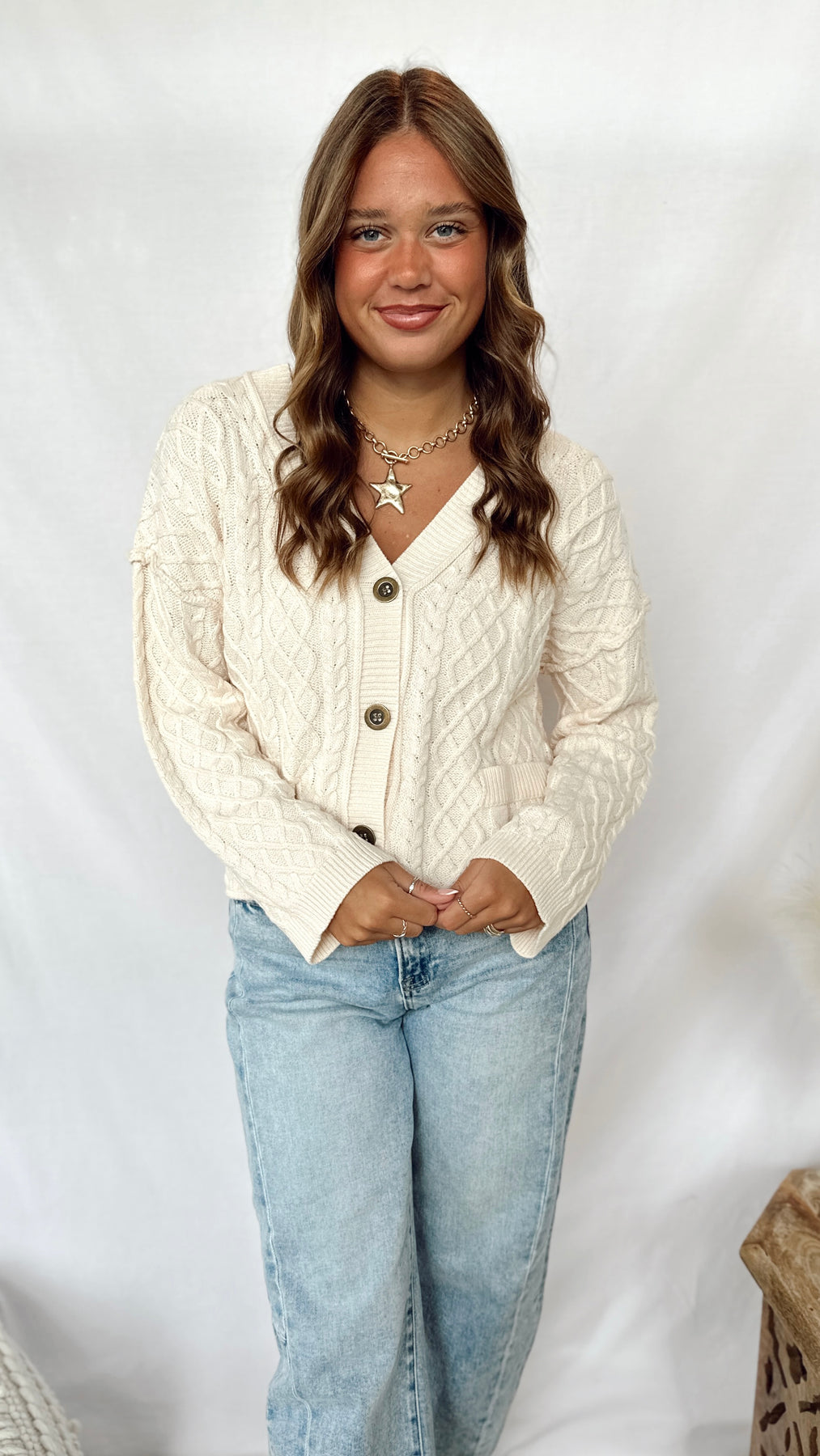 Cozy up in The Leigh Cardigan, featuring a soft cream color, a flattering V-neck, and charming cable knit details. Perfect for layering, it adds warmth and style to any outfit without fuss. Easy to love and even easier to wear!