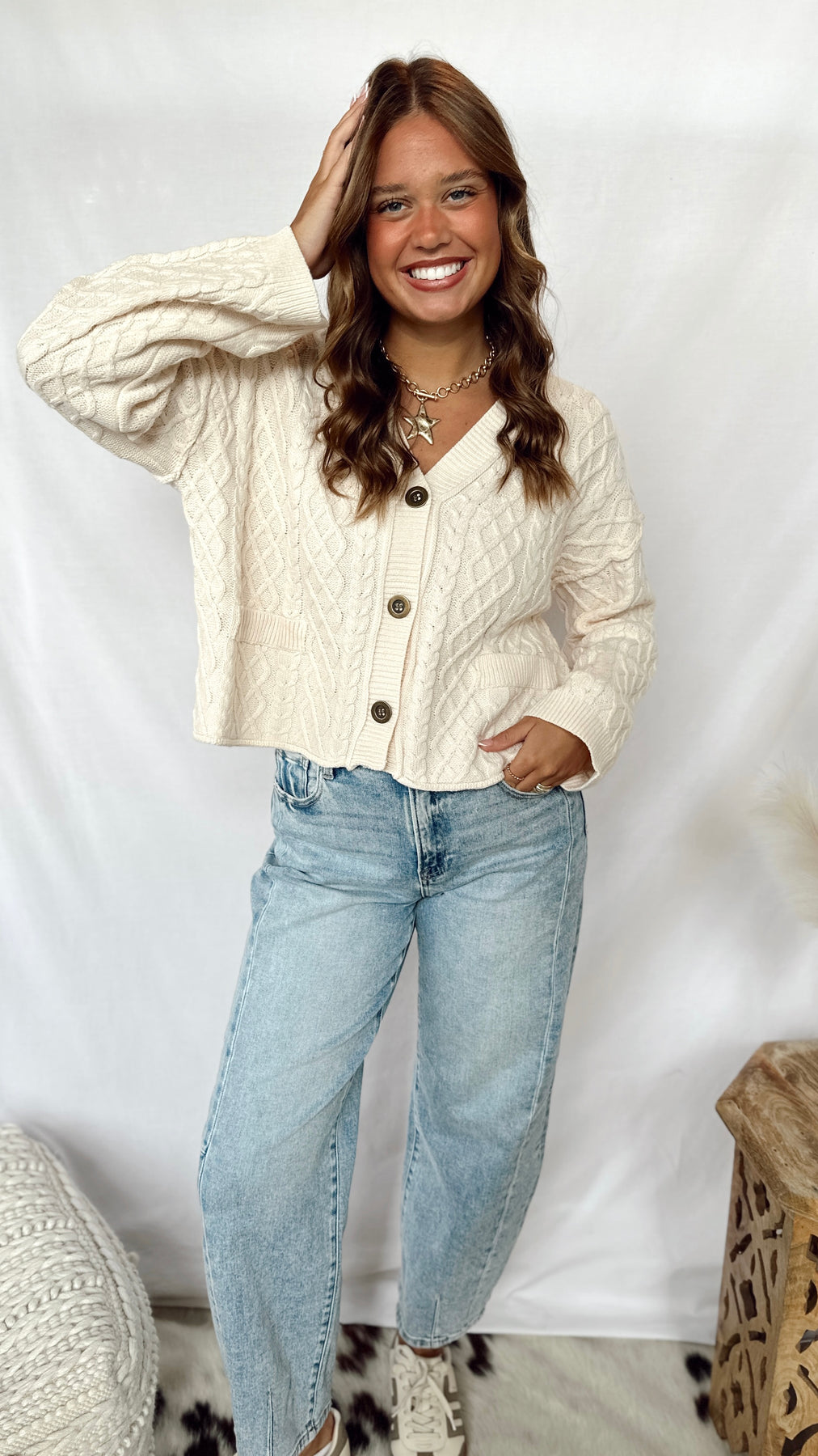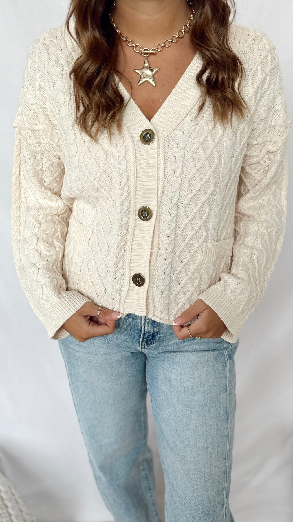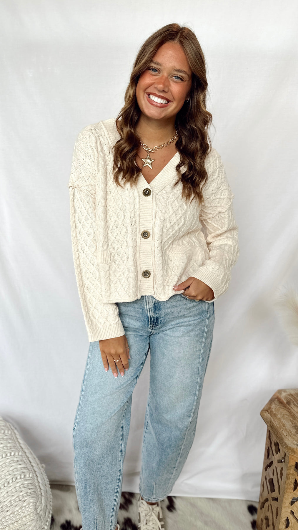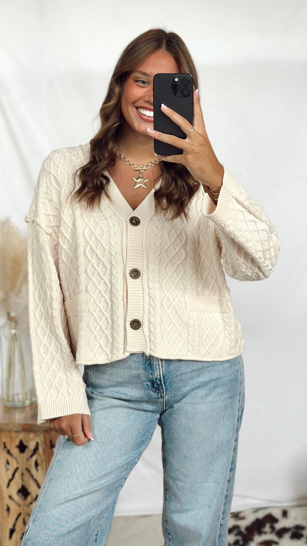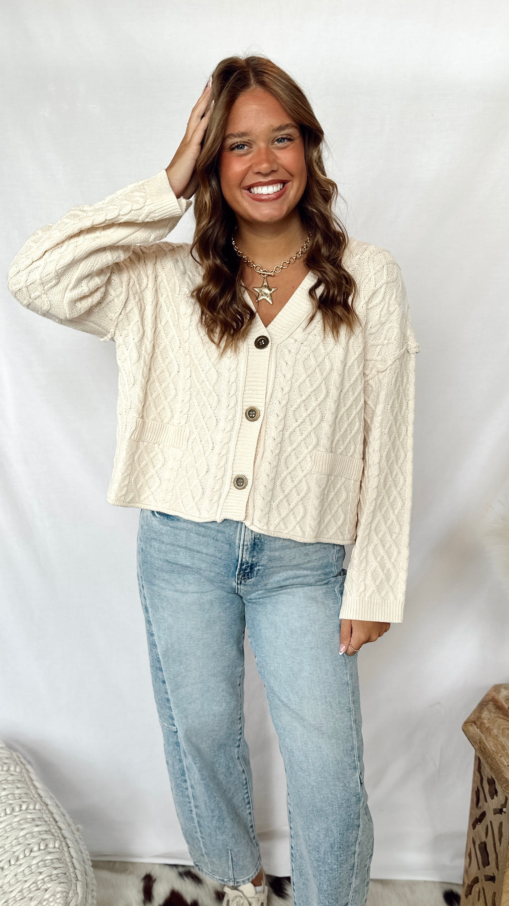 Cozy up in The Leigh Cardigan, featuring a soft cream color, a flattering V-neck, and charming cable knit details. Perfect for layering, it adds warmth and style to any outfit without fuss. Easy to love and even easier to wear!