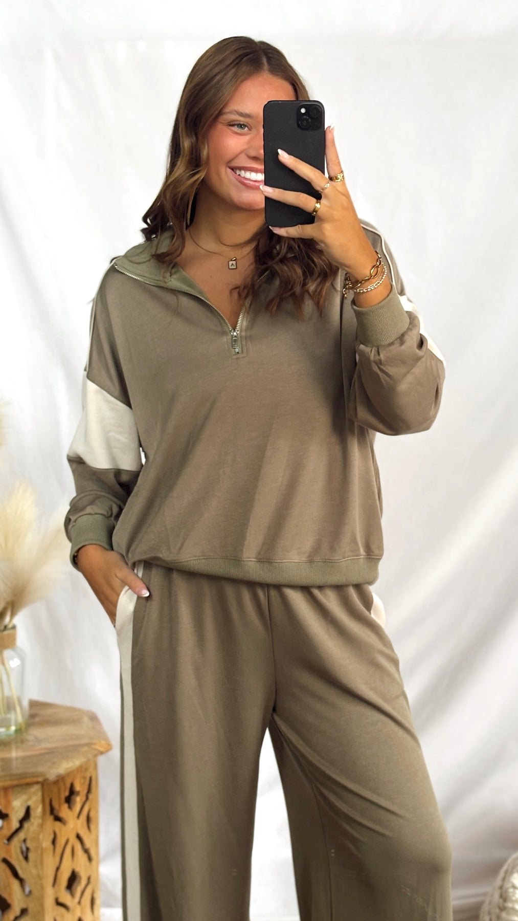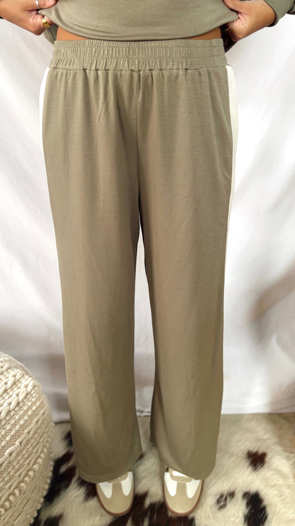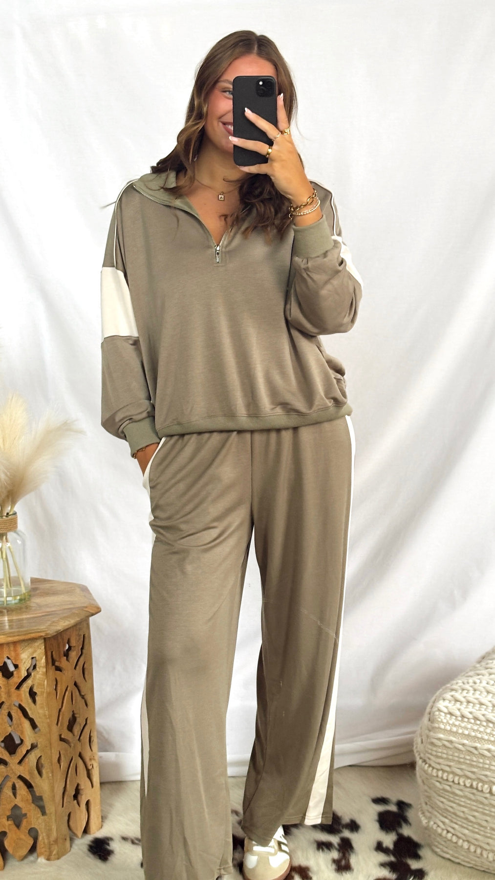 Stay cozy and stylish with The Mallory Set (sold separately), featuring a muted green sweatshirt and matching sweatpants accented by crisp white stripes. Perfect for lounging or casual outings, this set combines comfort with a sporty vibe for effortless everyday wear.