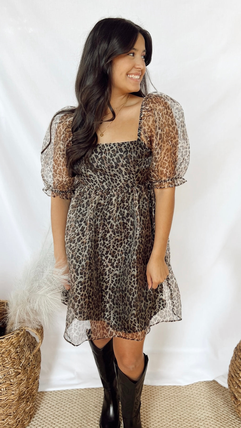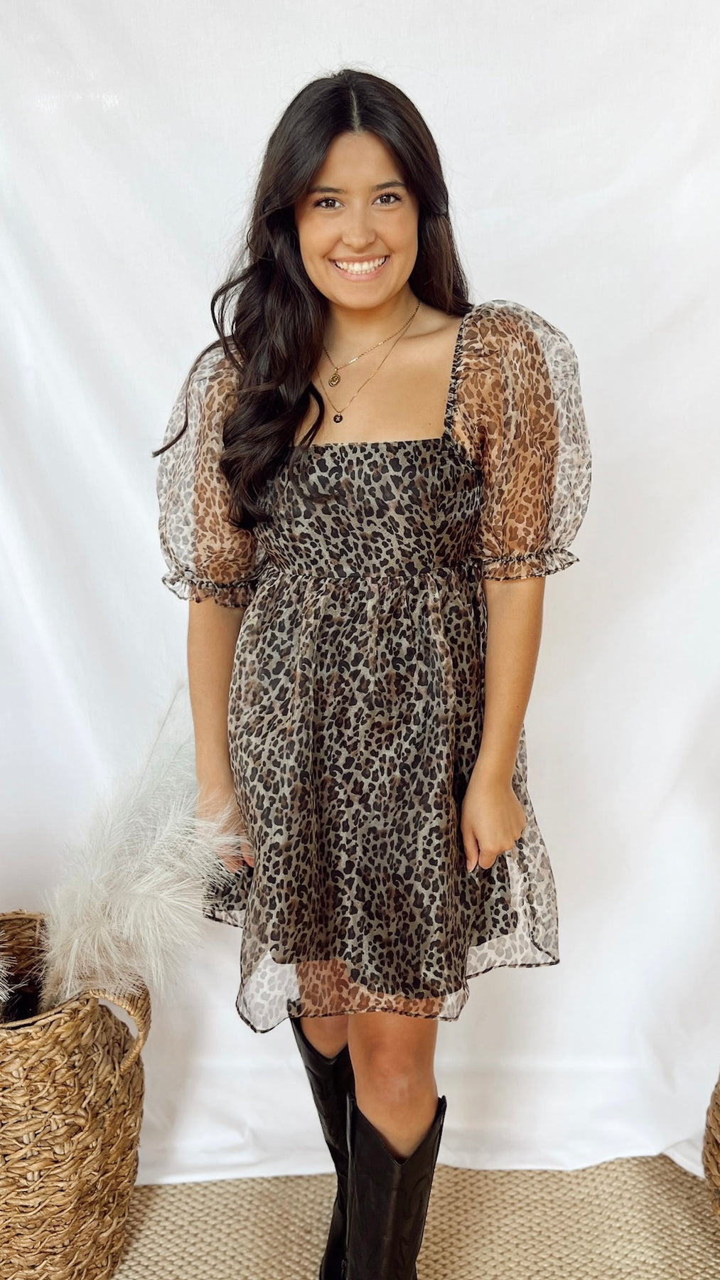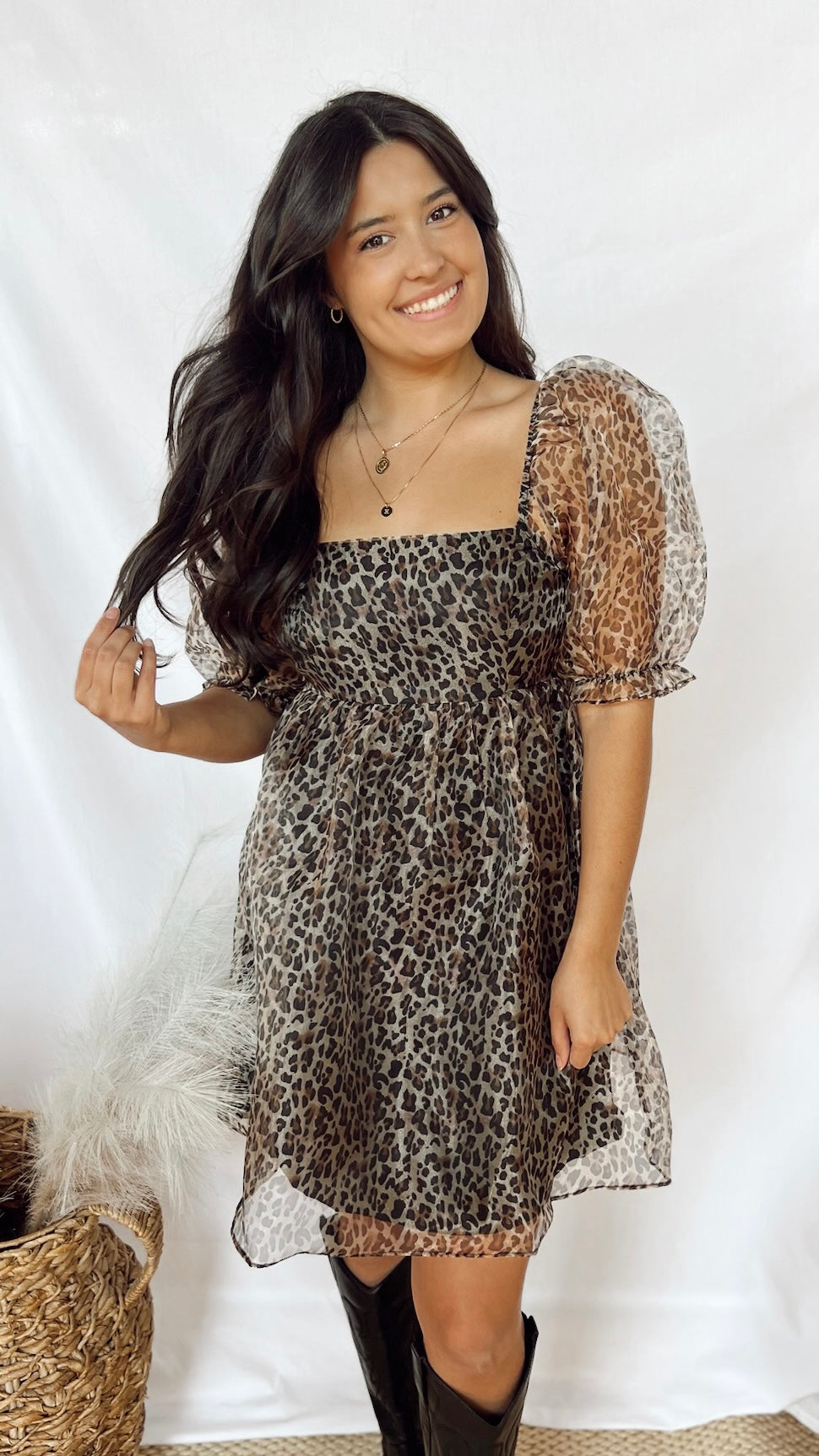 Unleash your wild side with The Leo Dress. This playful dress features a fierce leopard print and trendy puff sleeves, perfect for adding a touch of fun to any outfit. Embrace your inner fashionista and stand out in style with this statement piece.