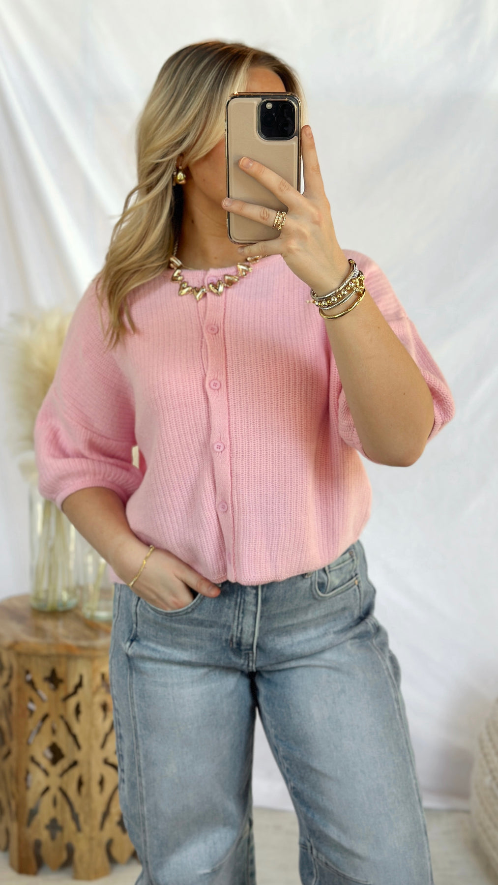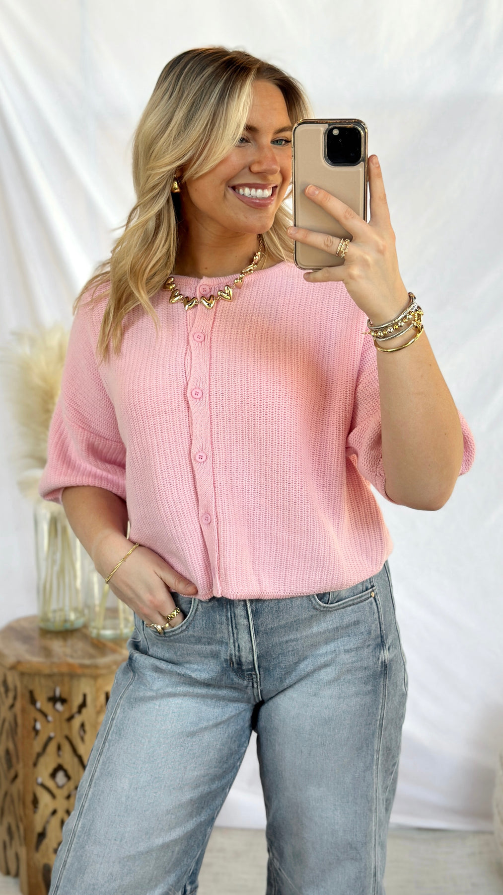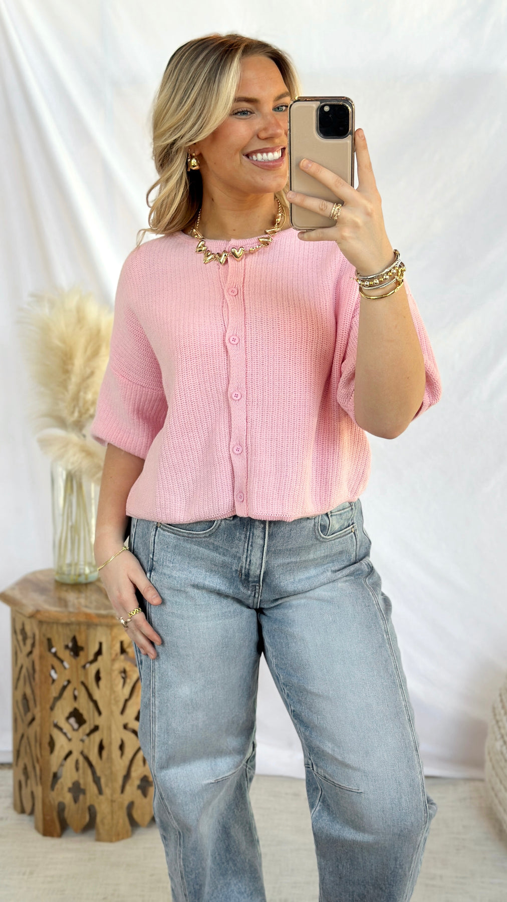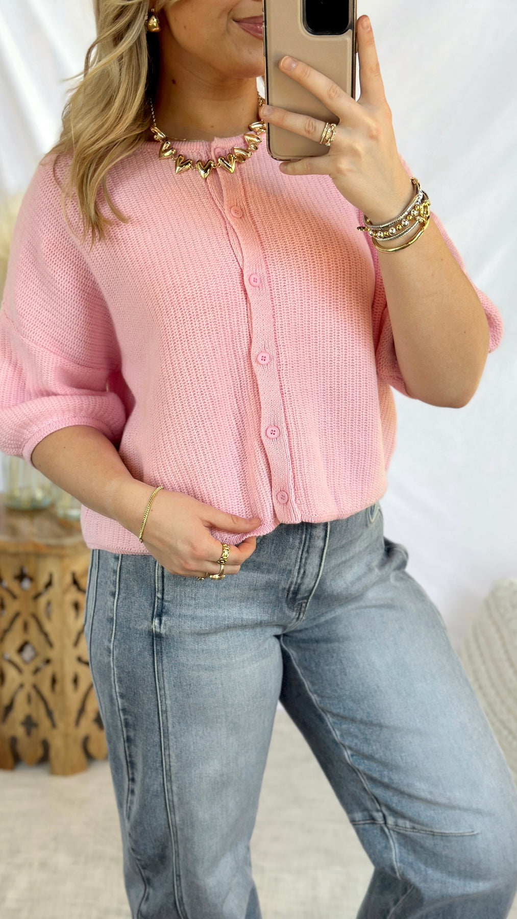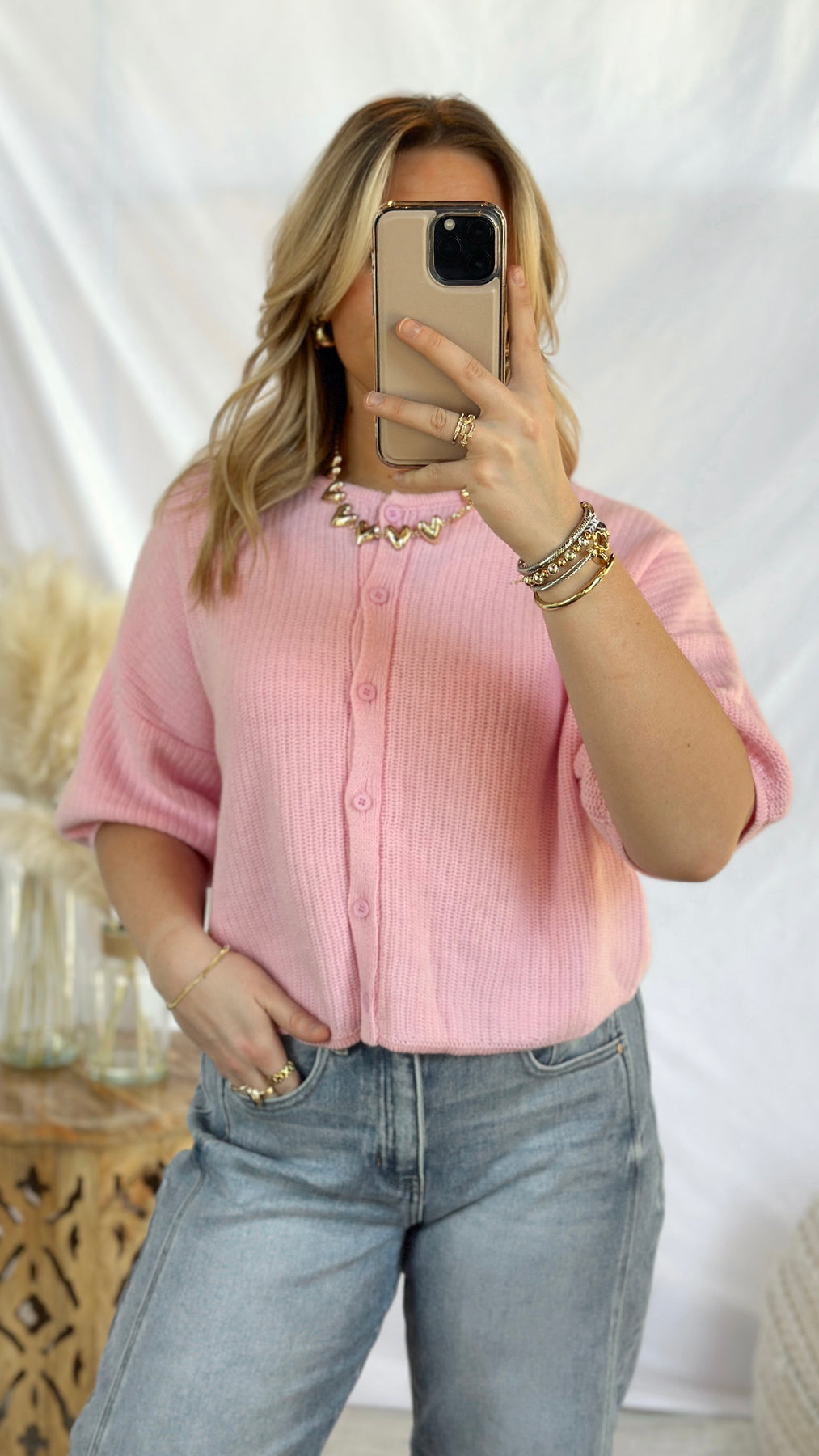 Bubblegum pink knit short sleeve cardigan.