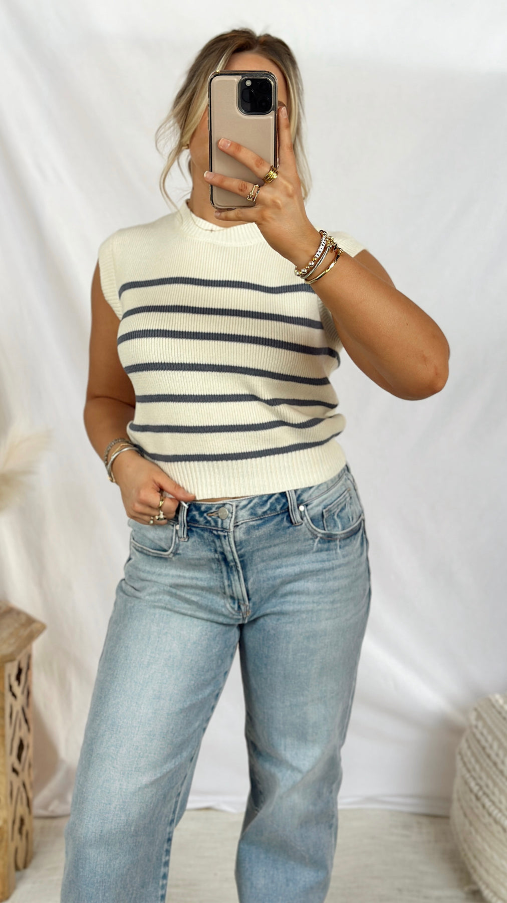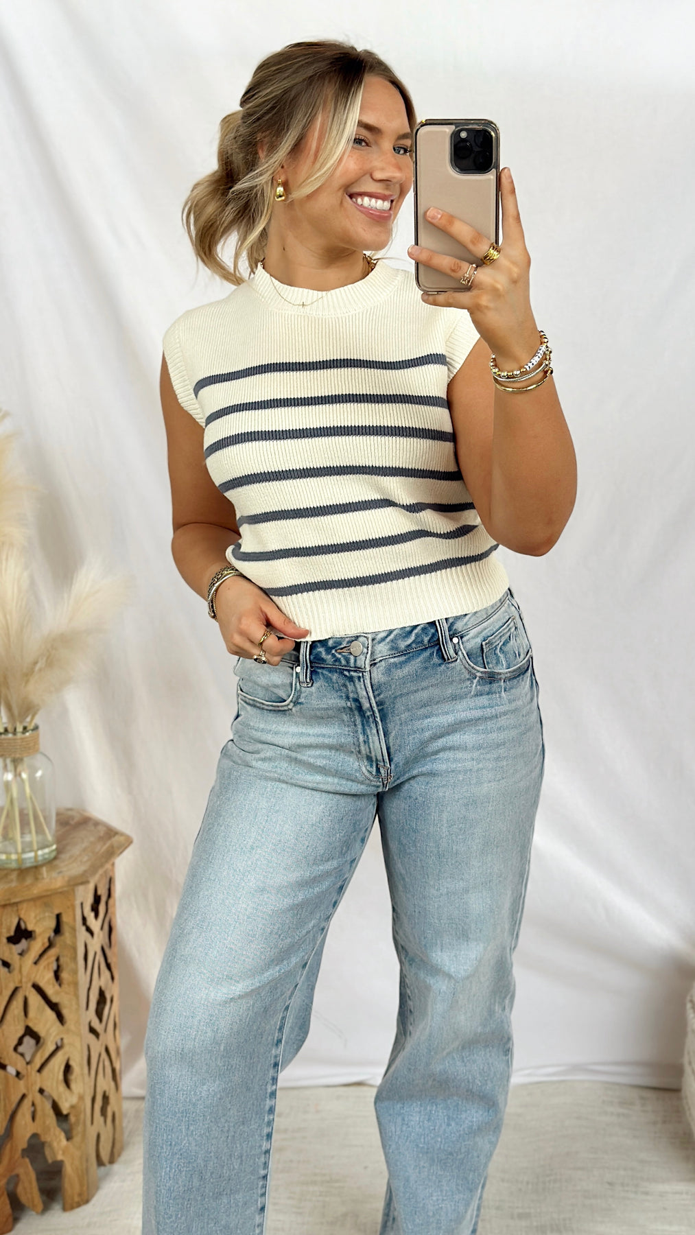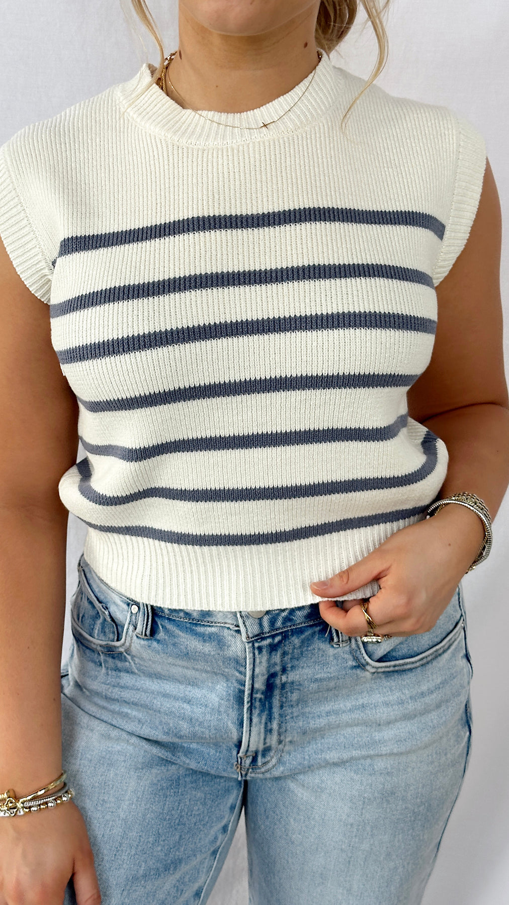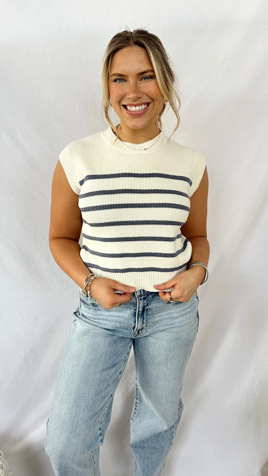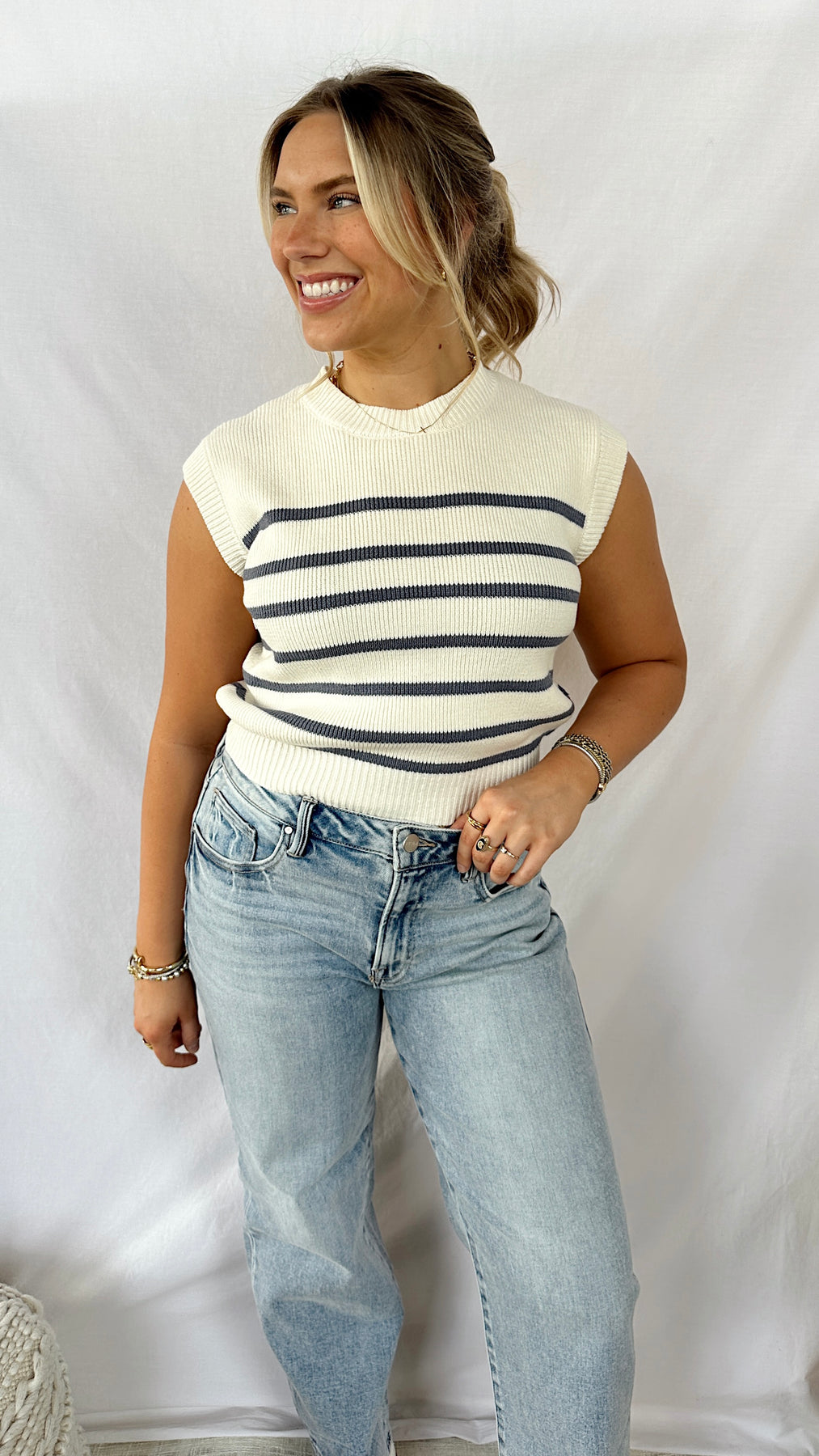 This striped sweater top features a classic pattern that pairs with everything in your closet—dress it up with tailored trousers or keep it casual with your favorite jeans.