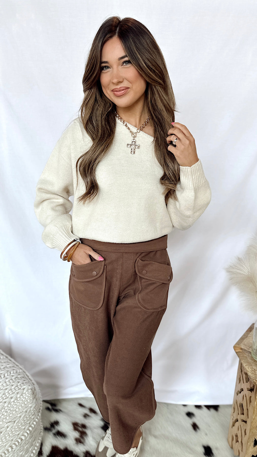 Stay cozy and stylish in the Evalie Sweater. This long-sleeve cream knit features a playful off-the-shoulder design that adds a fun twist to your casual look. Perfect for layering or wearing on its own, it’s an easy go-to for cooler days with a touch of effortless flair.