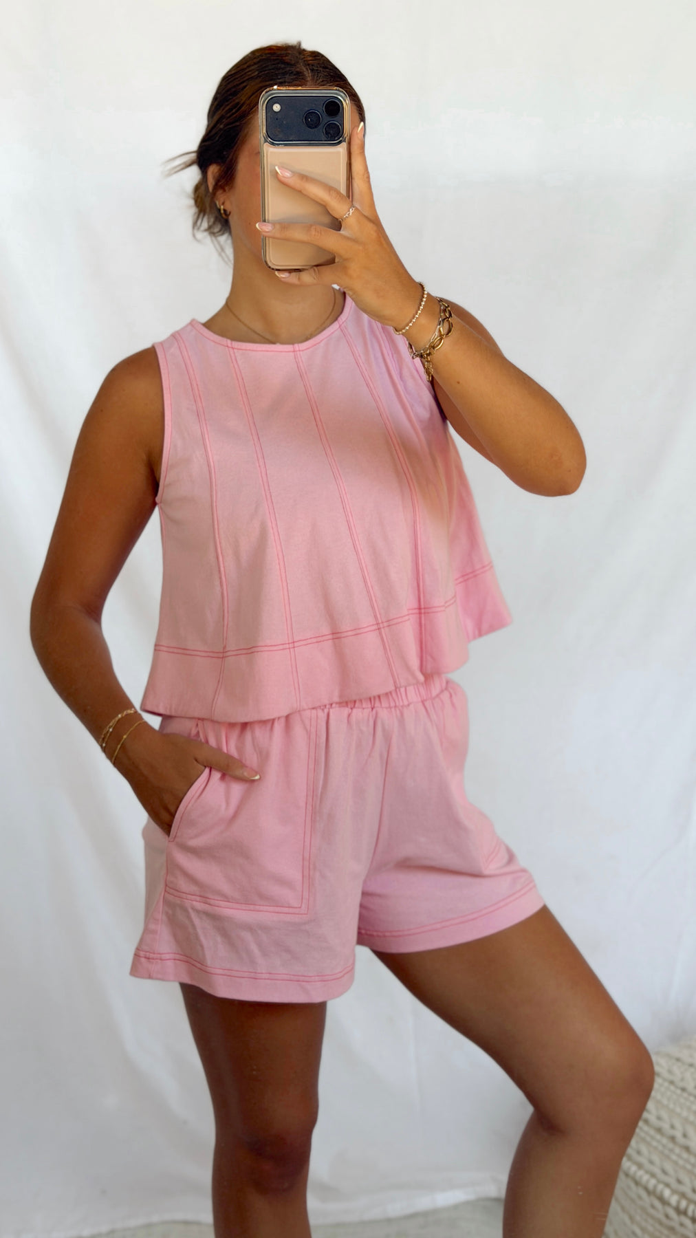 Sleeveless relaxed top with contrast line stitch. Pairs perfectly with our Fiona Shorts.