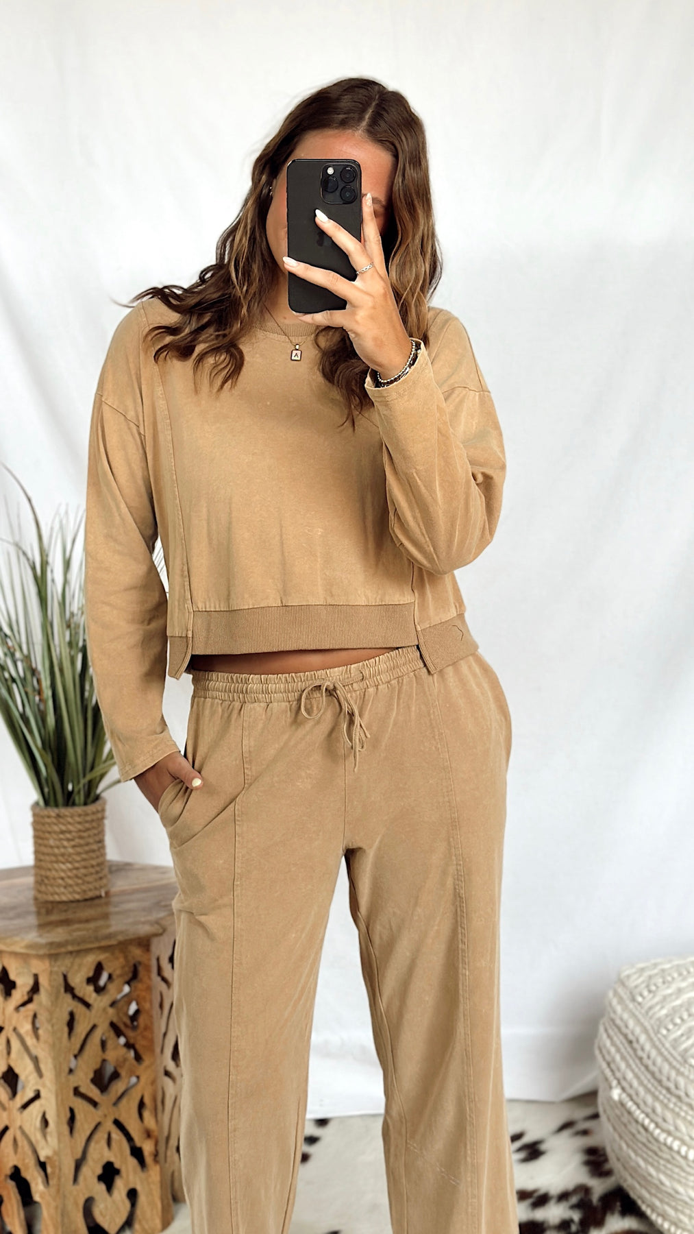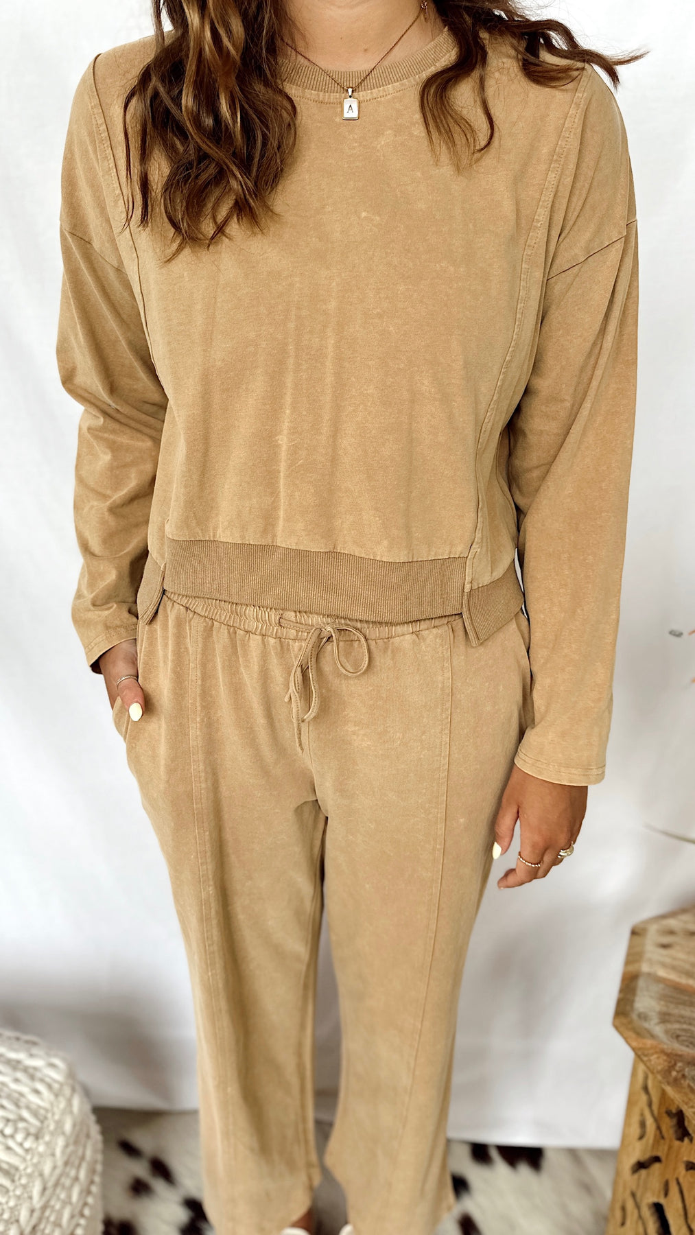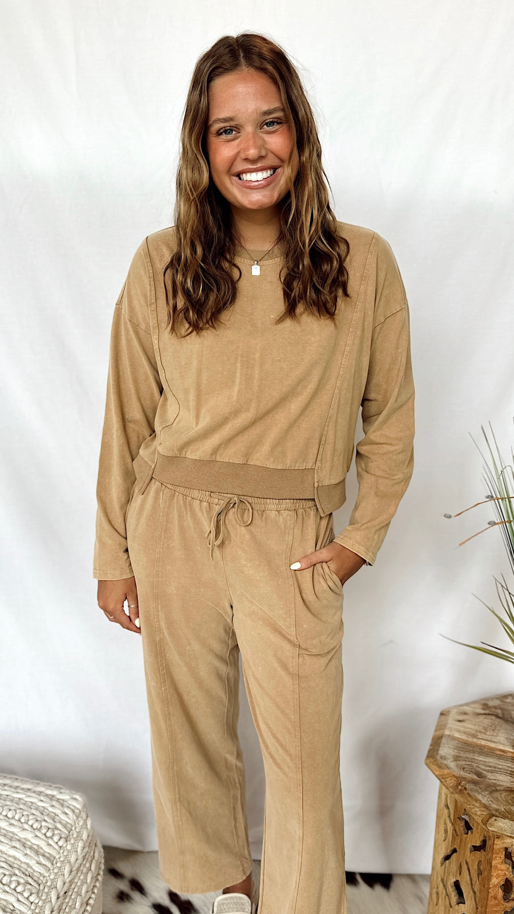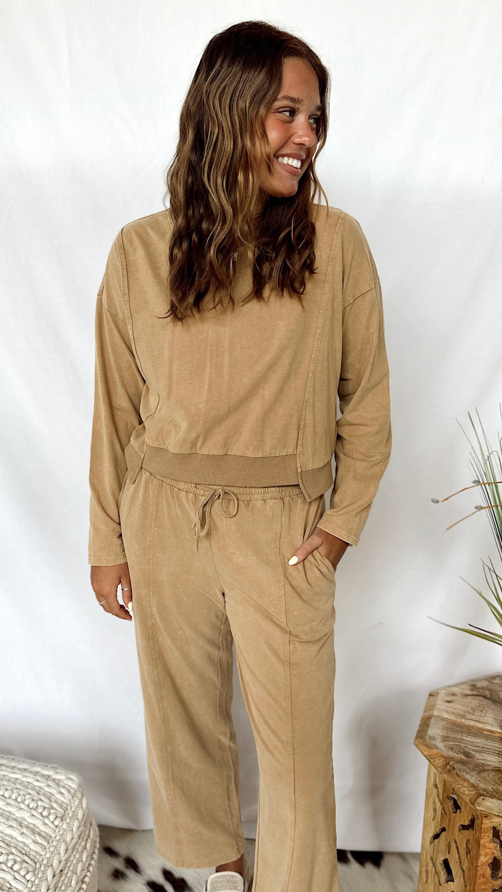 The Granola Girl Top is a cozy cropped sweatshirt in a soft taupe wash. Its long sleeves and relaxed fit make it perfect for laid-back days or layering.