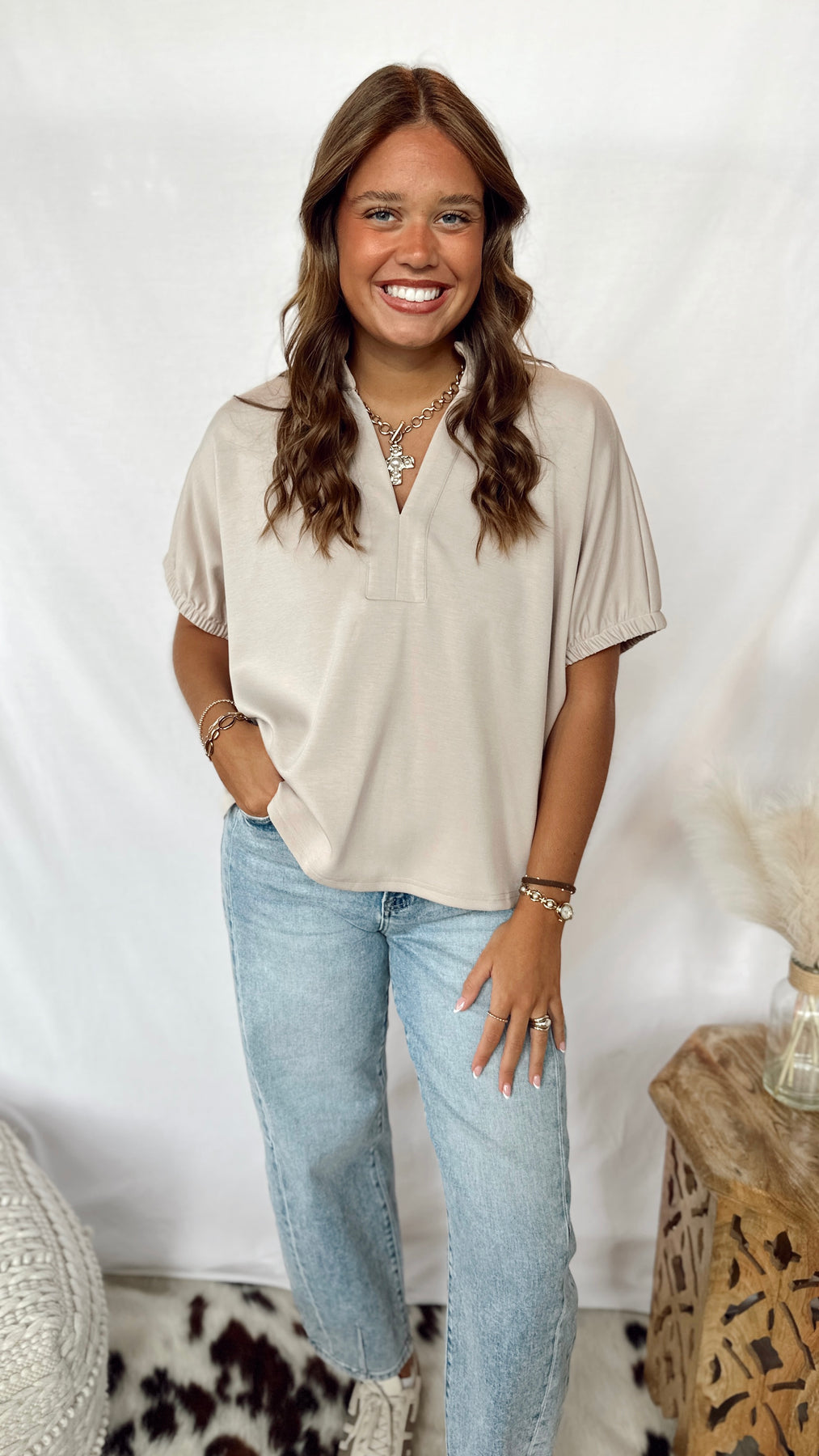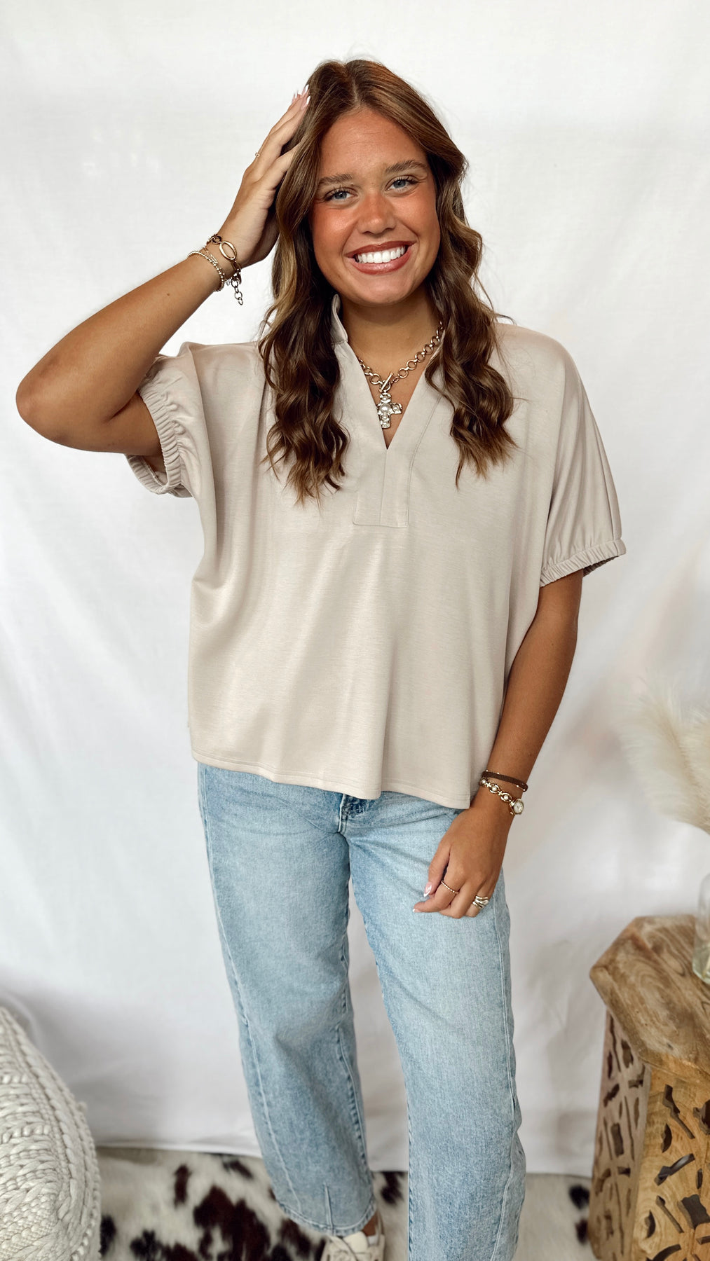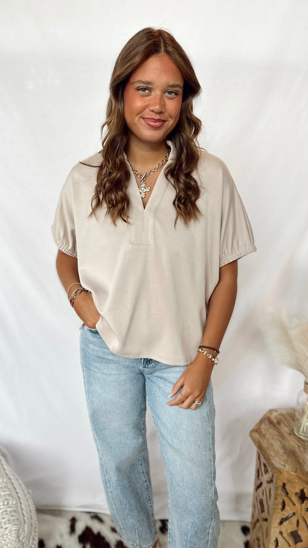 The Grayson Top in a soft almond tan features a flattering V-neck and comfy elastic sleeves, making it perfect for effortless style all day. Its gentle color and easy fit add a relaxed vibe to any outfit.