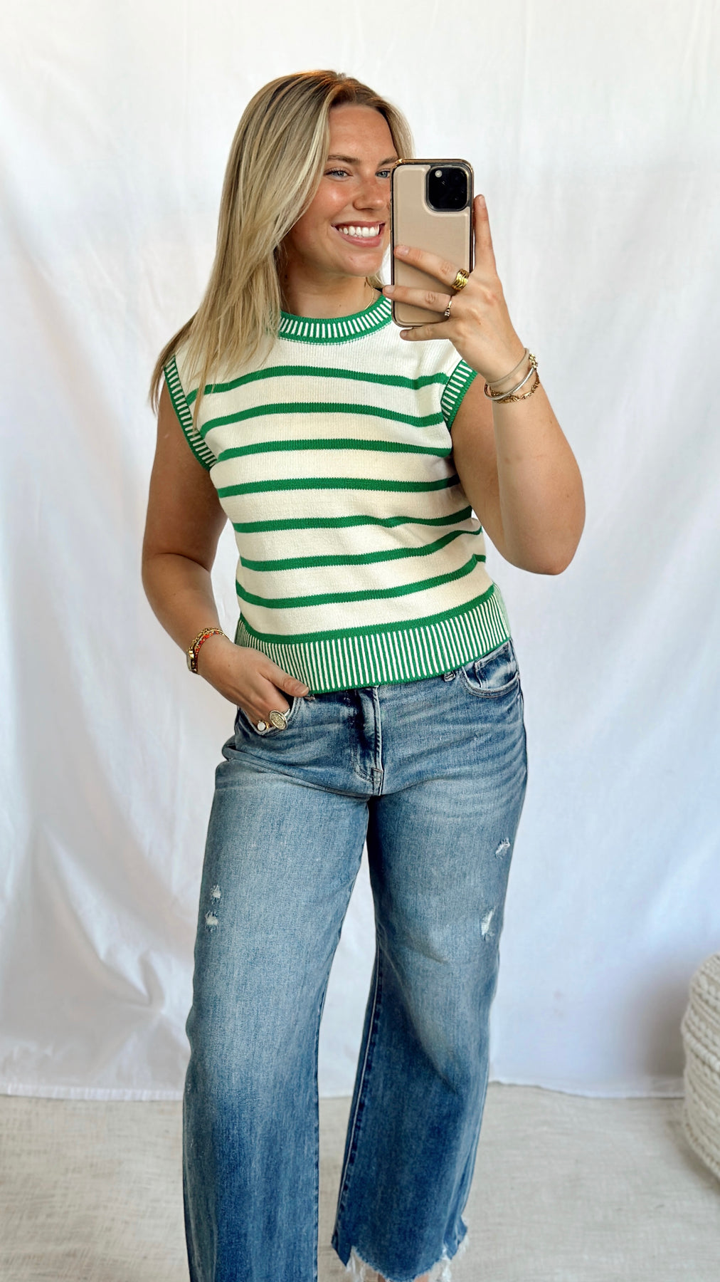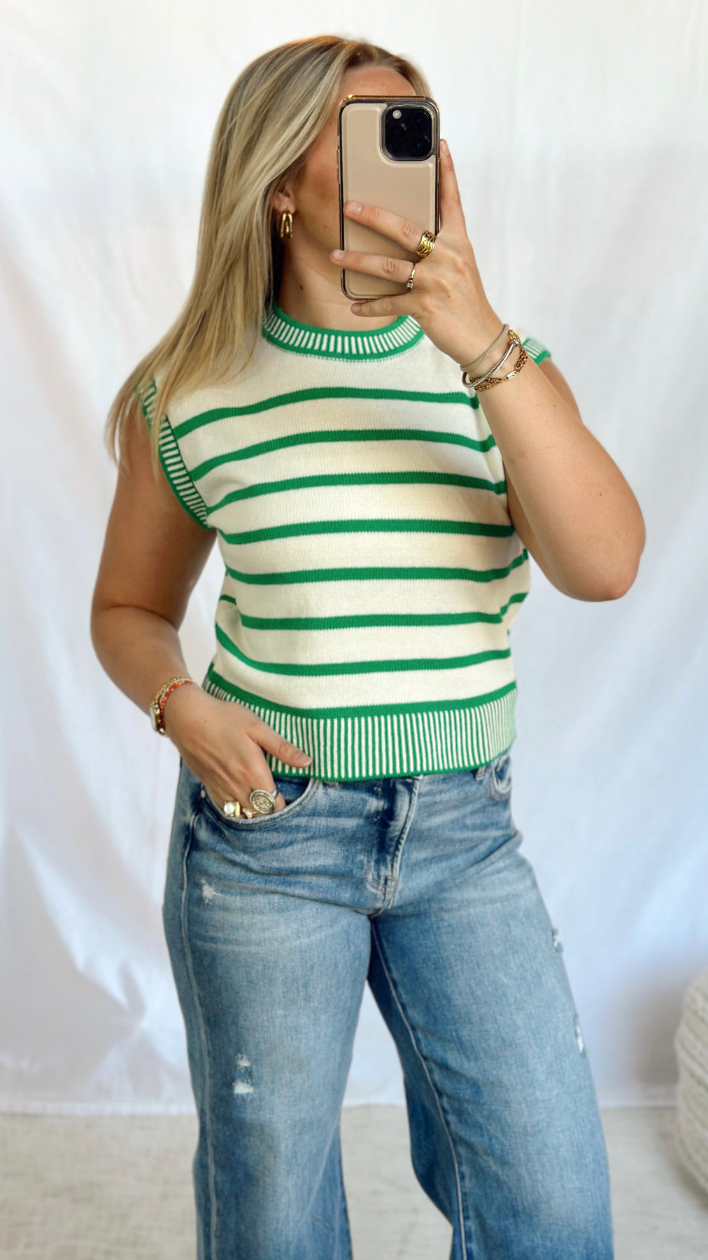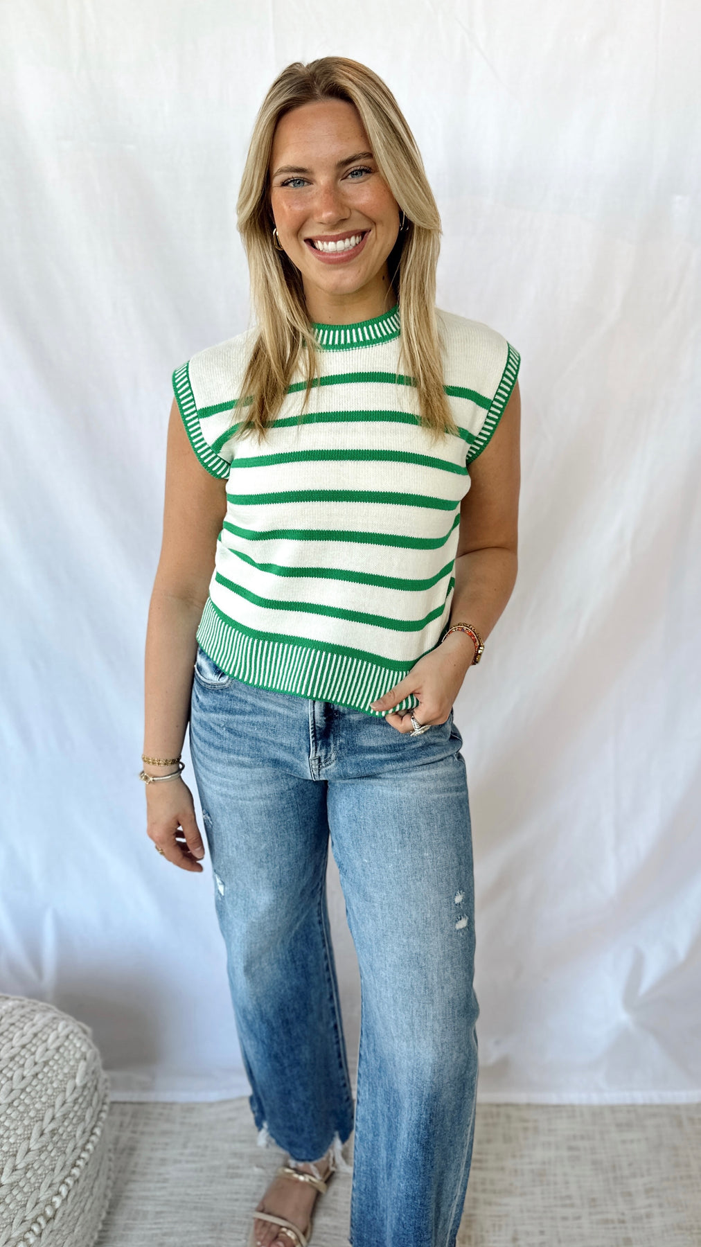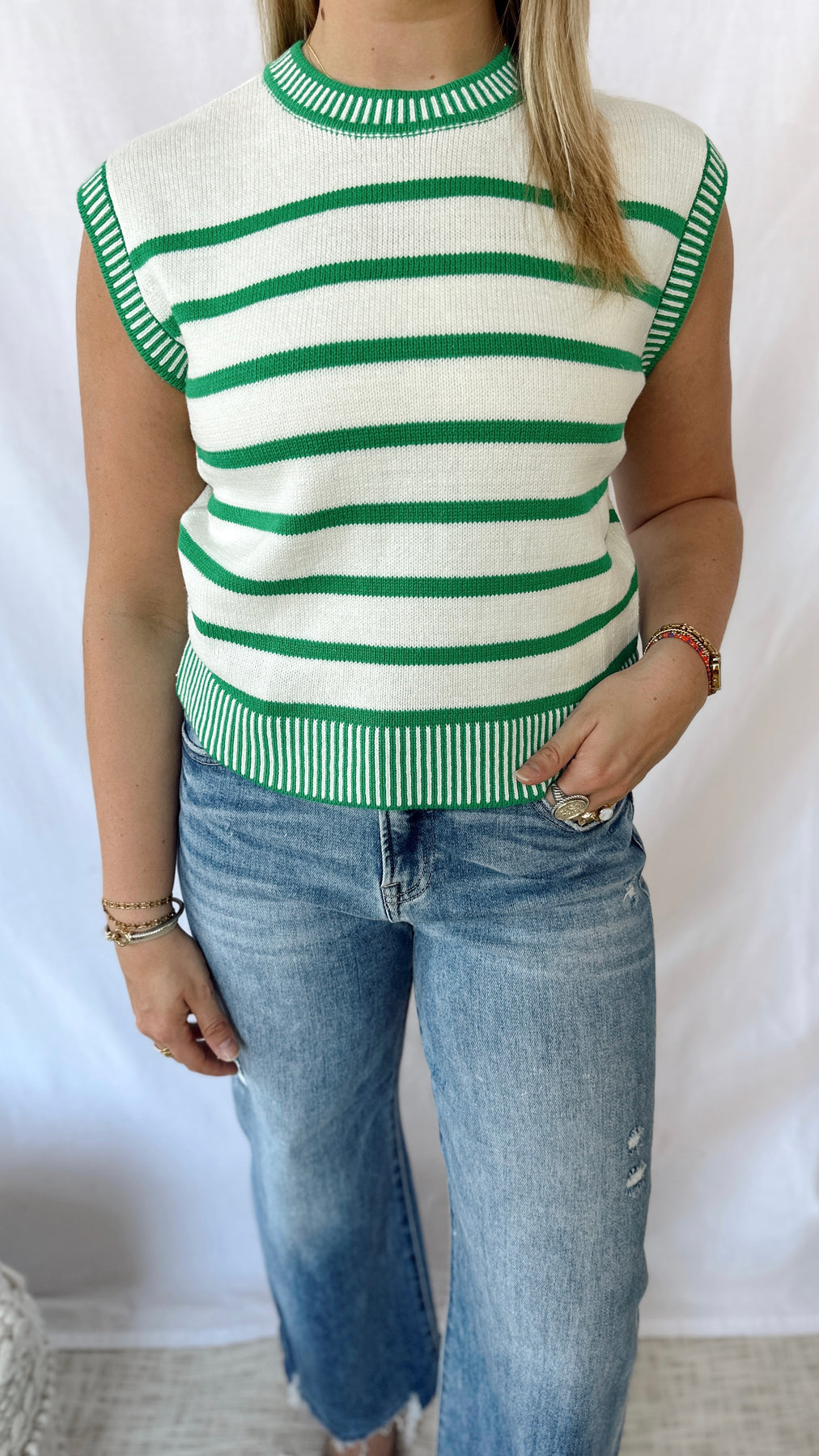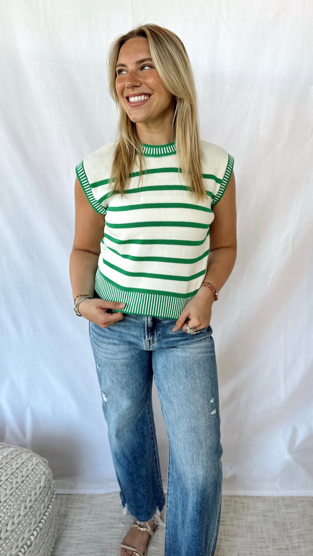 Green and off white striped sweater top.