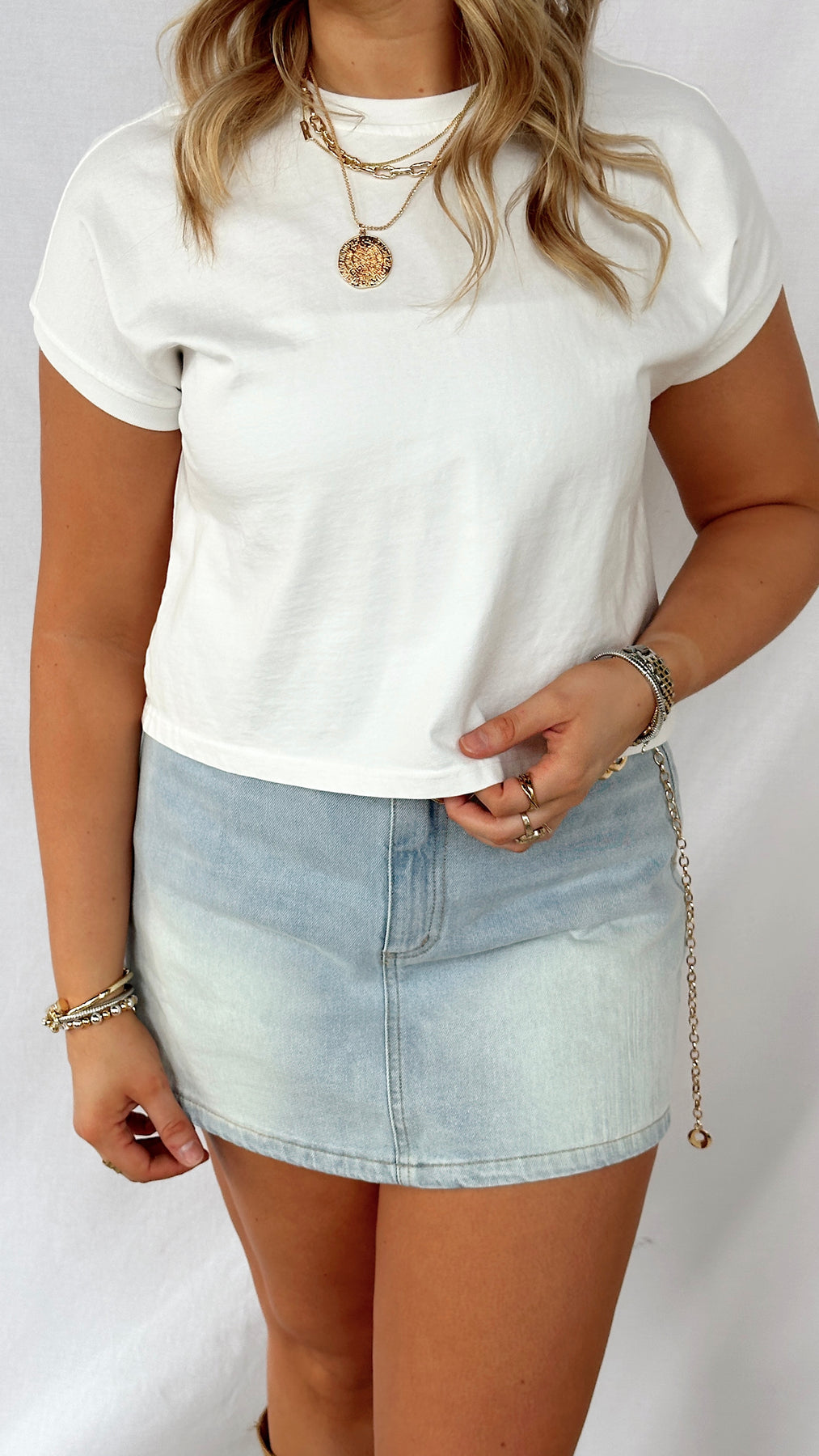 White t-shirt with capped sleeves.