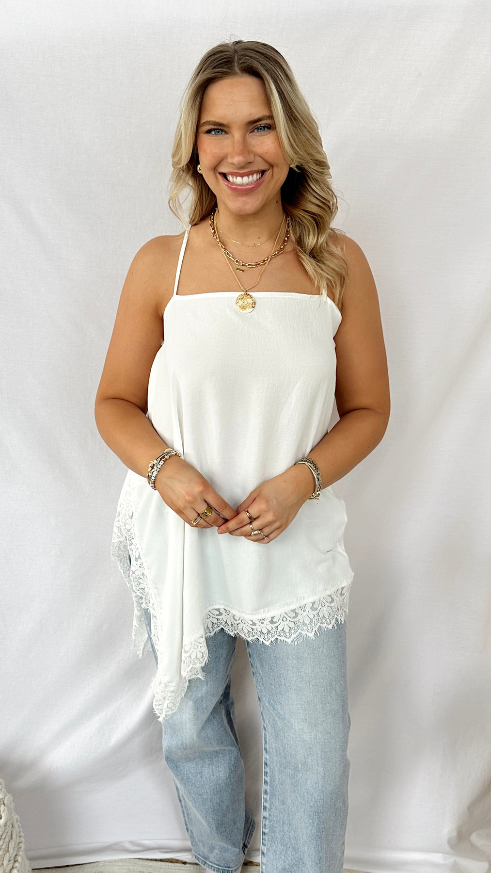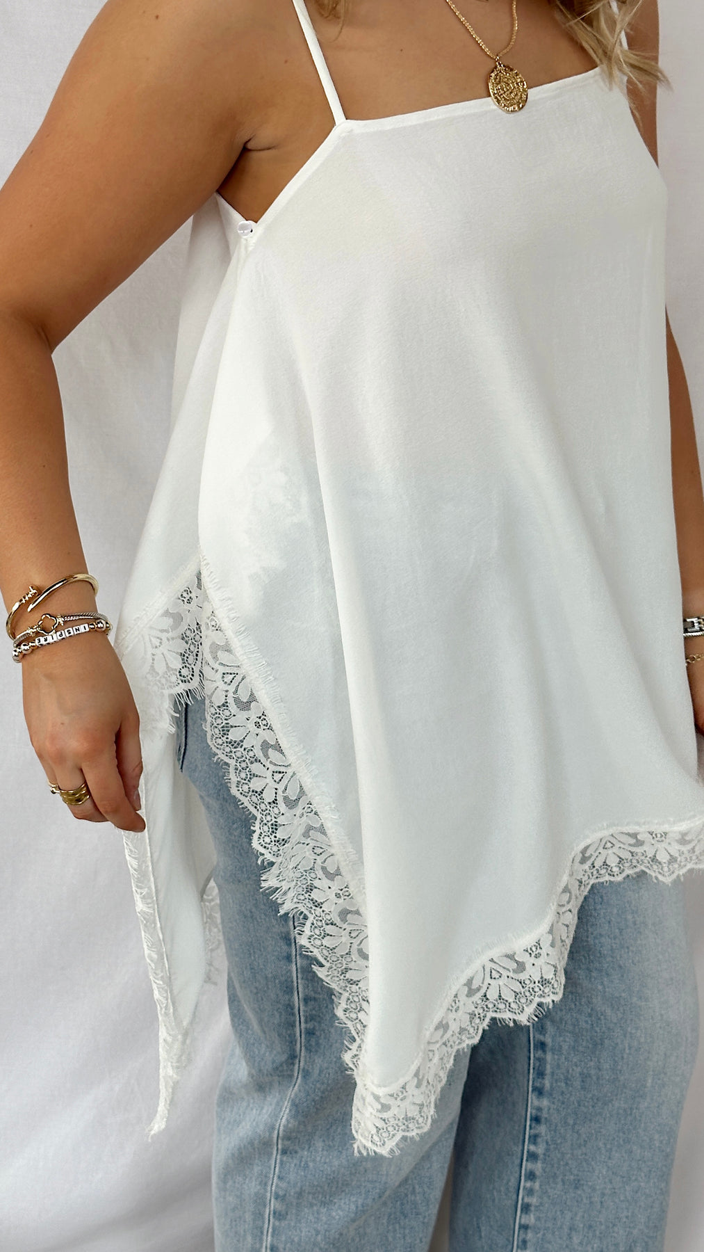 White asymmetrical tank top with lace trim.