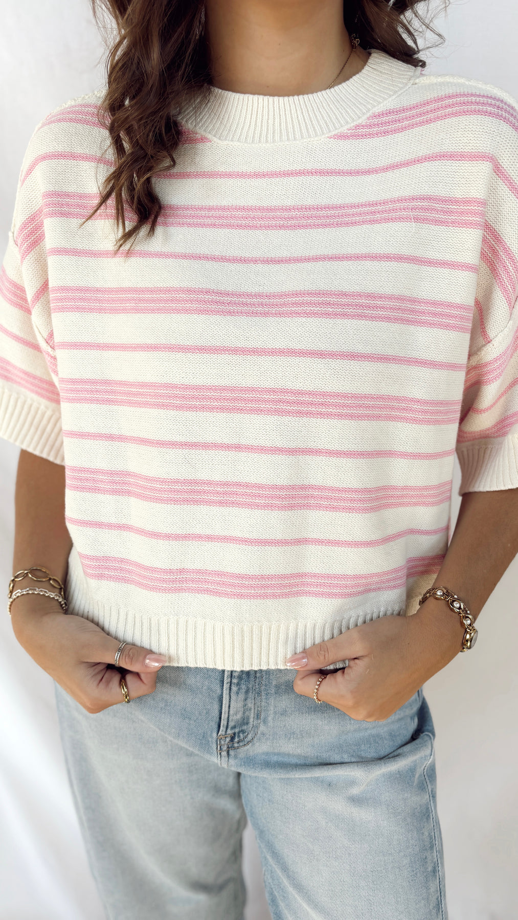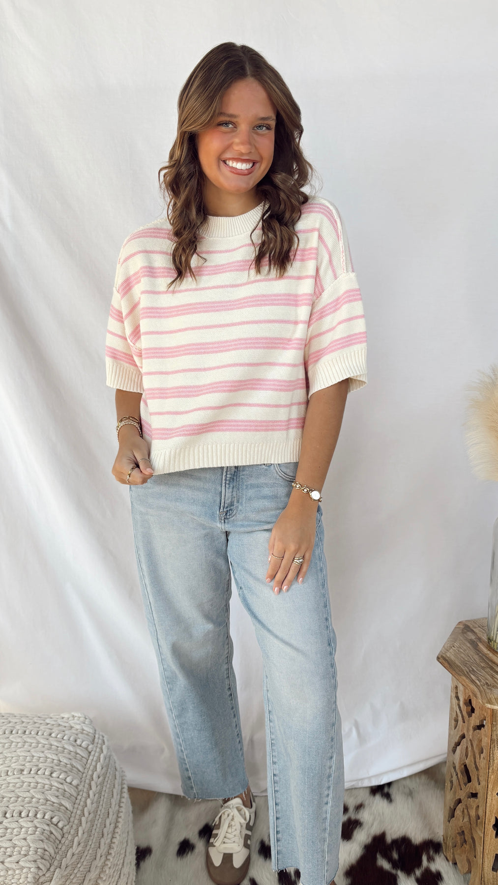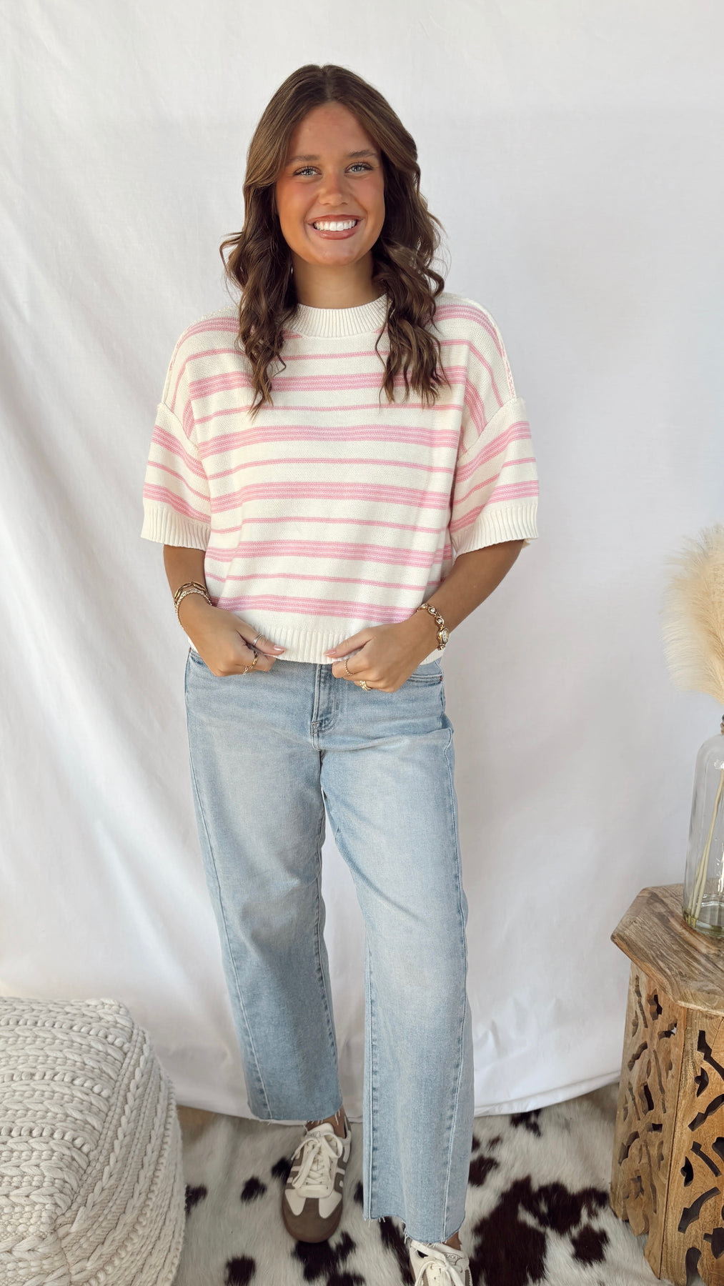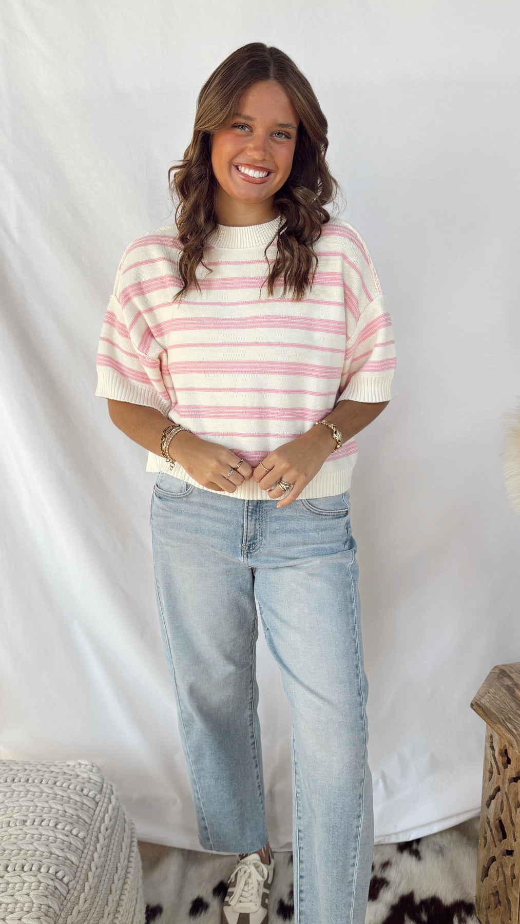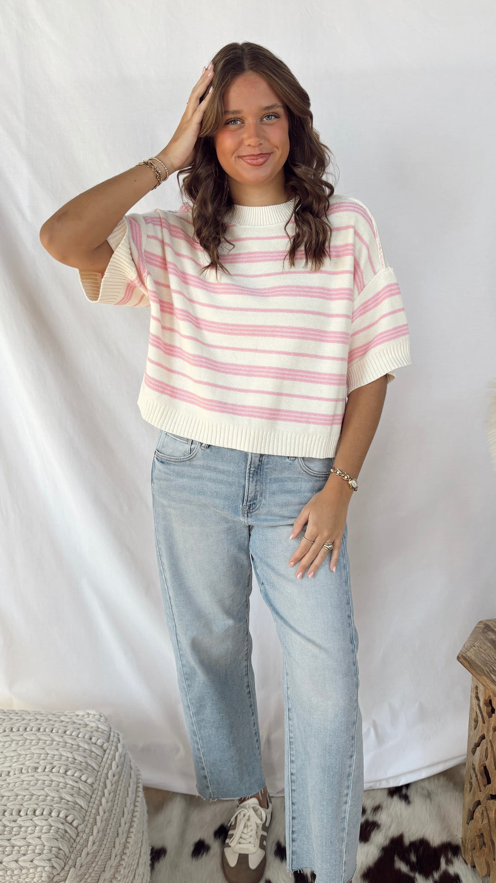 The Take Your Time Top is your new go-to for effortless style. This cream and pink striped sweater top pairs perfectly with everything in your closet—dress it up with tailored trousers or keep it casual with your favorite jeans.