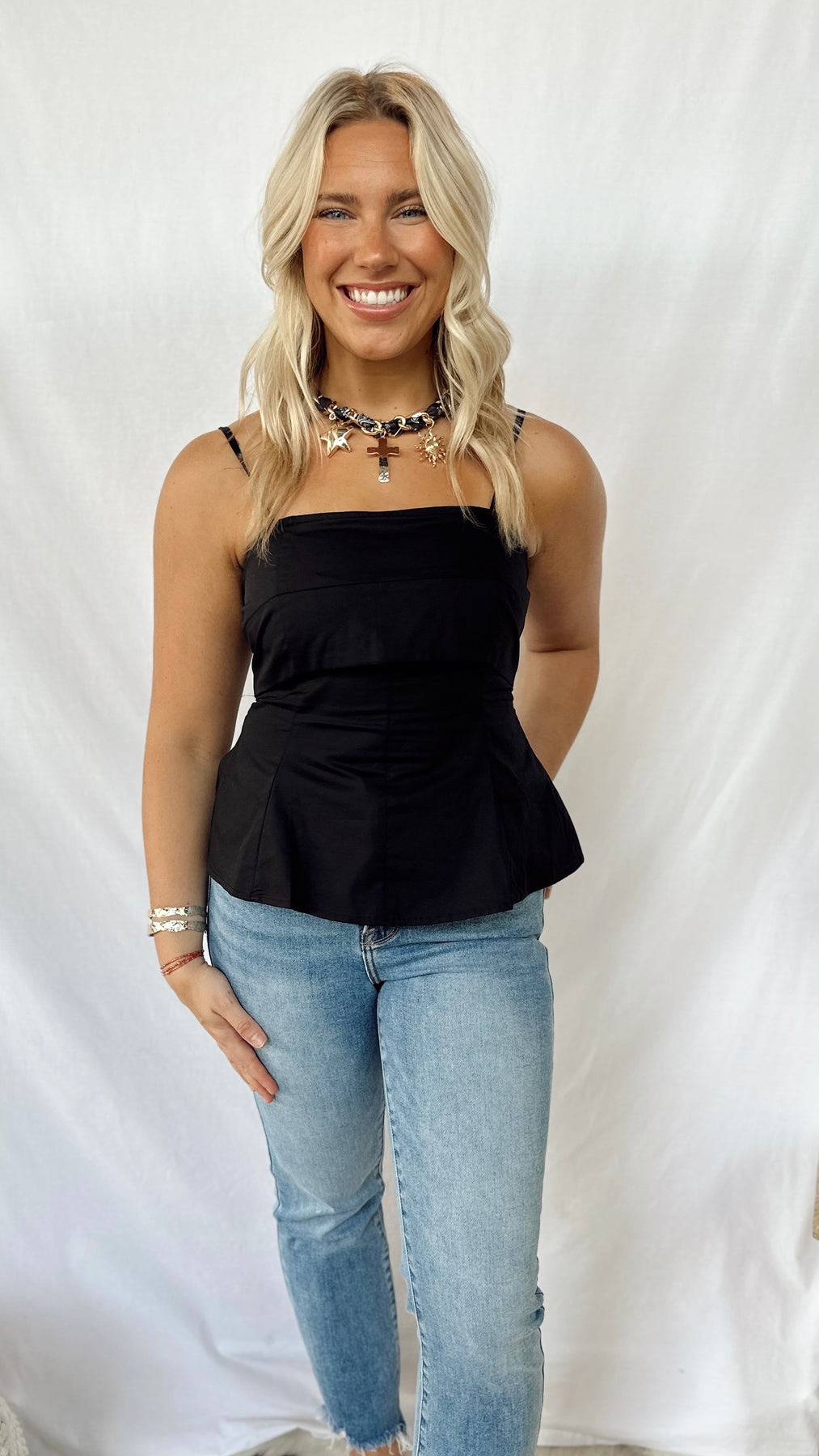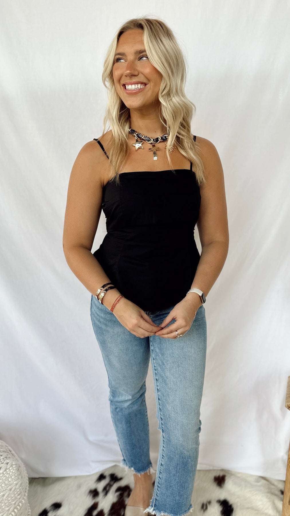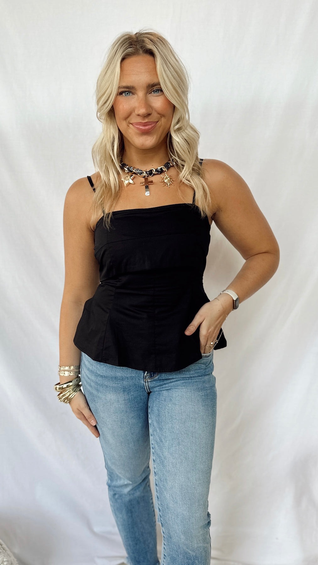 This fun and simple black top features adjustable straps for a perfect fit. Its sleek design makes it a versatile piece, easy to dress up or down for any occasion. Lightweight and comfortable, it’s ideal for effortless style all day long.