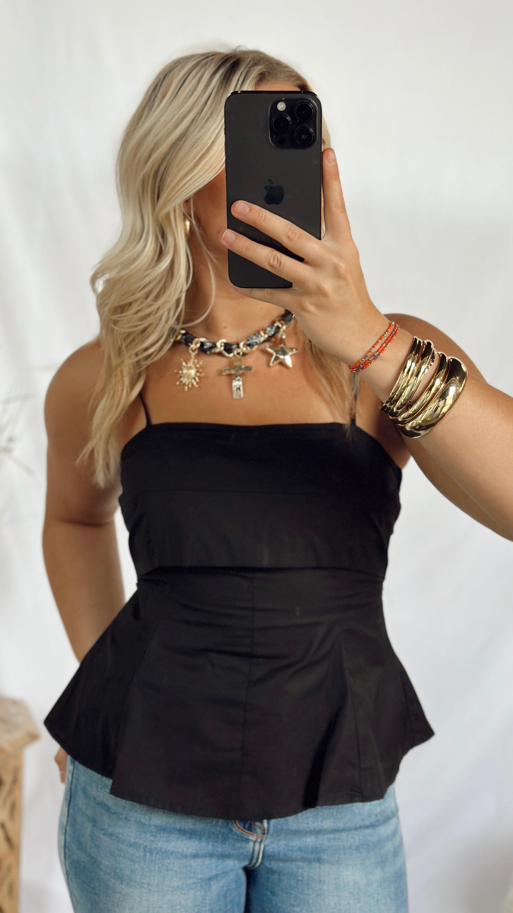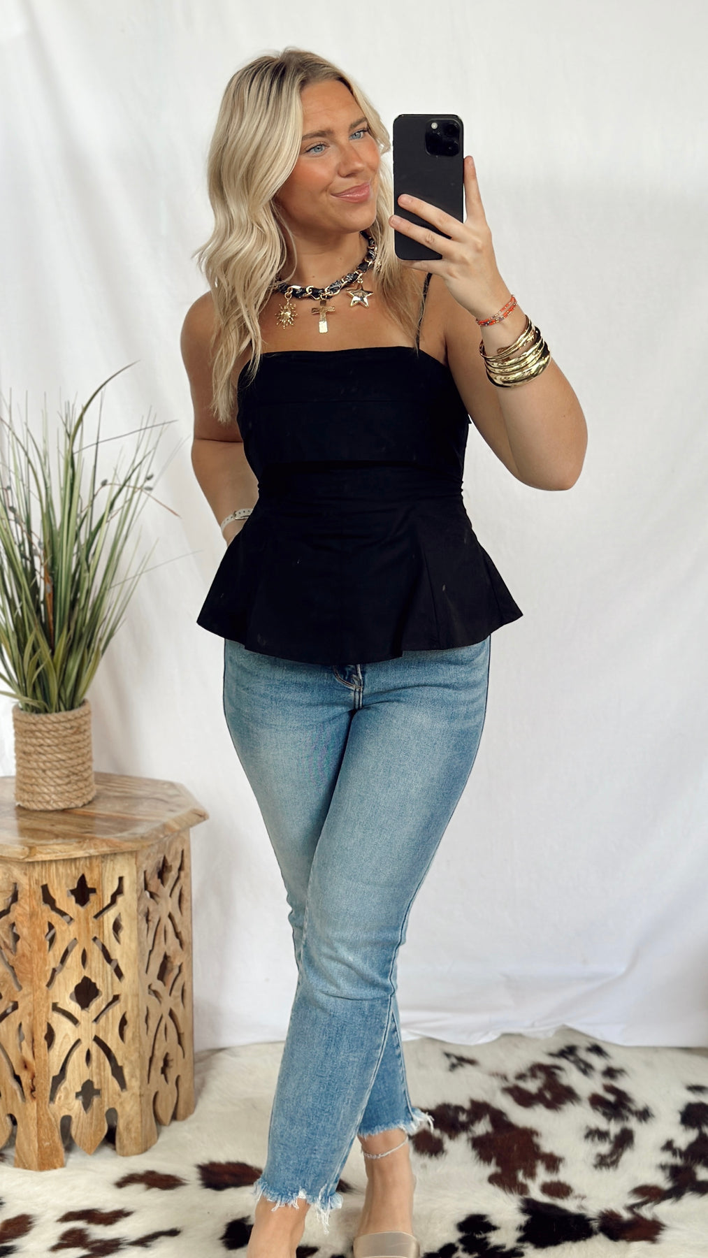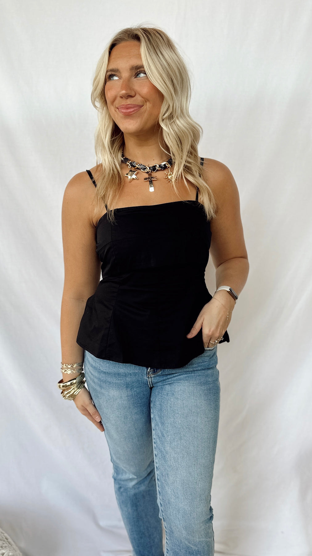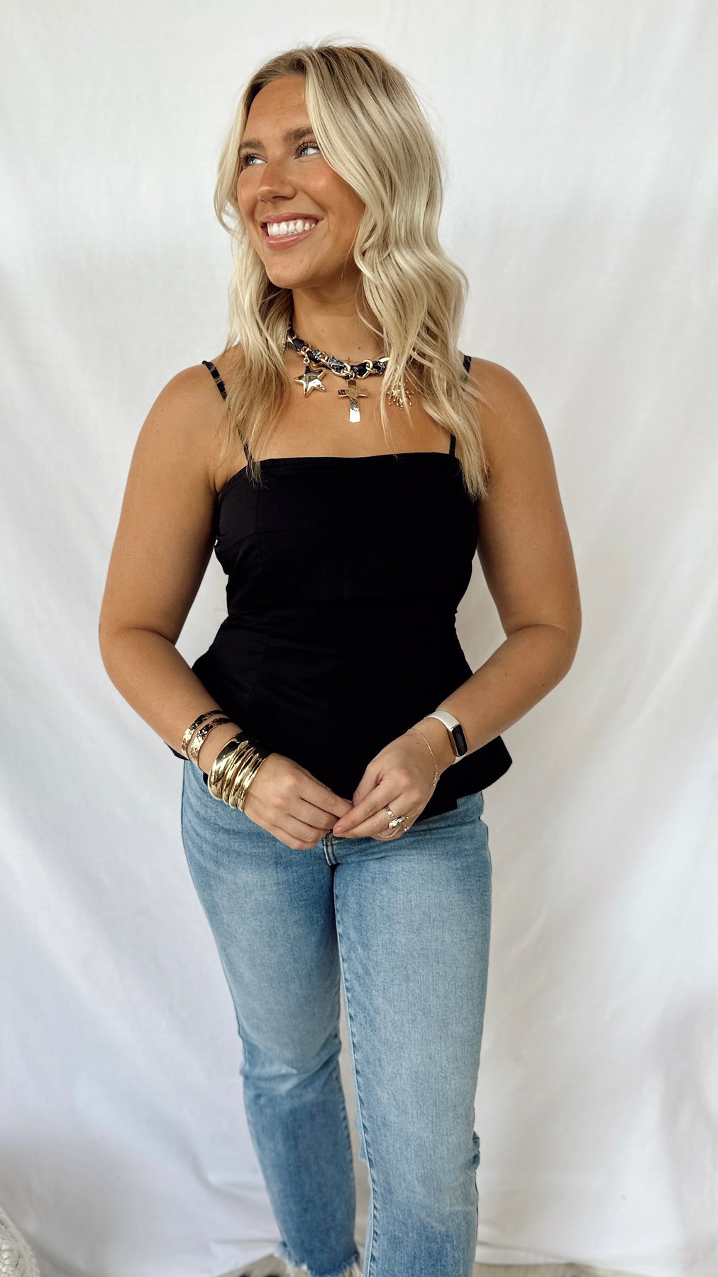 This fun and simple black top features adjustable straps for a perfect fit. Its sleek design makes it a versatile piece, easy to dress up or down for any occasion. Lightweight and comfortable, it’s ideal for effortless style all day long.