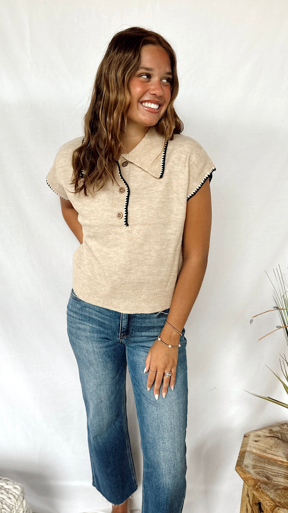 Stay cozy and stylish in The Harmony Top, a taupe short-sleeve sweater with charming button-up details on the front. The black and white accents on the collar and sleeves add a playful contrast that makes this top effortlessly fun and easy to wear for any casual occasion.