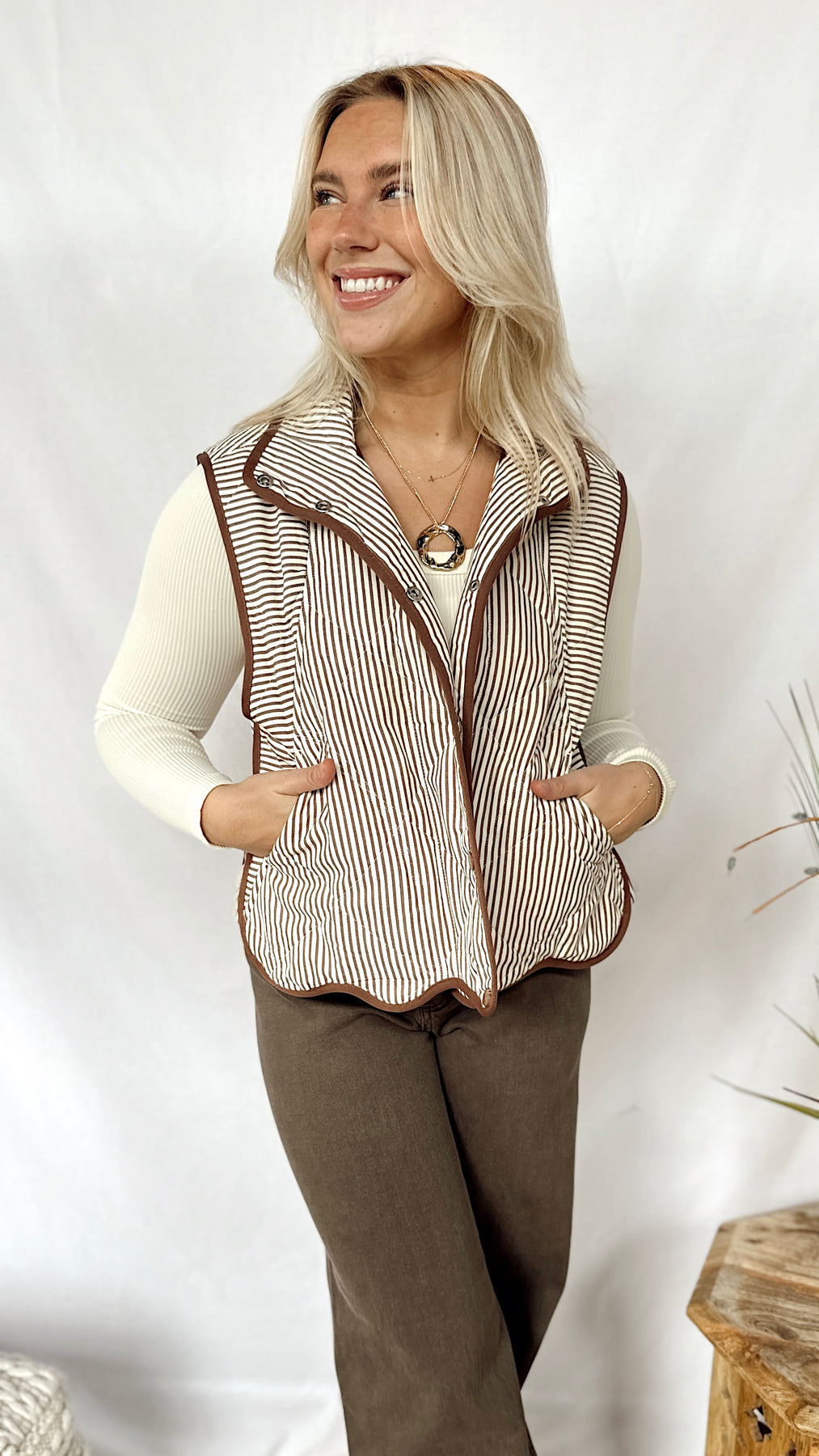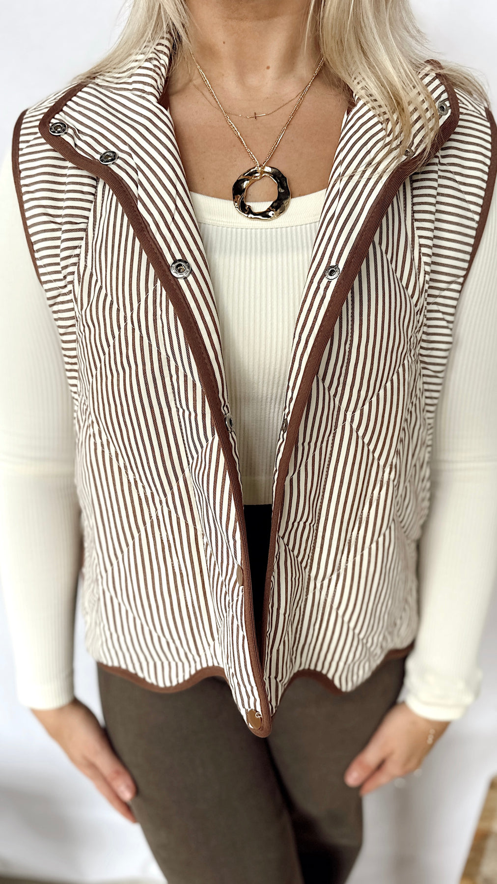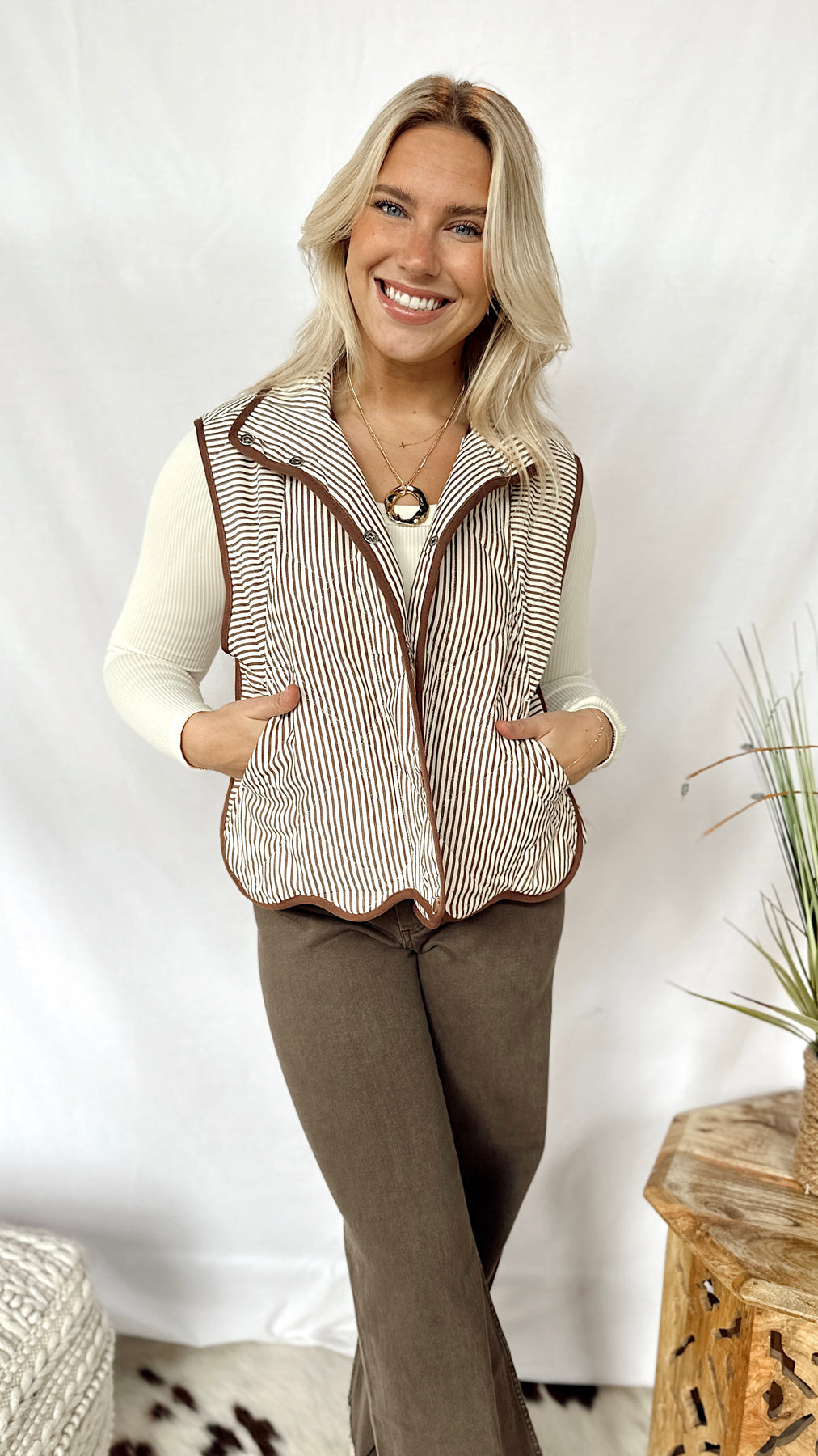 The Hunter Vest brings a playful mix of cream and brown stripes with charming brown button-up details. Finished with a scalloped edge at the bottom, this vest adds a fun touch to your layering game while keeping things simple and stylish. Perfect for pairing with your favorite casual outfits!