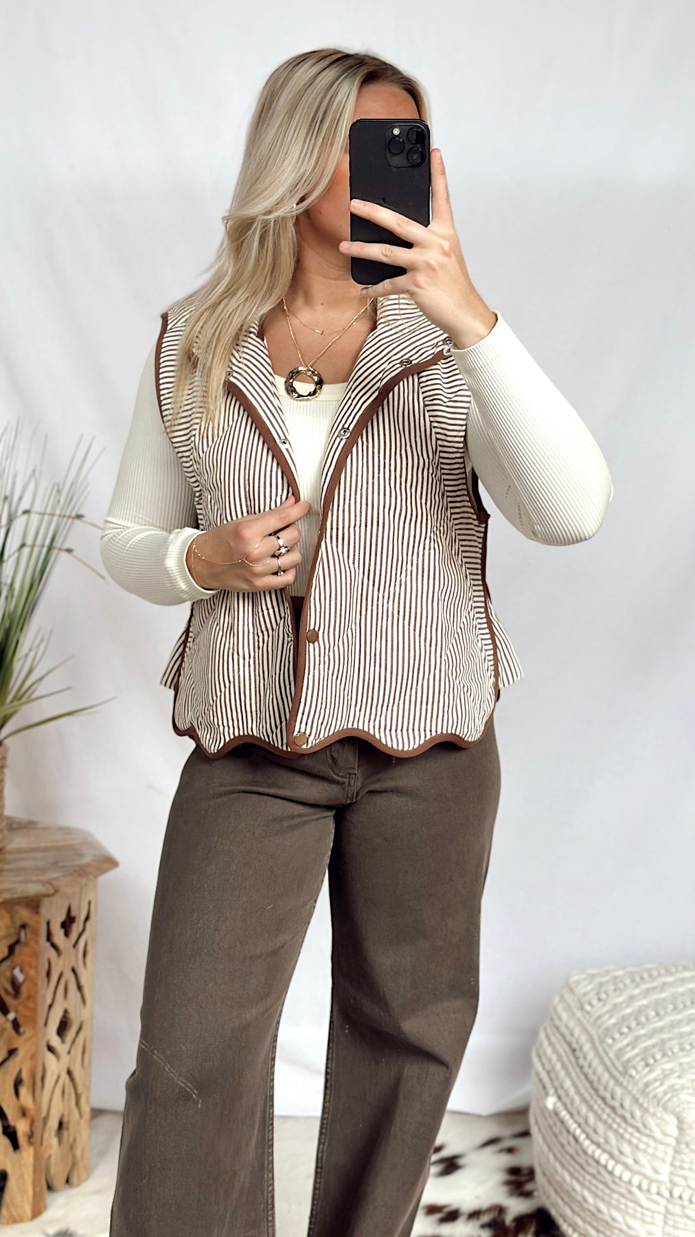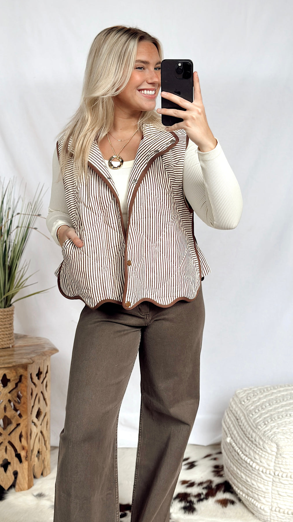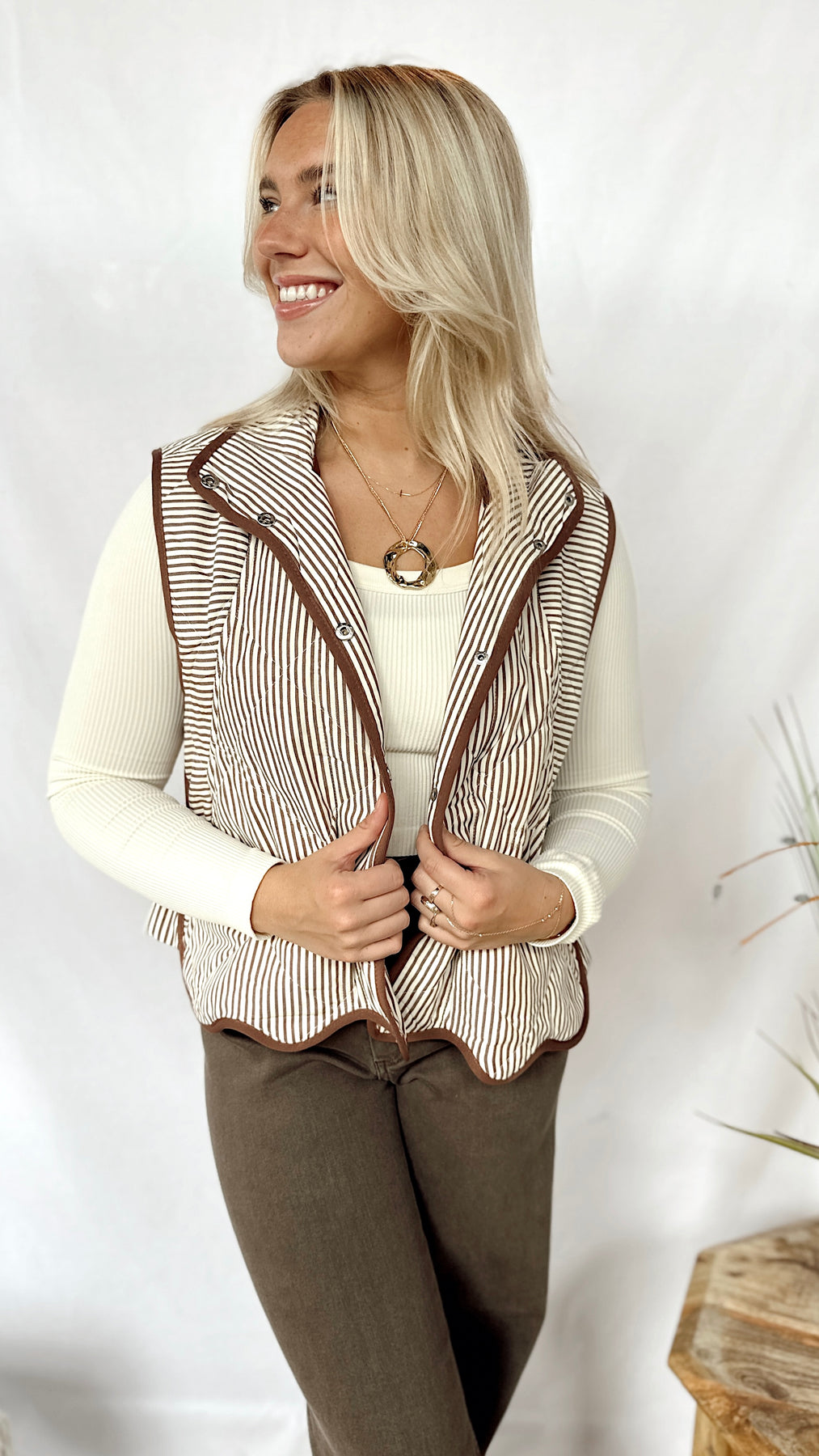 The Hunter Vest brings a playful mix of cream and brown stripes with charming brown button-up details. Finished with a scalloped edge at the bottom, this vest adds a fun touch to your layering game while keeping things simple and stylish. Perfect for pairing with your favorite casual outfits!
