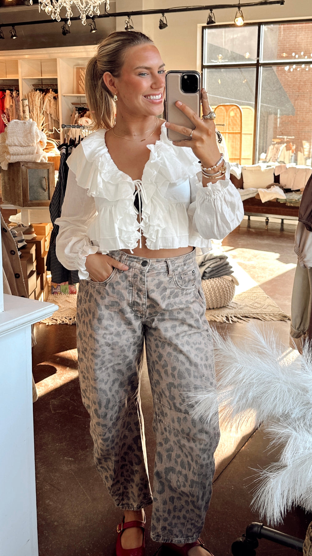 The Cara Top is your go-to piece for effortless style. This cropped white top features a flattering v-neck, long sleeves, and charming ruffle detailing that adds movement and texture. The tie detail at the front creates a playful, adjustable fit that lets you customize your look. Perfect for pairing with high-waisted jeans or skirts for a chic, put-together vibe.