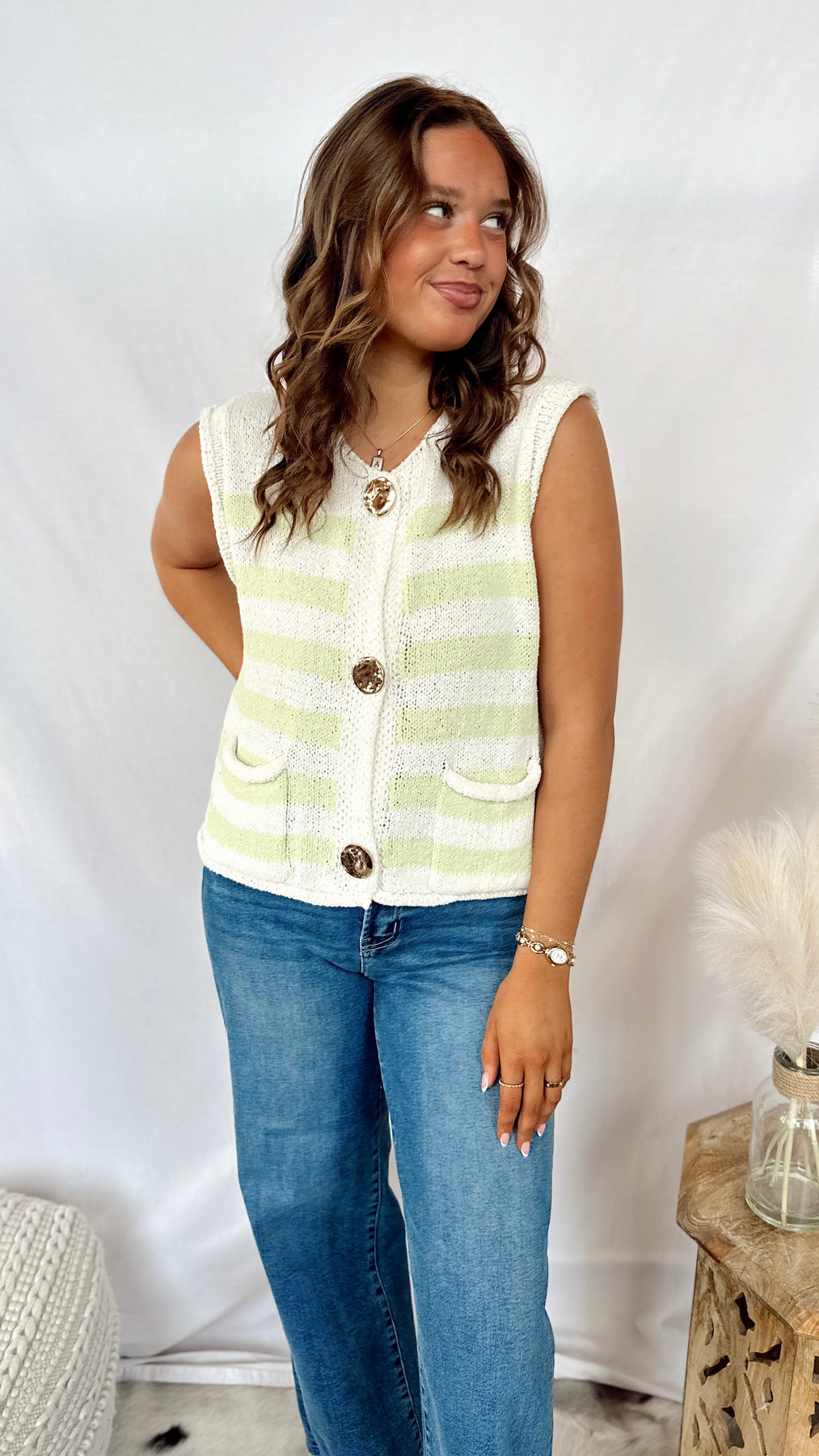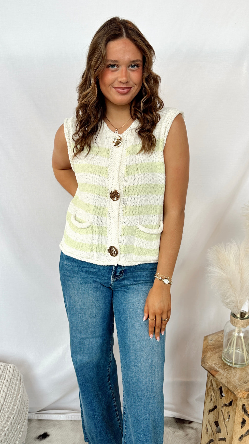 Layer up with The Honey Dew Top, a playful sleeveless knit sweater vest featuring cream and green stripes. Perfect for throwing over your favorite tee or wearing solo, this versatile piece adds instant charm to any outfit. The soft, breathable knit keeps you cozy without the bulk, making it ideal for transitional weather or year-round layering. A fun essential that works as hard as you do.