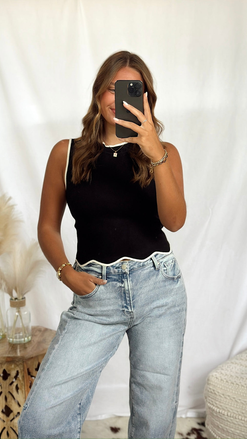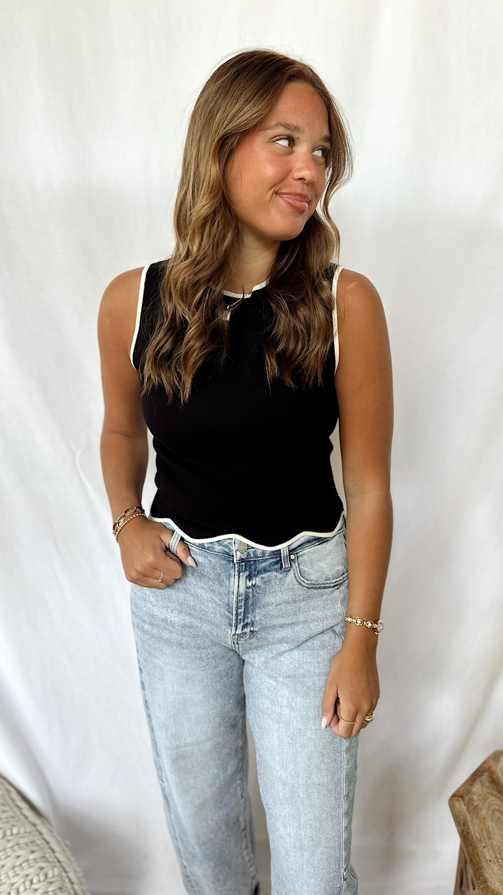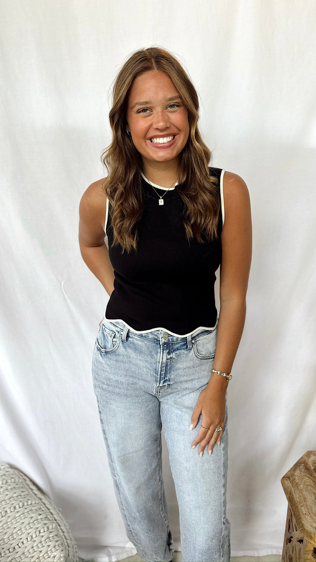 The Ellis Top is a playful tank available in classic black and soft taupe, each accented with crisp white scalloped edging for a charming touch. Its simple design makes it a versatile favorite for layering or wearing solo, adding a fresh, fun twist to your everyday wardrobe.