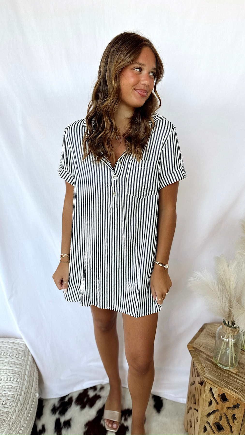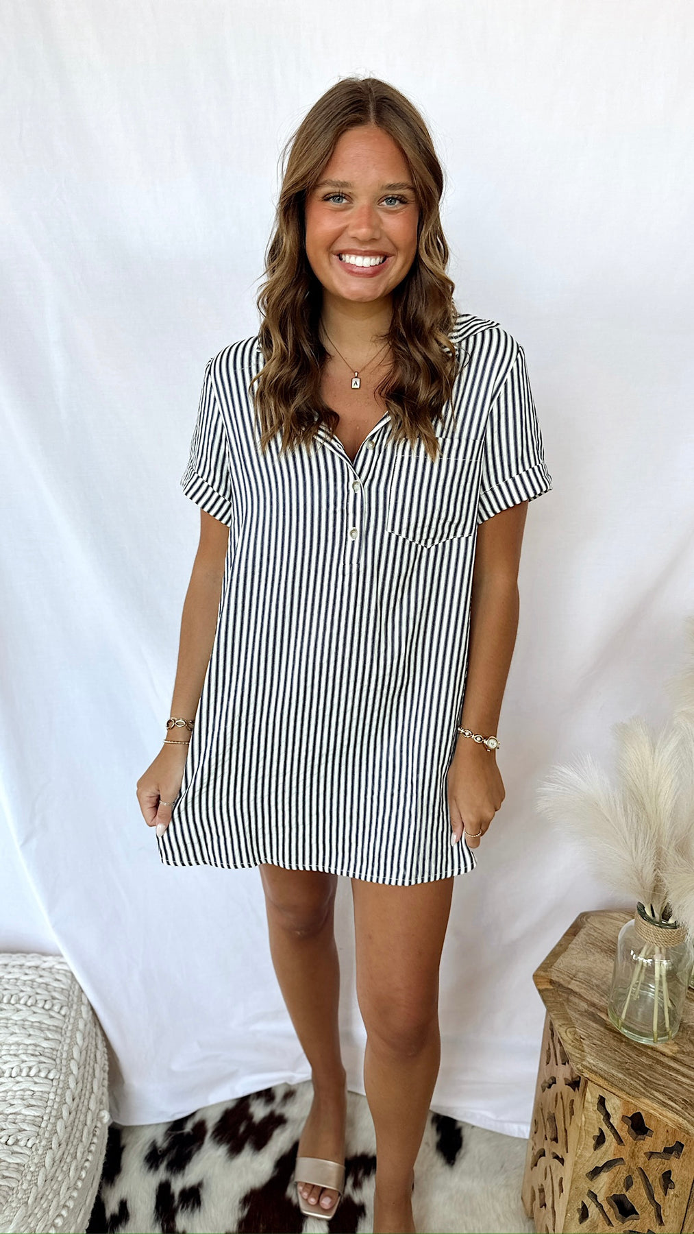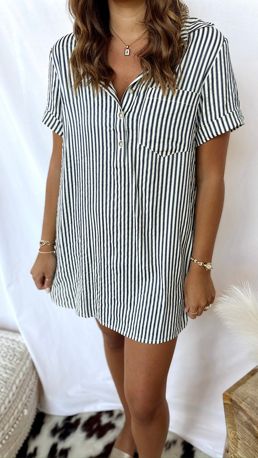 The Natasha Dress features classic navy and white stripes with a flattering button-down front. Perfect for casual days or weekend brunches, this dress combines effortless style with comfortable wear. I