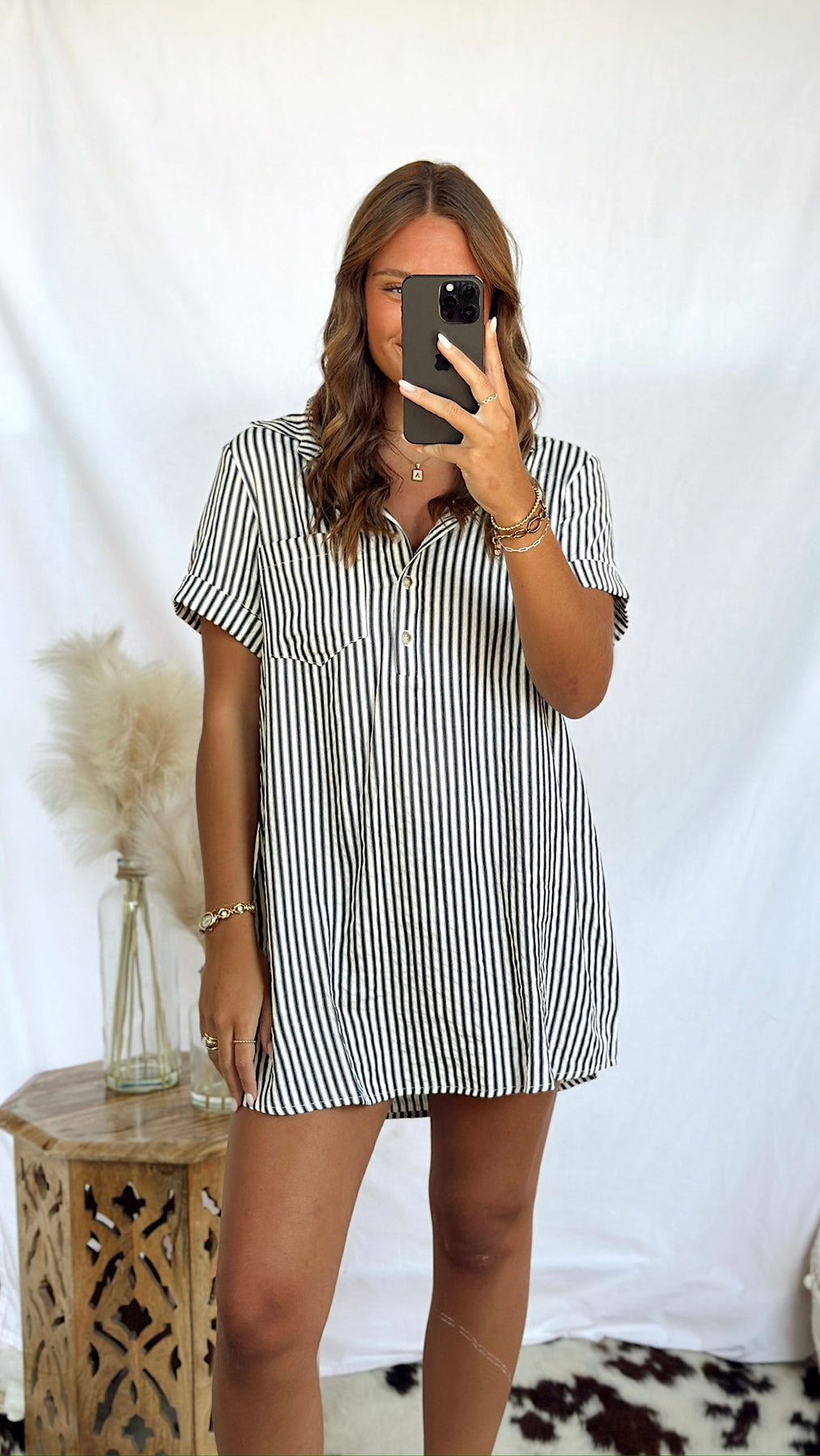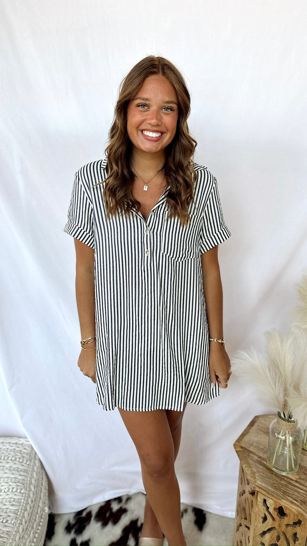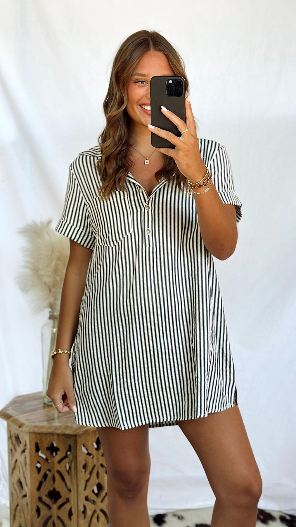 The Natasha Dress features classic navy and white stripes with a flattering button-down front. Perfect for casual days or weekend brunches, this dress combines effortless style with comfortable wear. I
