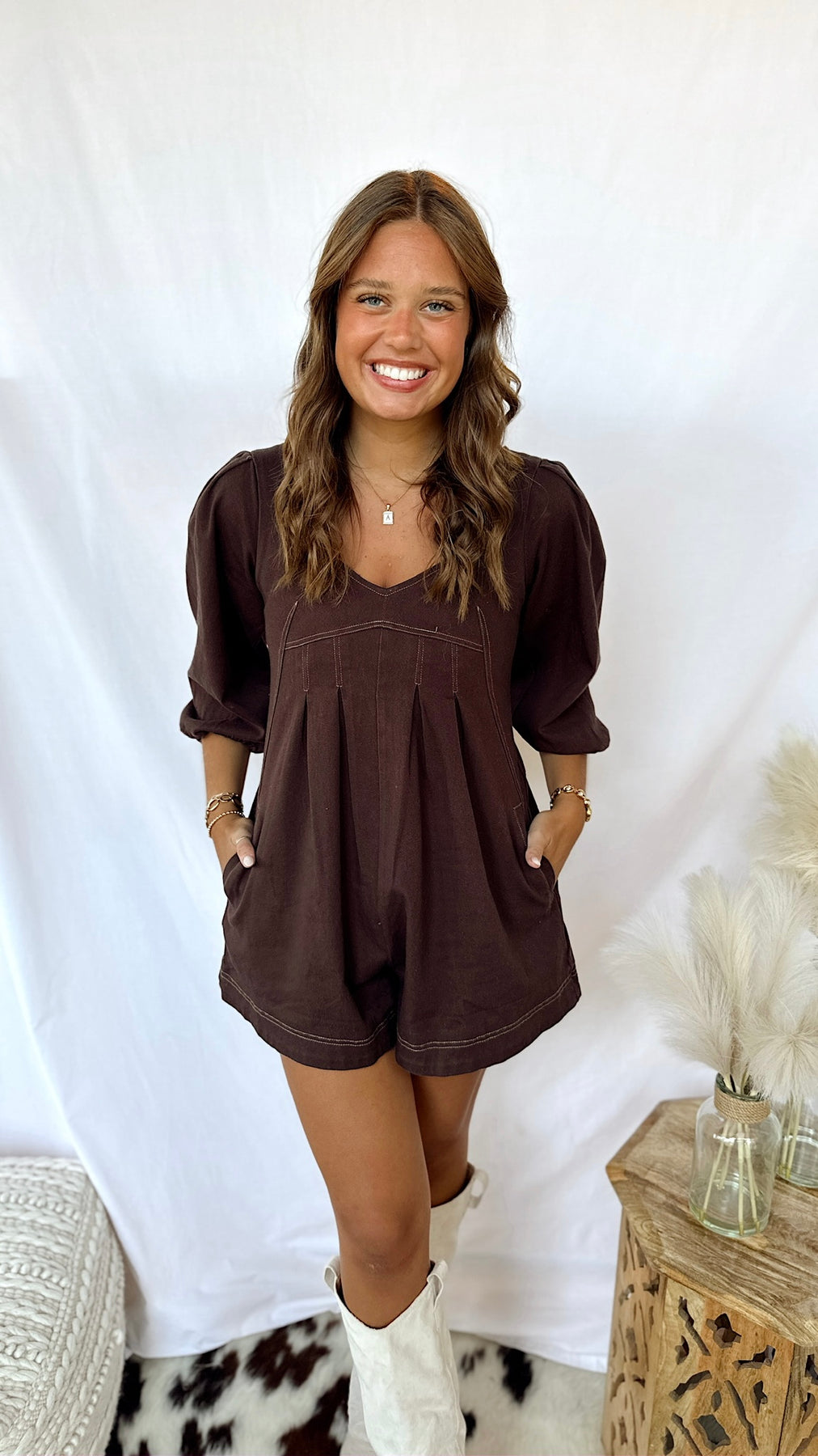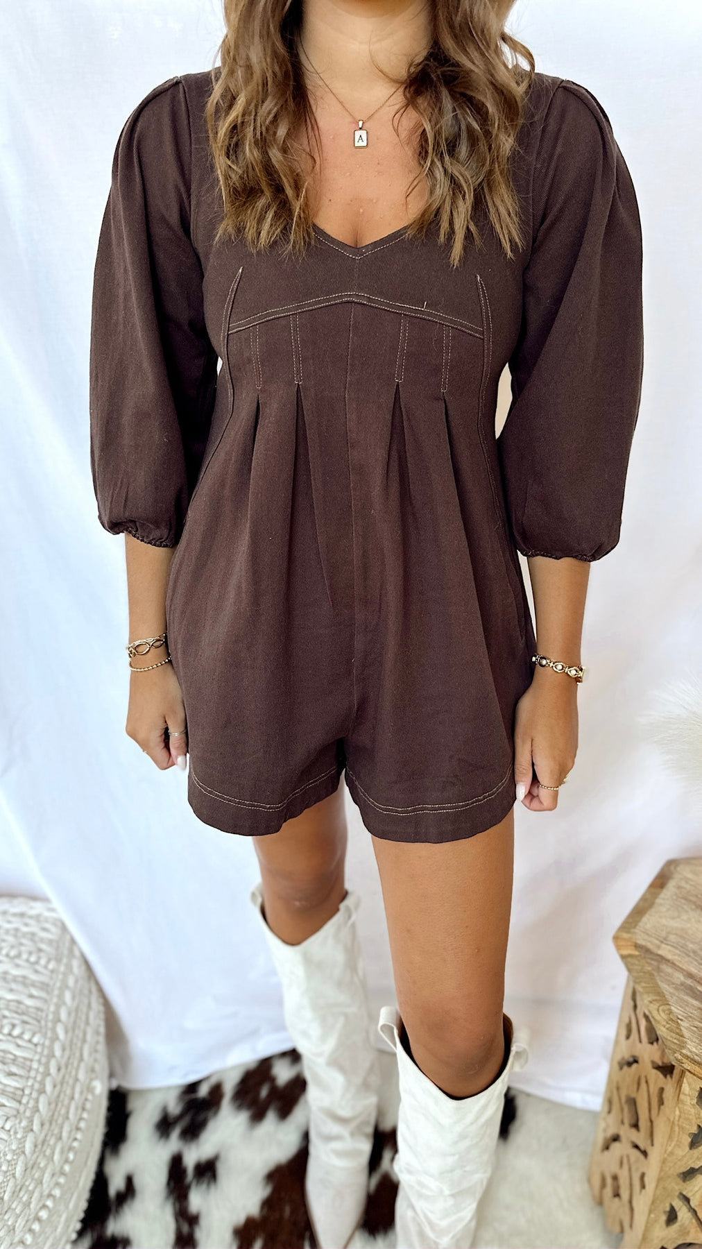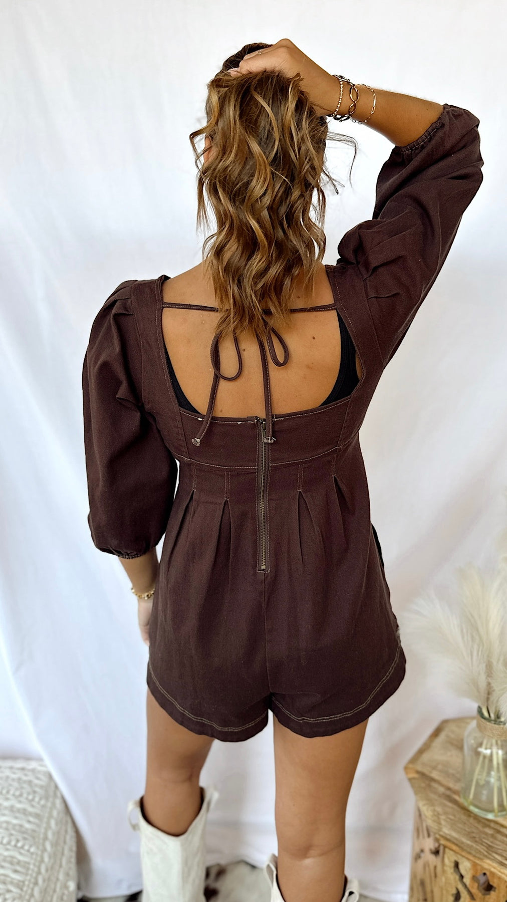 Enjoy effortless style with the Sparks Fly Romper, crafted from soft brown denim. Its three-quarter sleeves offer just the right amount of coverage for a casual, playful look that’s perfect for any season.