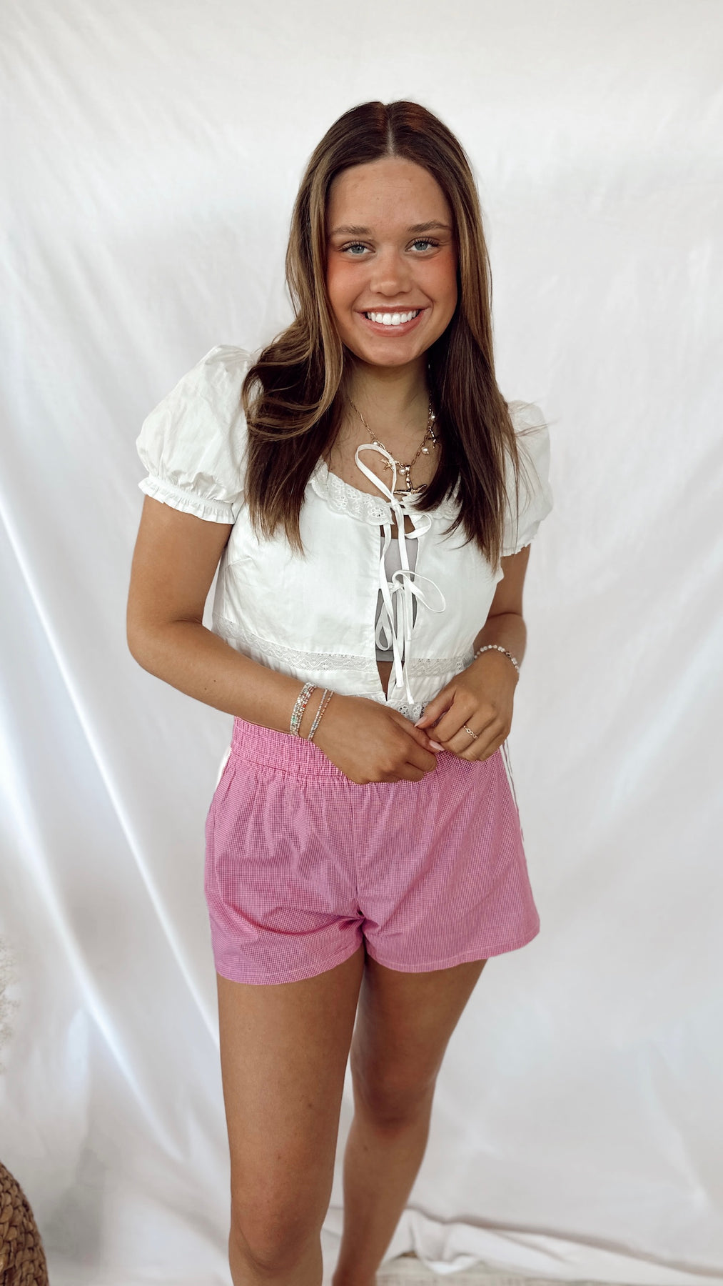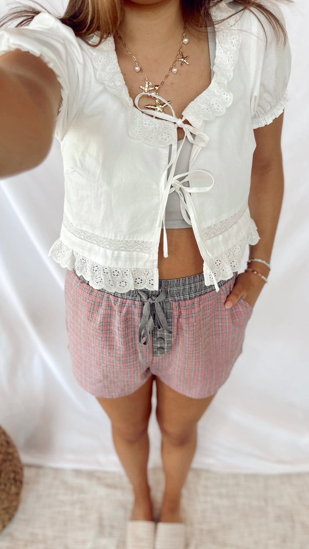 Complete your summer wardrobe with The Amalia Top! This adorable white lace top features playful puff sleeves and a tied detail in the middle. Perfect for adding a touch of fun to any outfit.