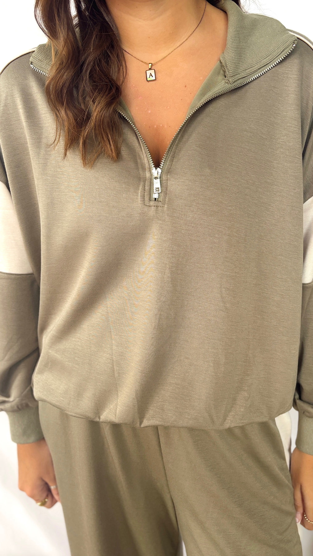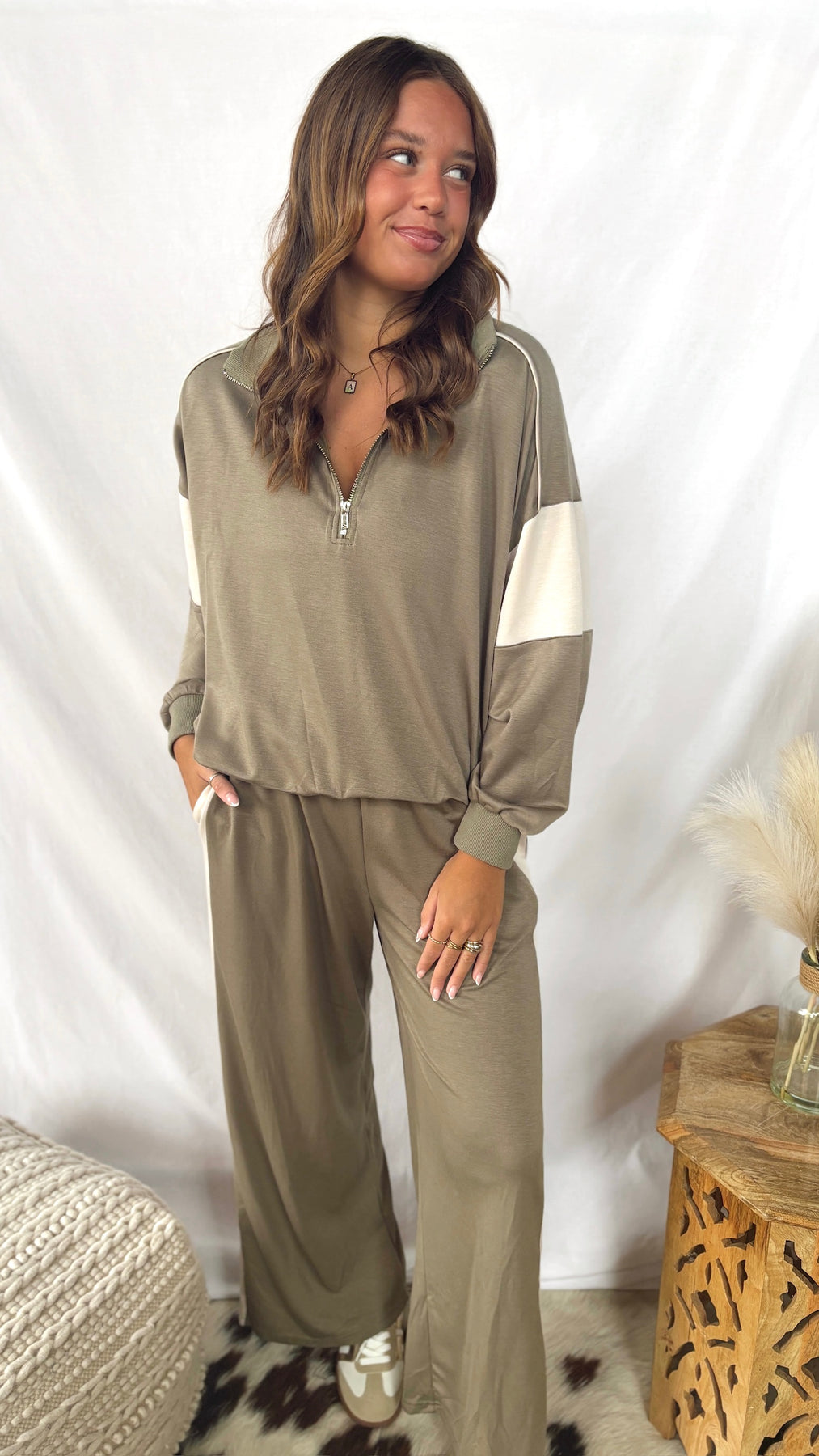 Stay cozy and stylish with The Mallory Set (sold separately), featuring a muted green sweatshirt and matching sweatpants accented by crisp white stripes. Perfect for lounging or casual outings, this set combines comfort with a sporty vibe for effortless everyday wear.