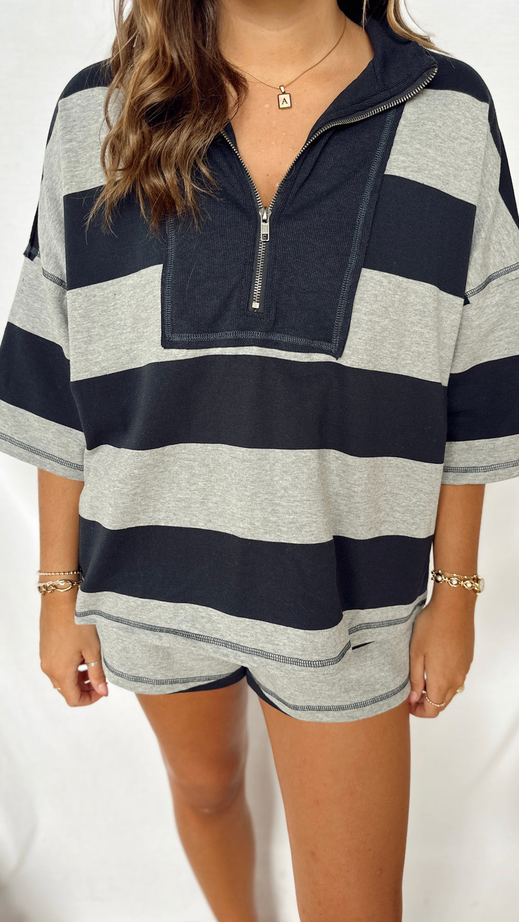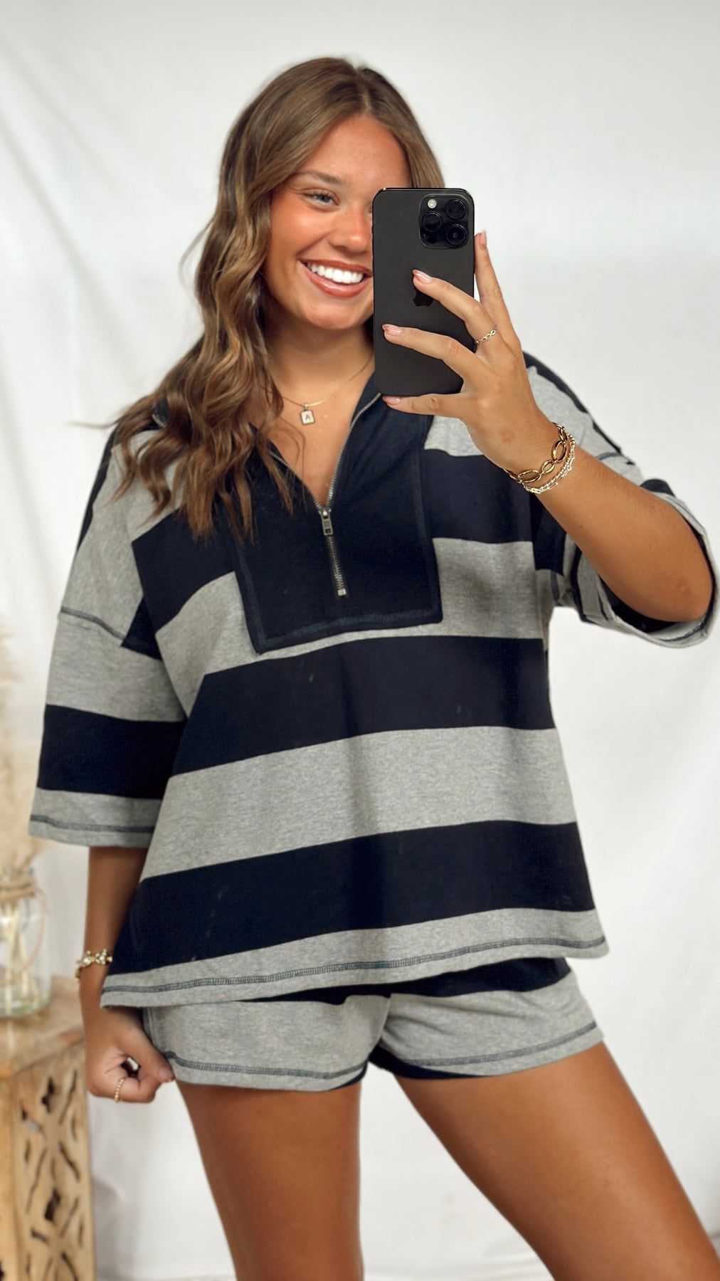 The Miller Set is a stylish top featuring grey and navy stripes and a quarter zip for easy wear. Perfect for adding a fresh, casual vibe to your outfit while keeping comfort front and center.