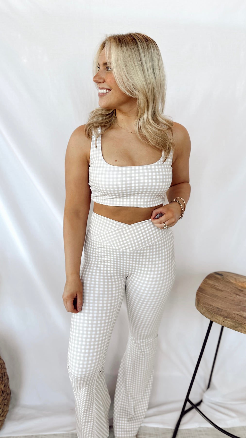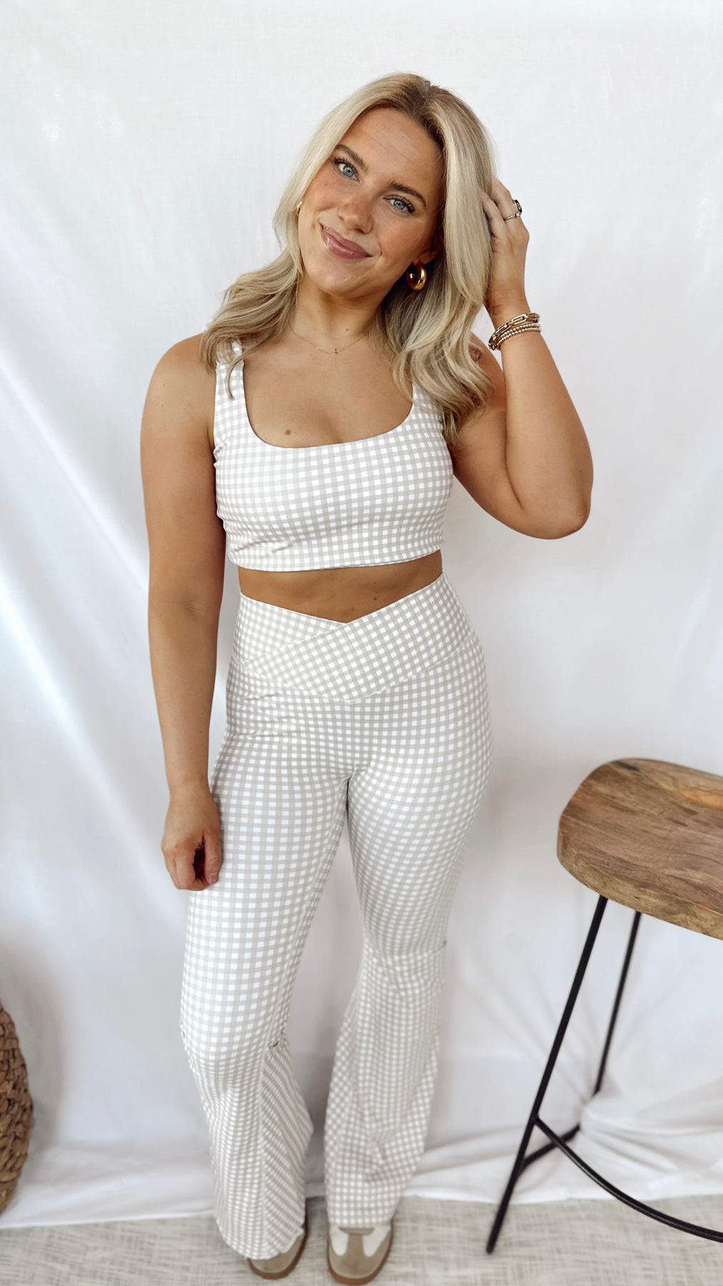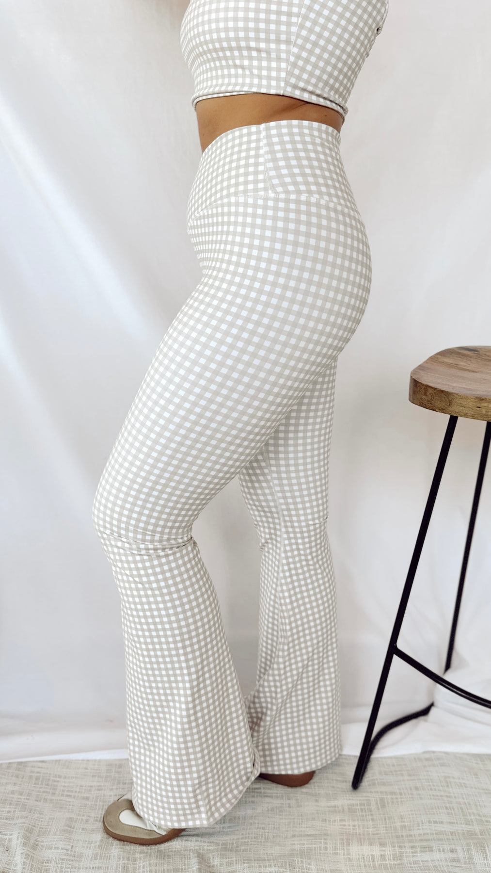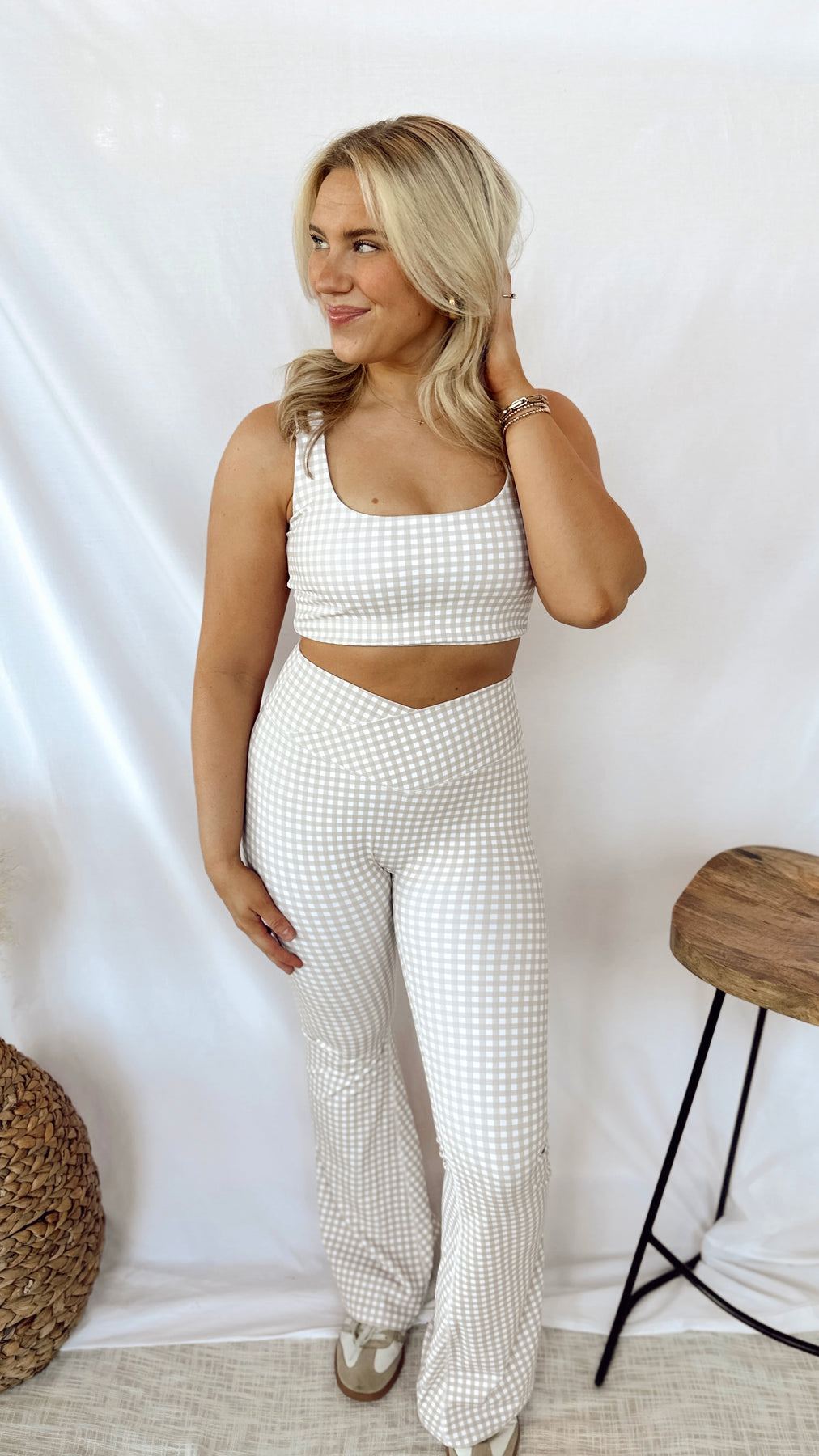 Get ready to turn heads with The Darlin' Gingham Crossover Leggings! These beige gingham leggings feature a unique crossover front design and flared bottoms, creating a fun and stylish look. With a touch of gingham, you'll be making a statement while staying comfortable and fashionable.
