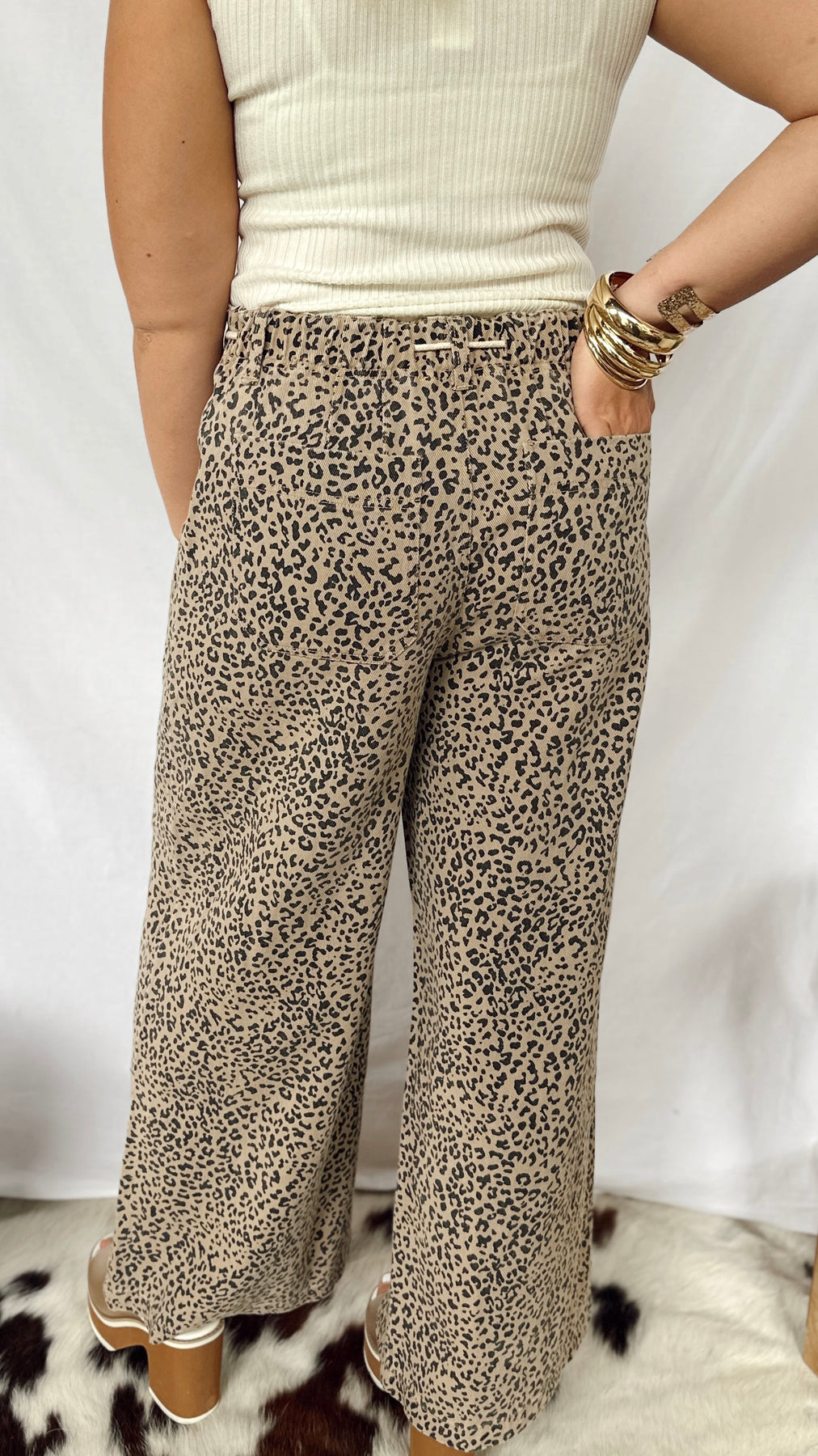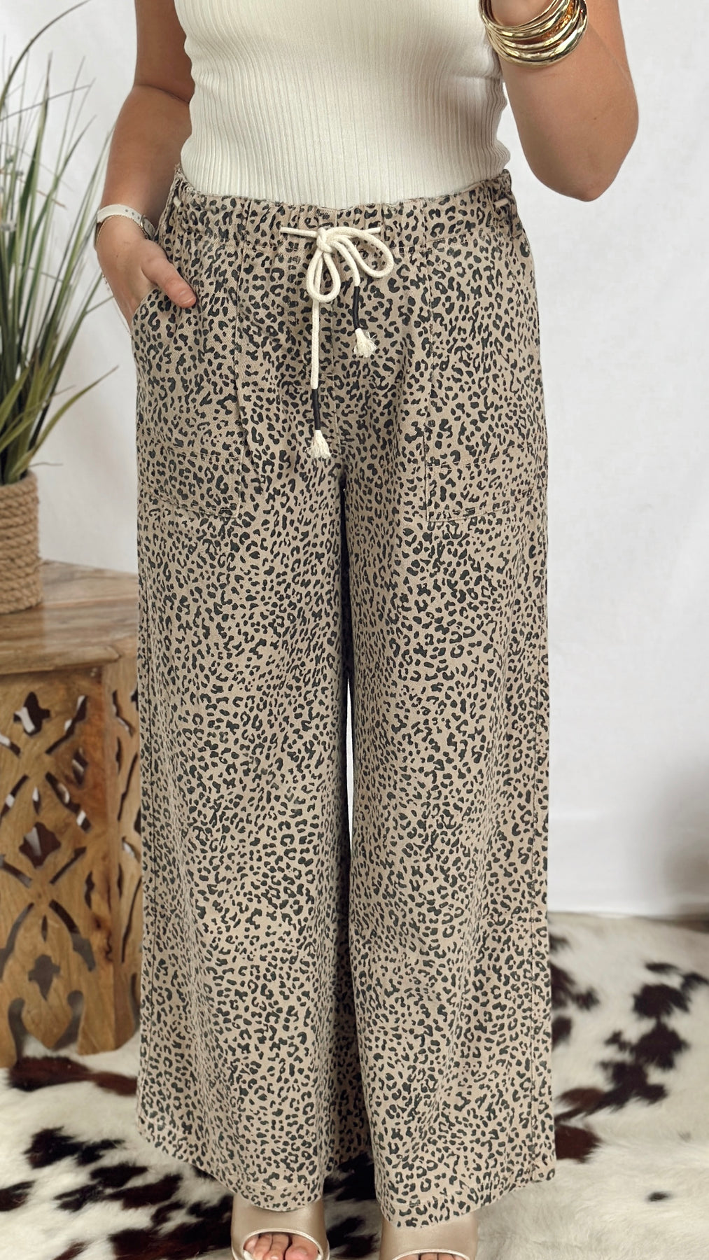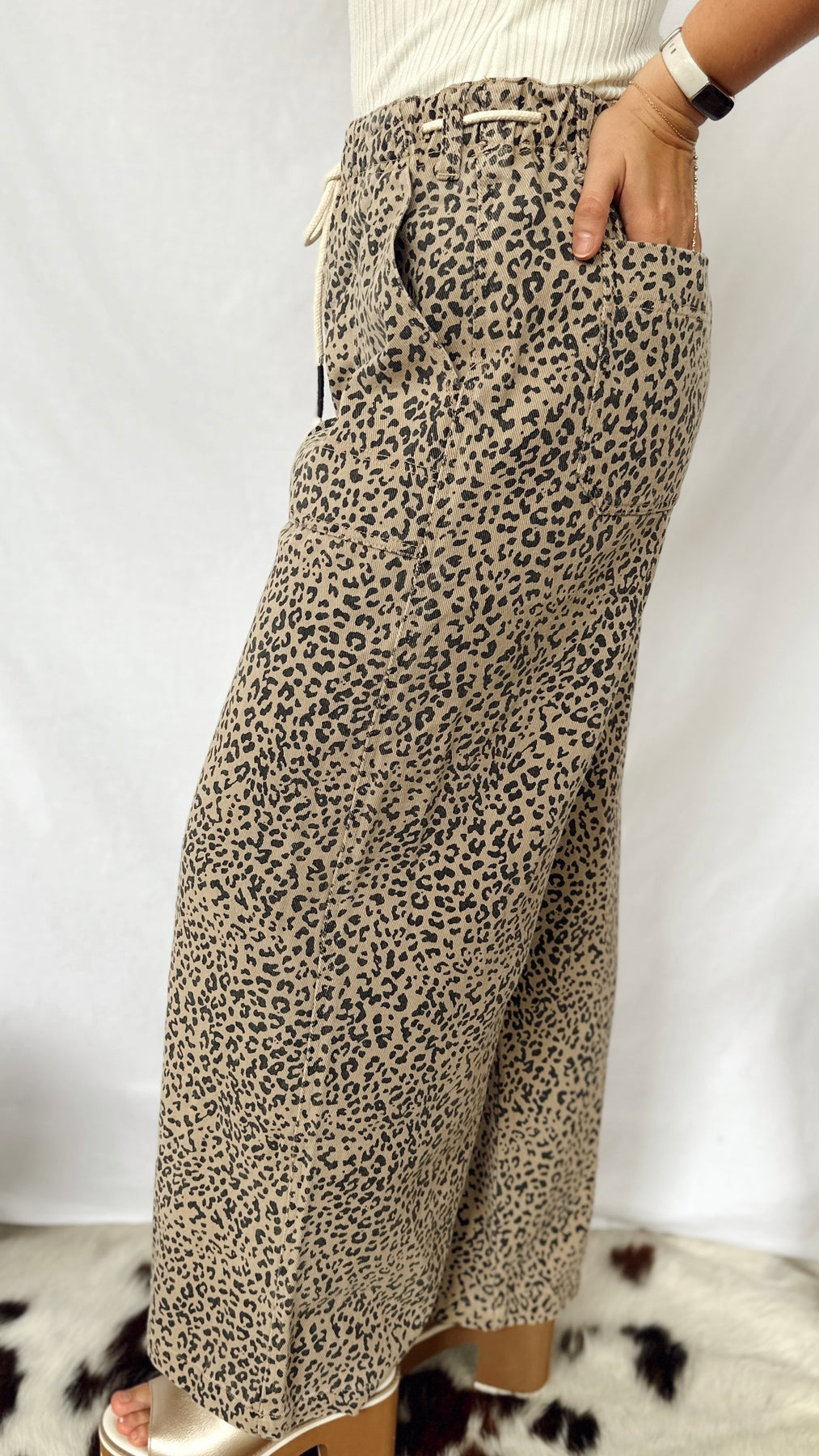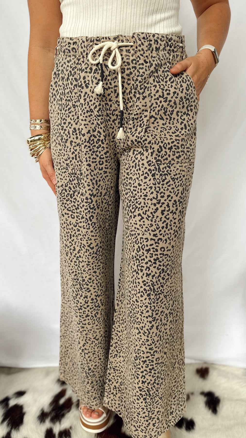 Add a playful edge to your wardrobe with The Fast Time Pants. These wide-leg leopard pants feature a cute rope drawstring for an adjustable, relaxed fit. Perfect for lounging or making a statement on the go, they blend comfort with bold style effortlessly.
