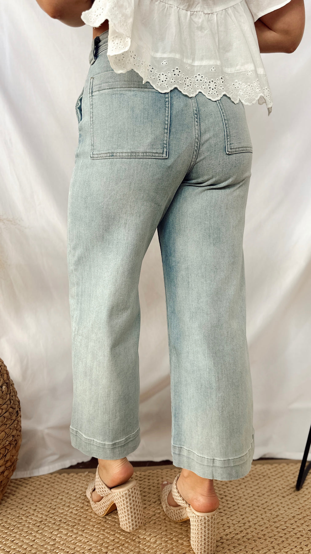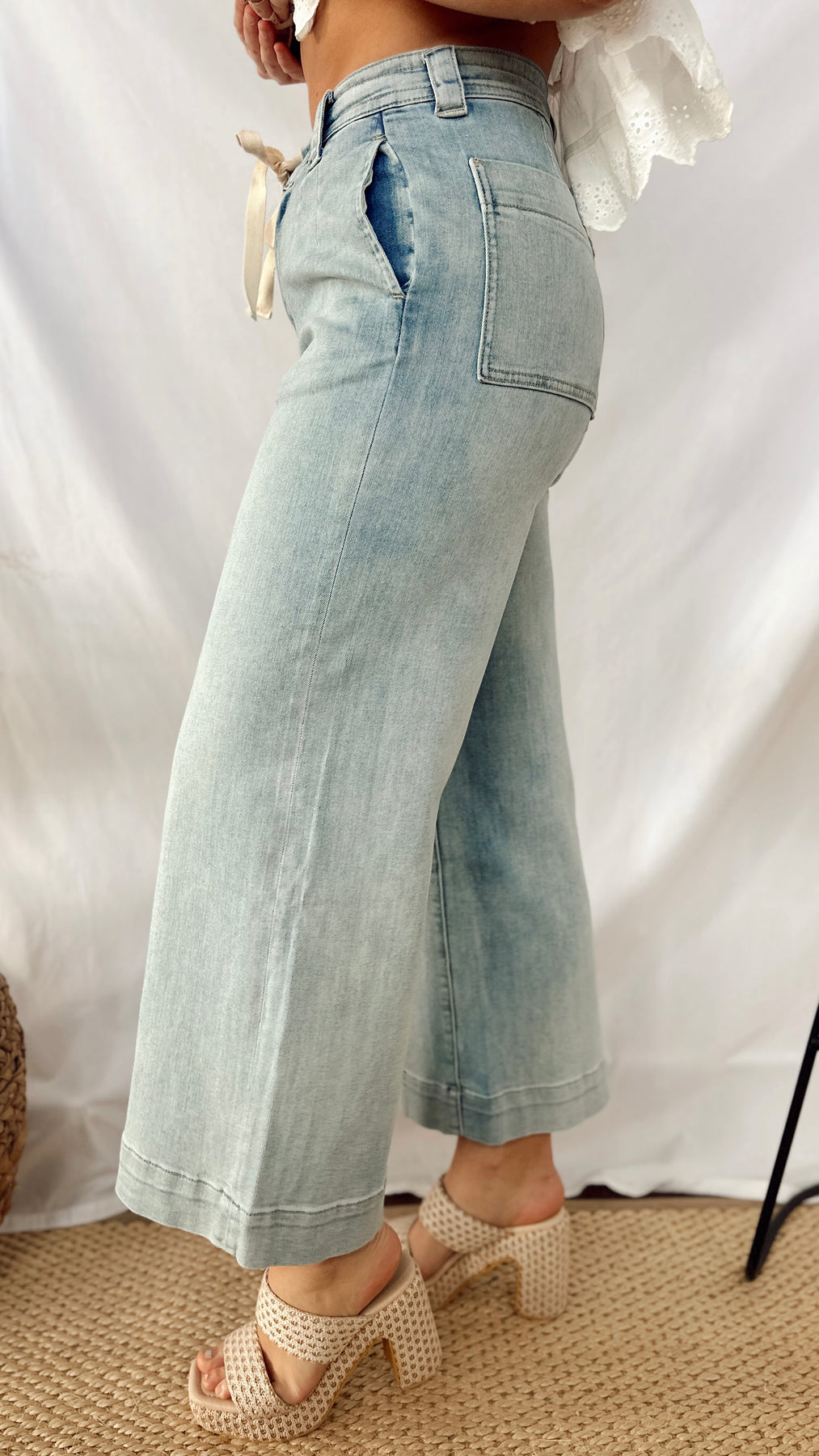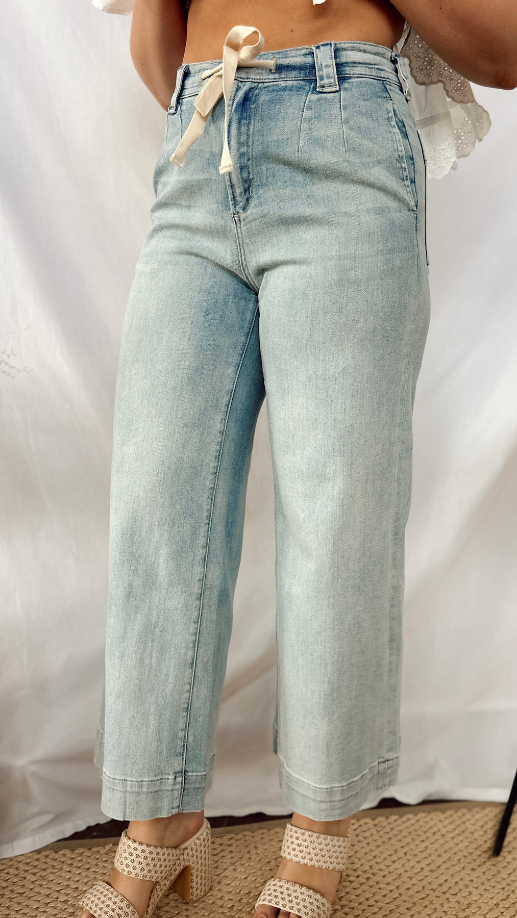 Introducing the Arizona Jeans - your new favorite! These light wash jeans are designed with a wide leg for maximum comfort and style. The drawstring detail adds a touch of fun and convenience. Perfect for any occasion!