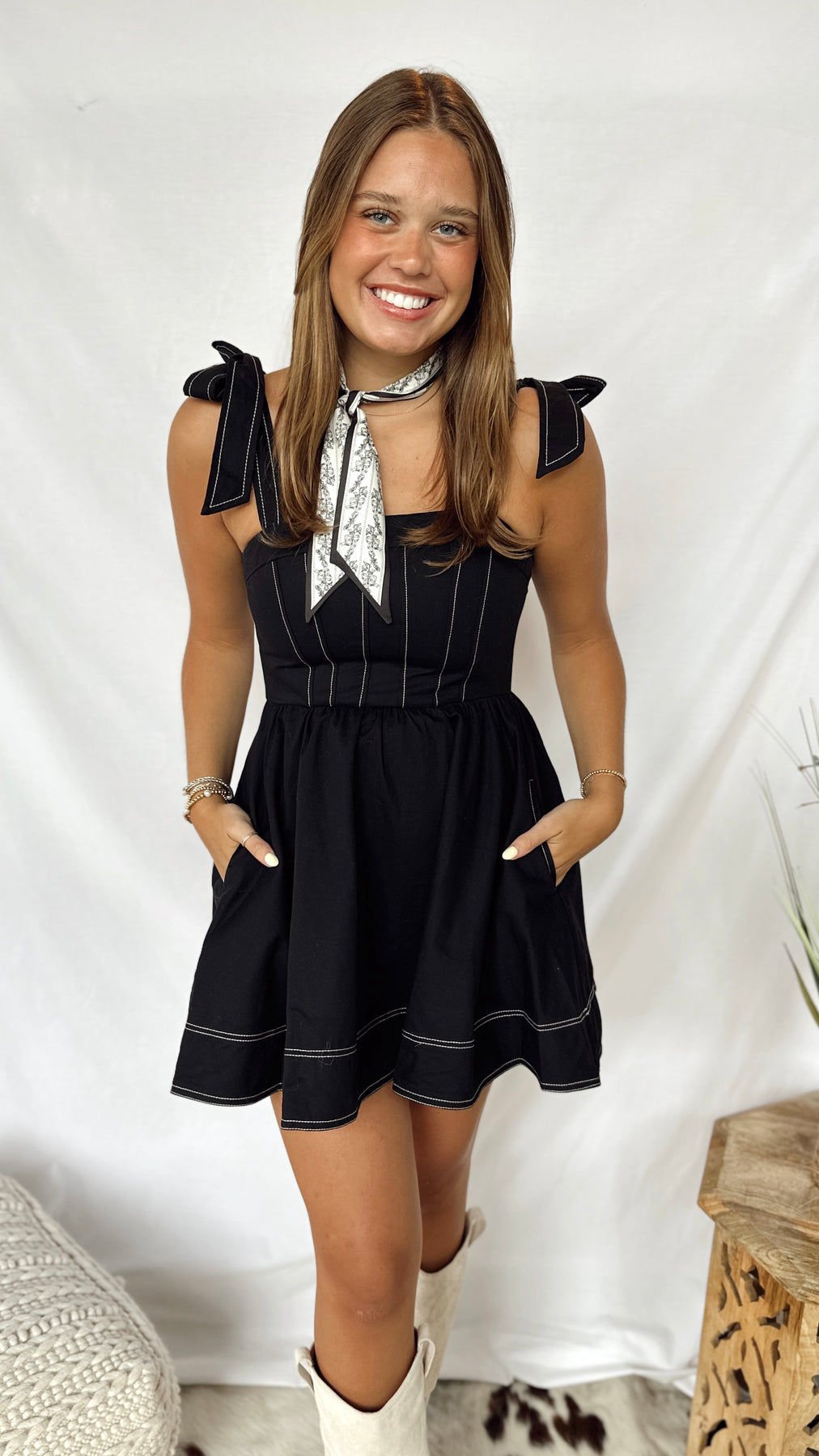 The Molly Dress is a playful black mini with contrasting white stitching that adds a touch of charm. Adjustable tie straps let you customize your fit while keeping things light and breezy.