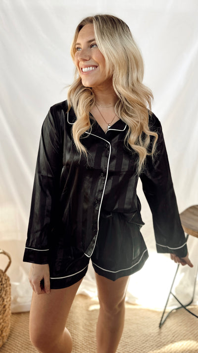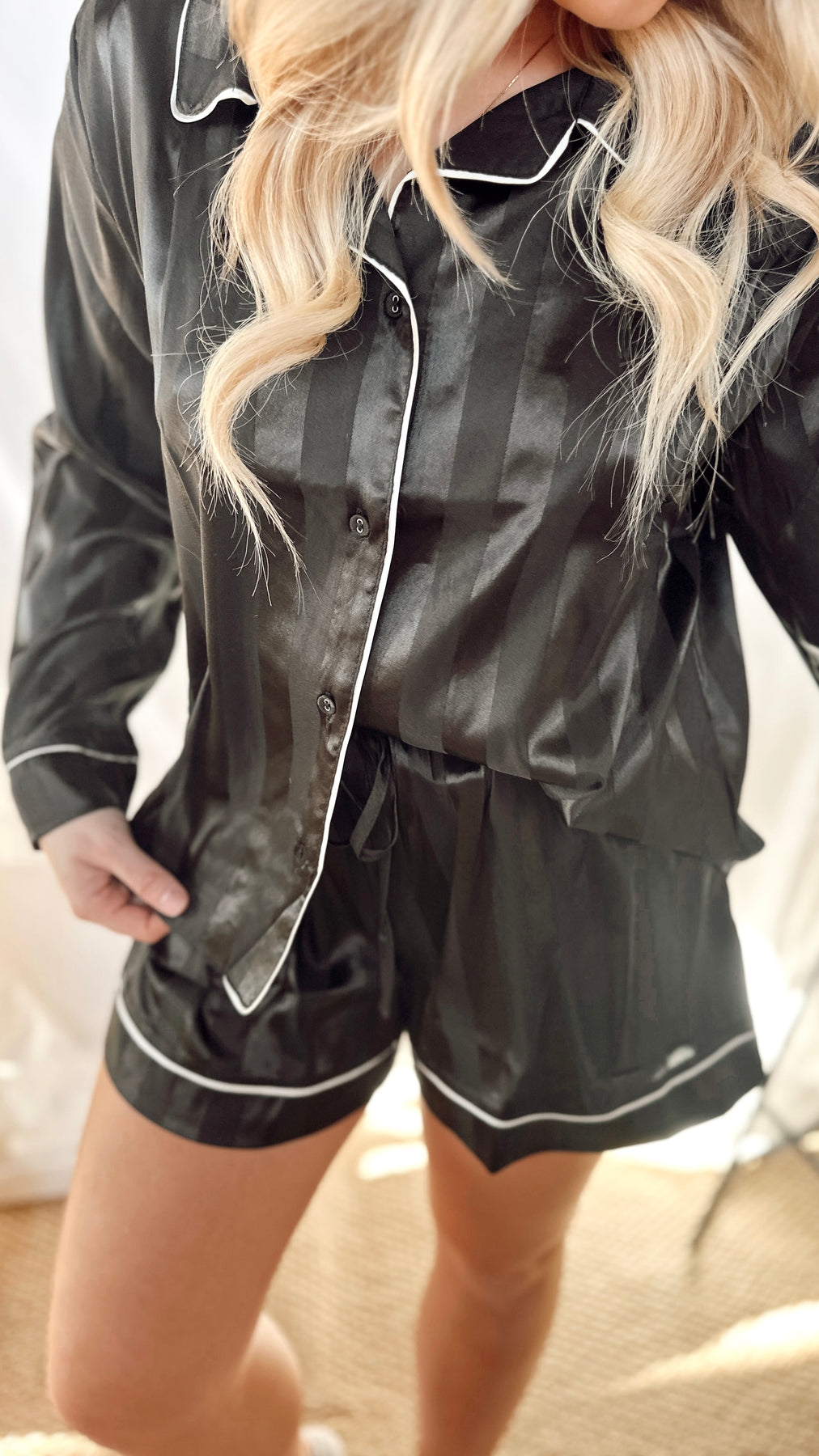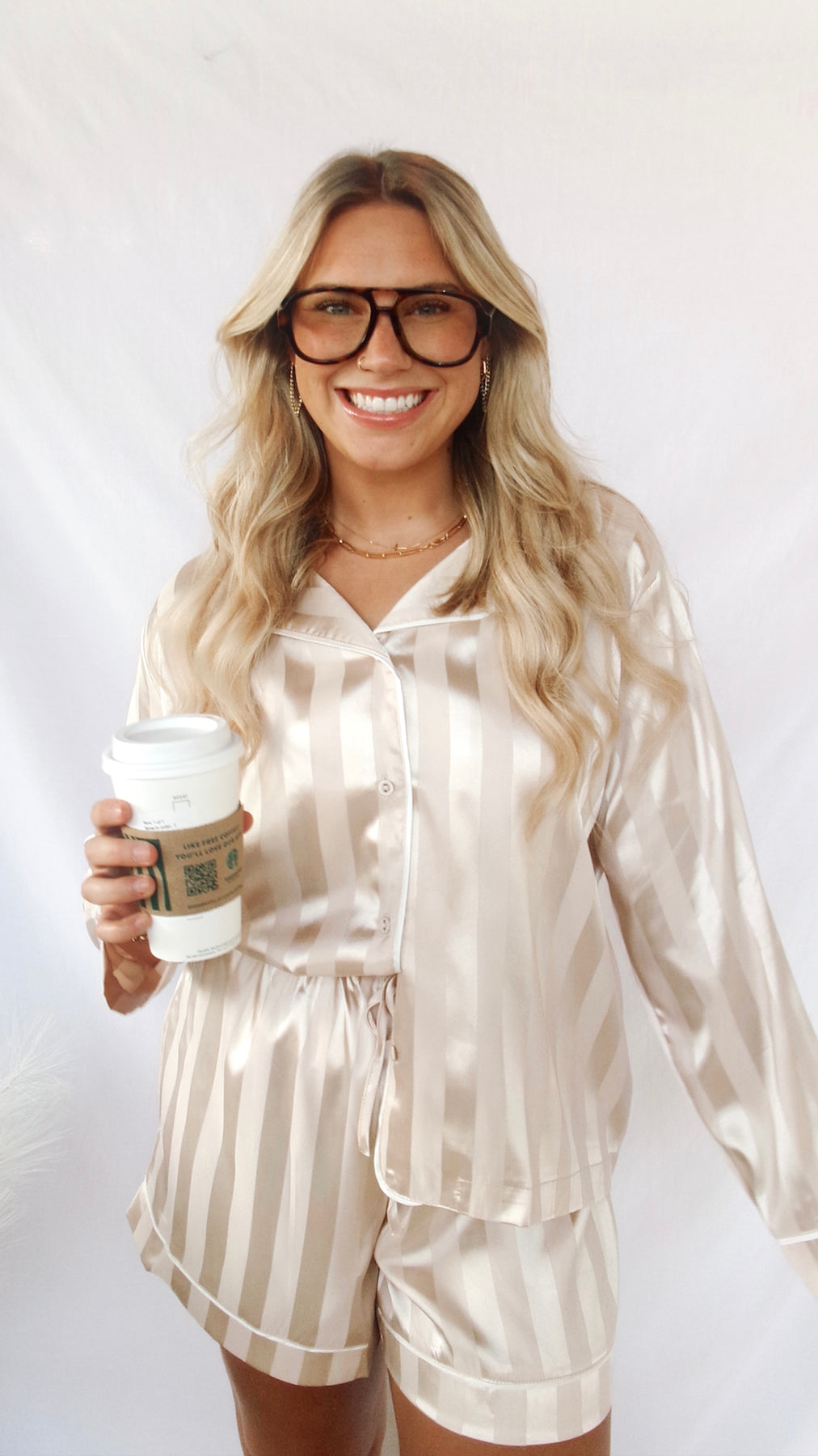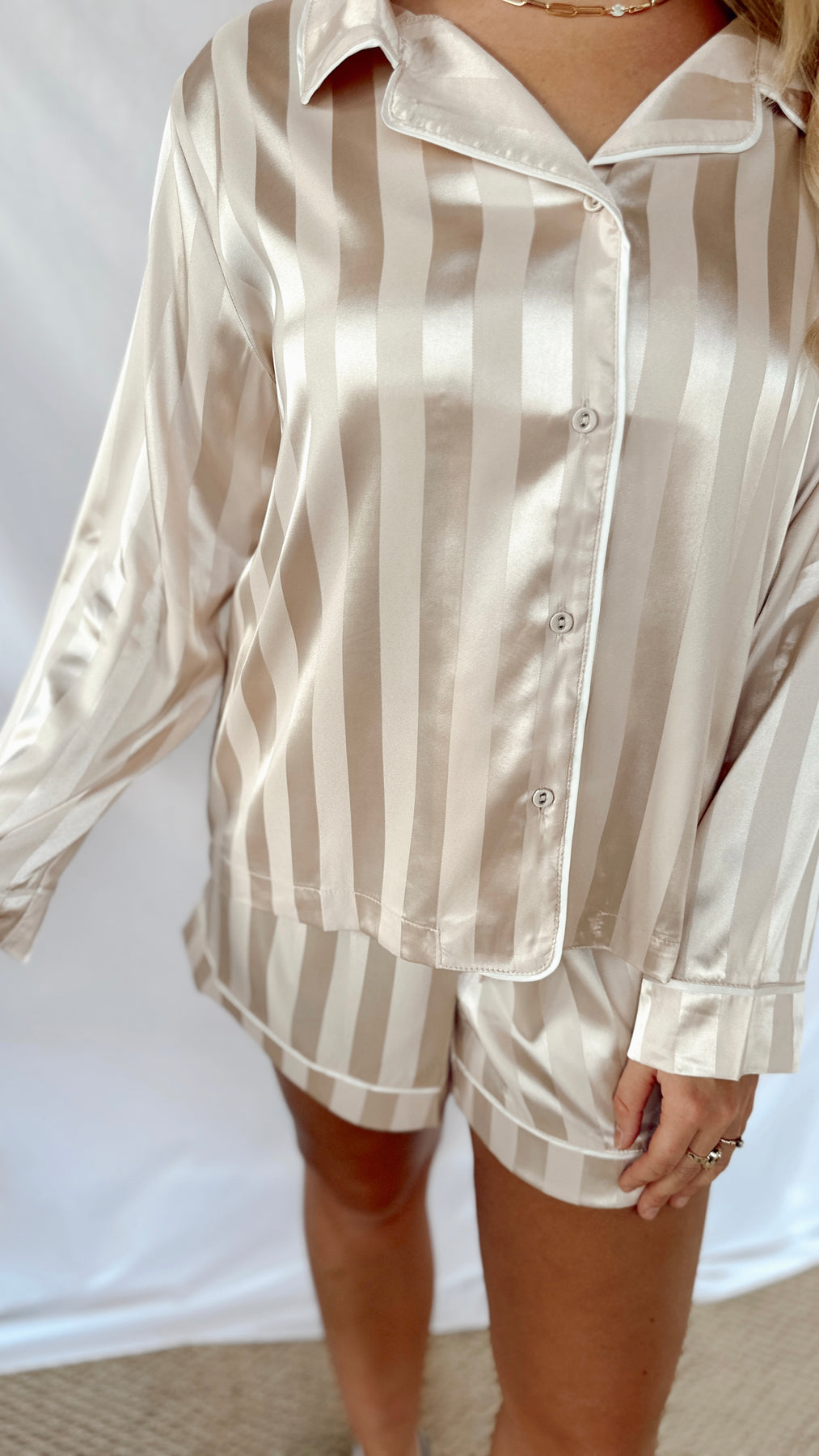 Relax in style with The Chanel PJ Set. This fun and simple set includes a neutral colored long sleeve top and striped shorts for a comfortable and chic look. Perfect for lounging or a cozy night's sleep.