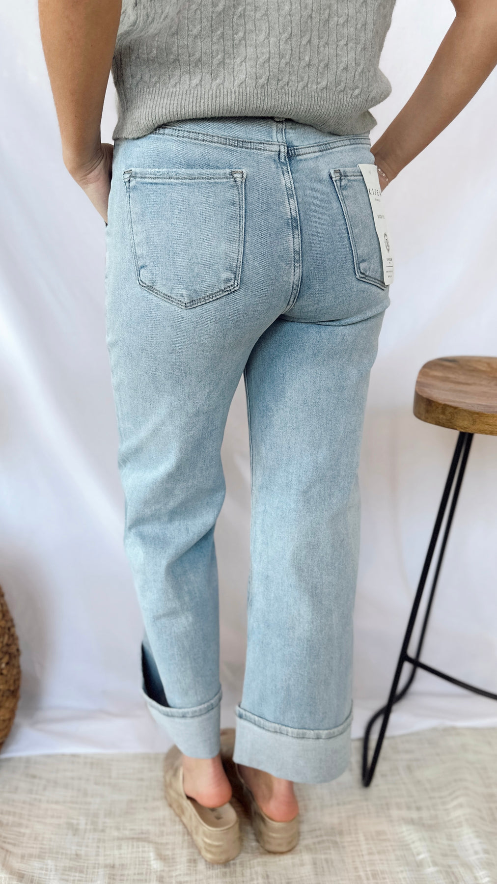 The Sally Jeans: wide leg light wash denim with a small cuff for a fun and easy look. Perfect for any casual occasion, these jeans are both comfortable and stylish. Upgrade your wardrobe with The Sally Jeans today!