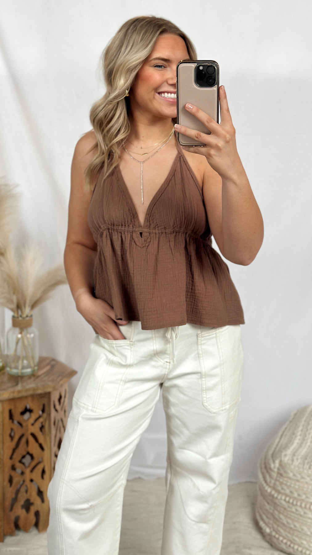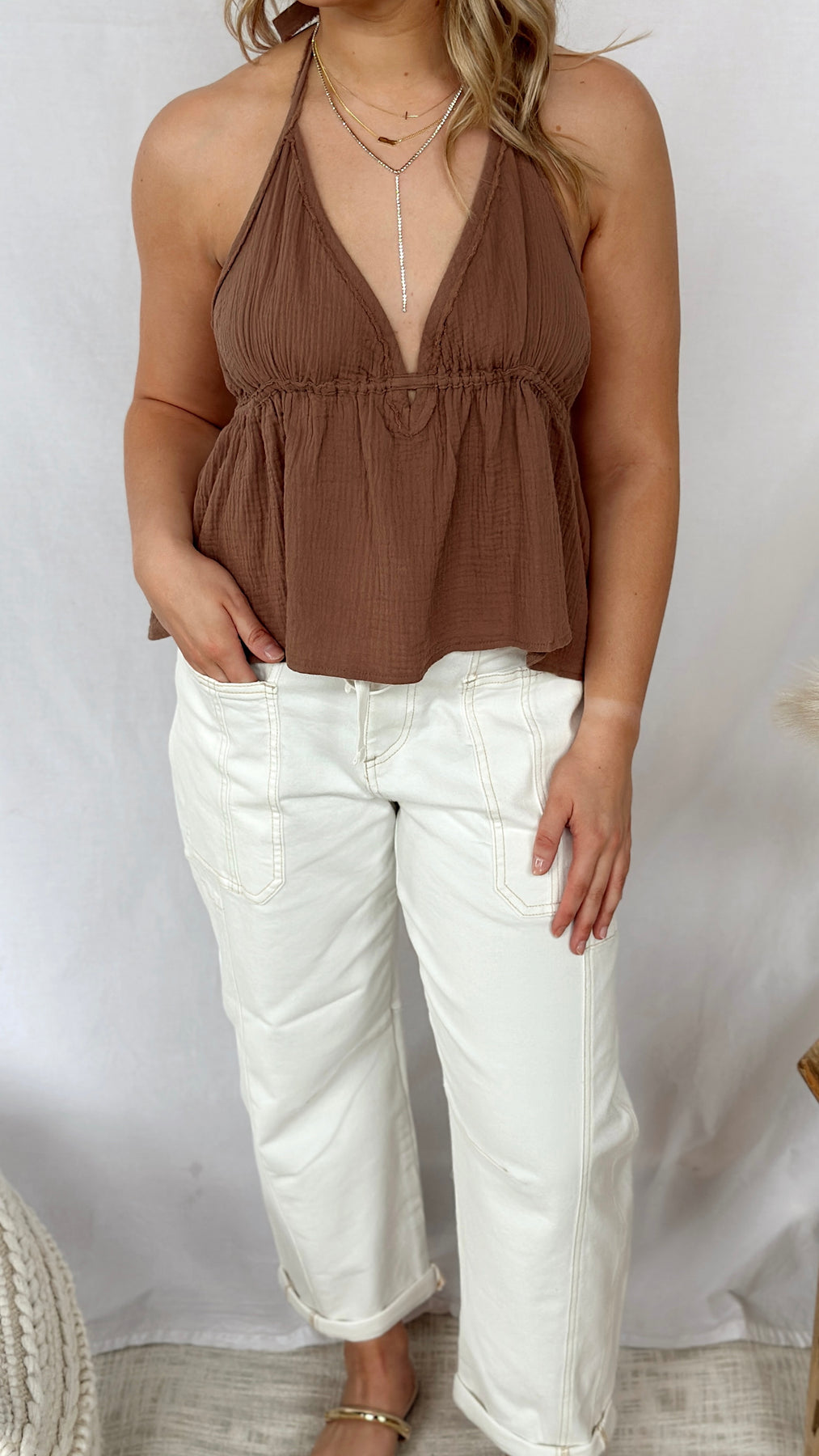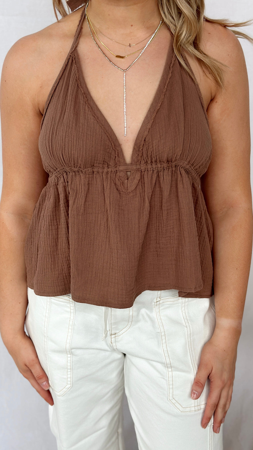 Brown halter neck tank top with adjustable straps.