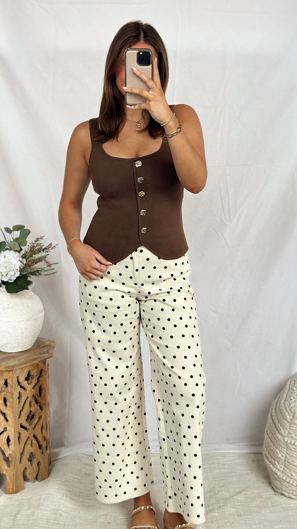 The Cafe Mocha Top features a rich brown hue with an elegant square neckline that flatters the collarbone. Gold button detailing adds a touch of sophistication and visual interest to this versatile tank. Perfect for layering or wearing solo, this piece transitions seamlessly from casual daytime looks to evening outings. The structured fit and refined design make it an essential addition to any wardrobe.