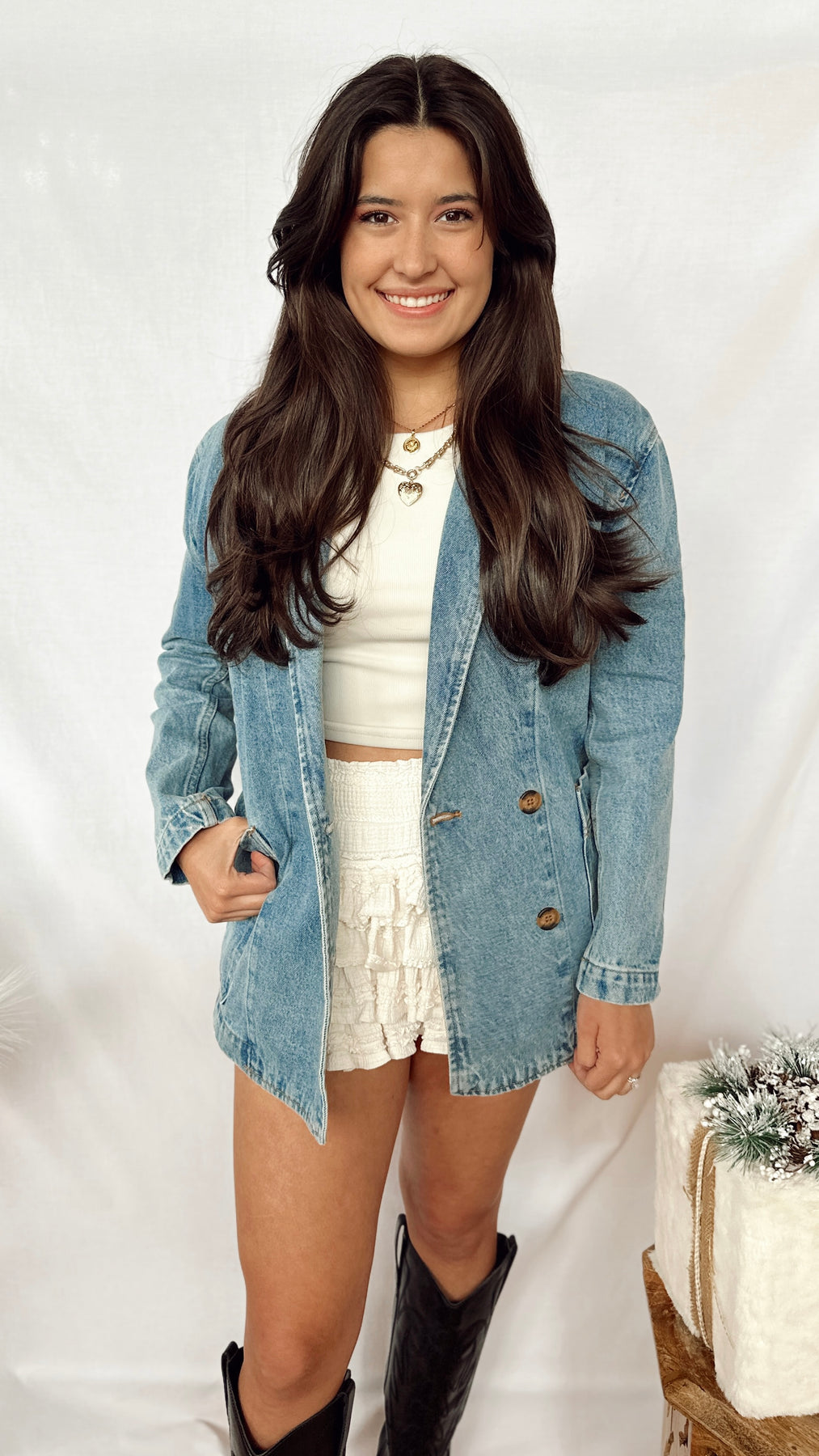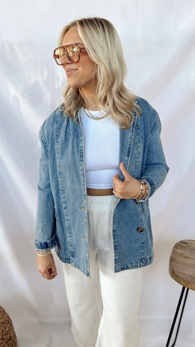 Elevate your wardrobe with The Downtown Blazer. This medium wash denim blazer combines classic style with modern versatility. Perfect for any occasion, it's the perfect statement piece for a fun and simple look. Elevate your street style and make a statement with The Downtown Blazer.