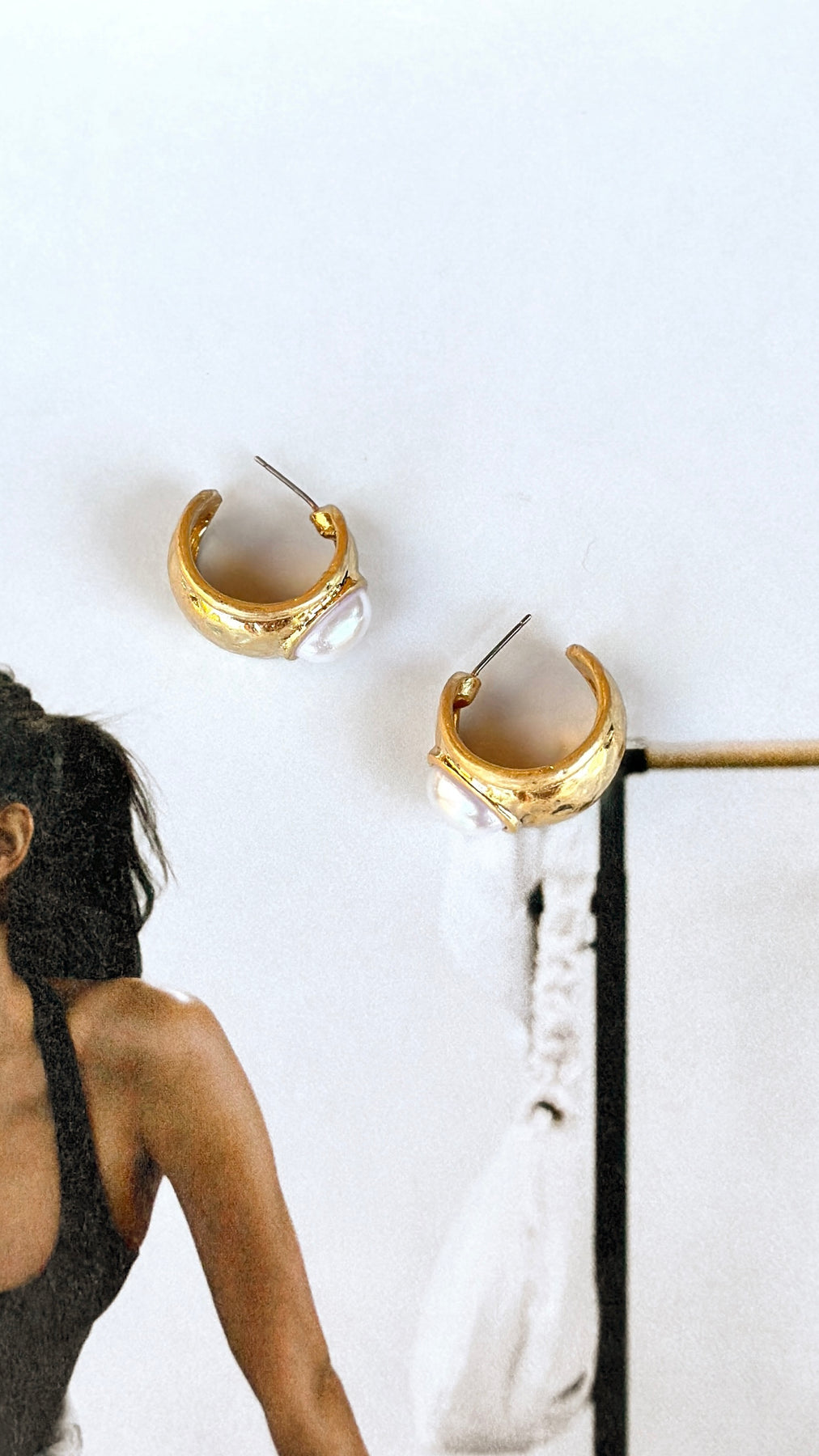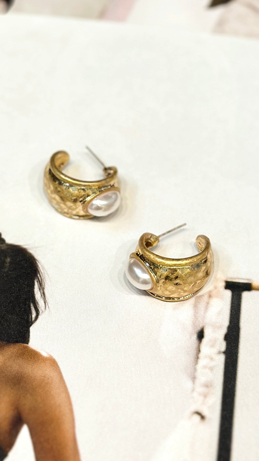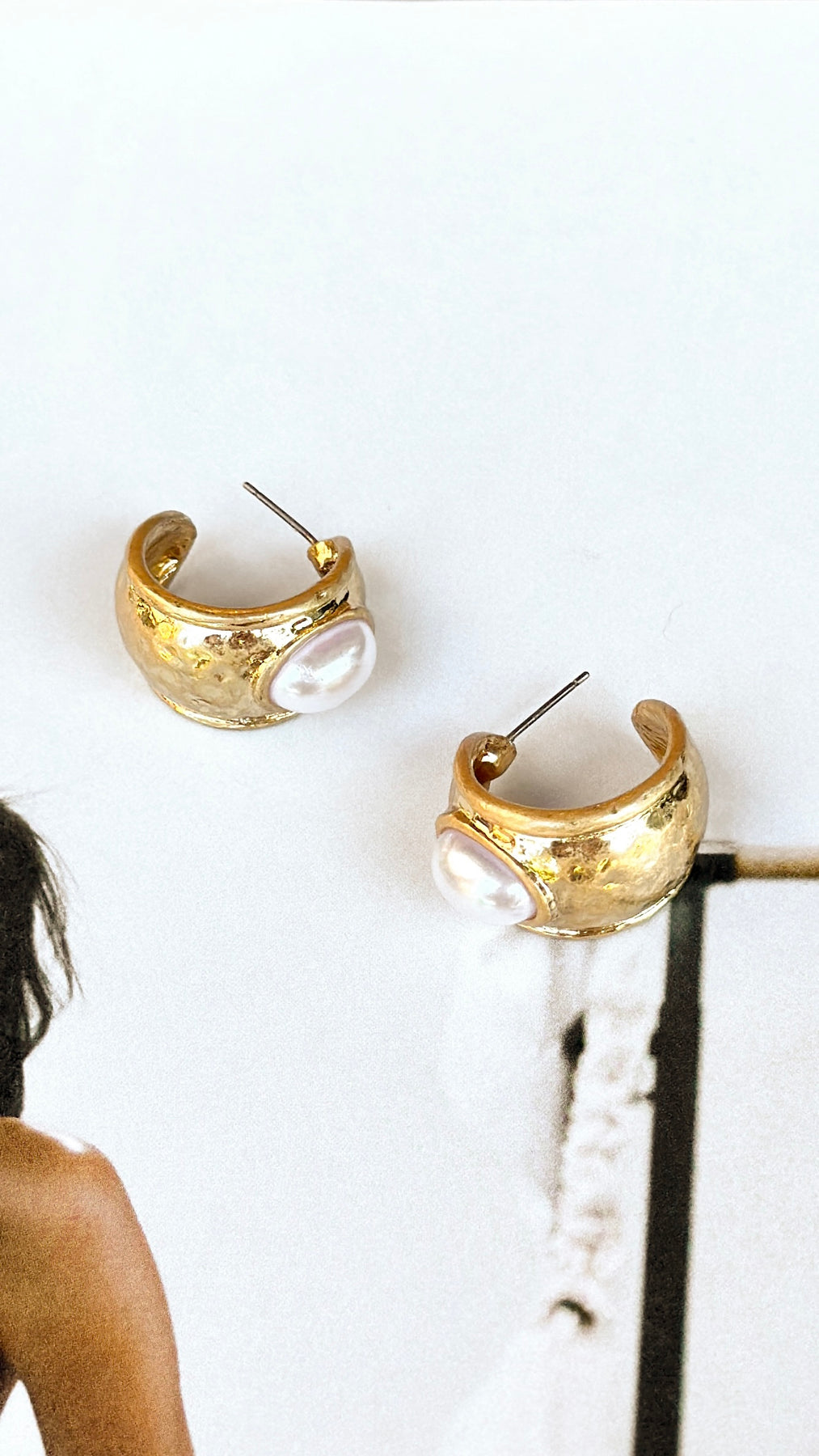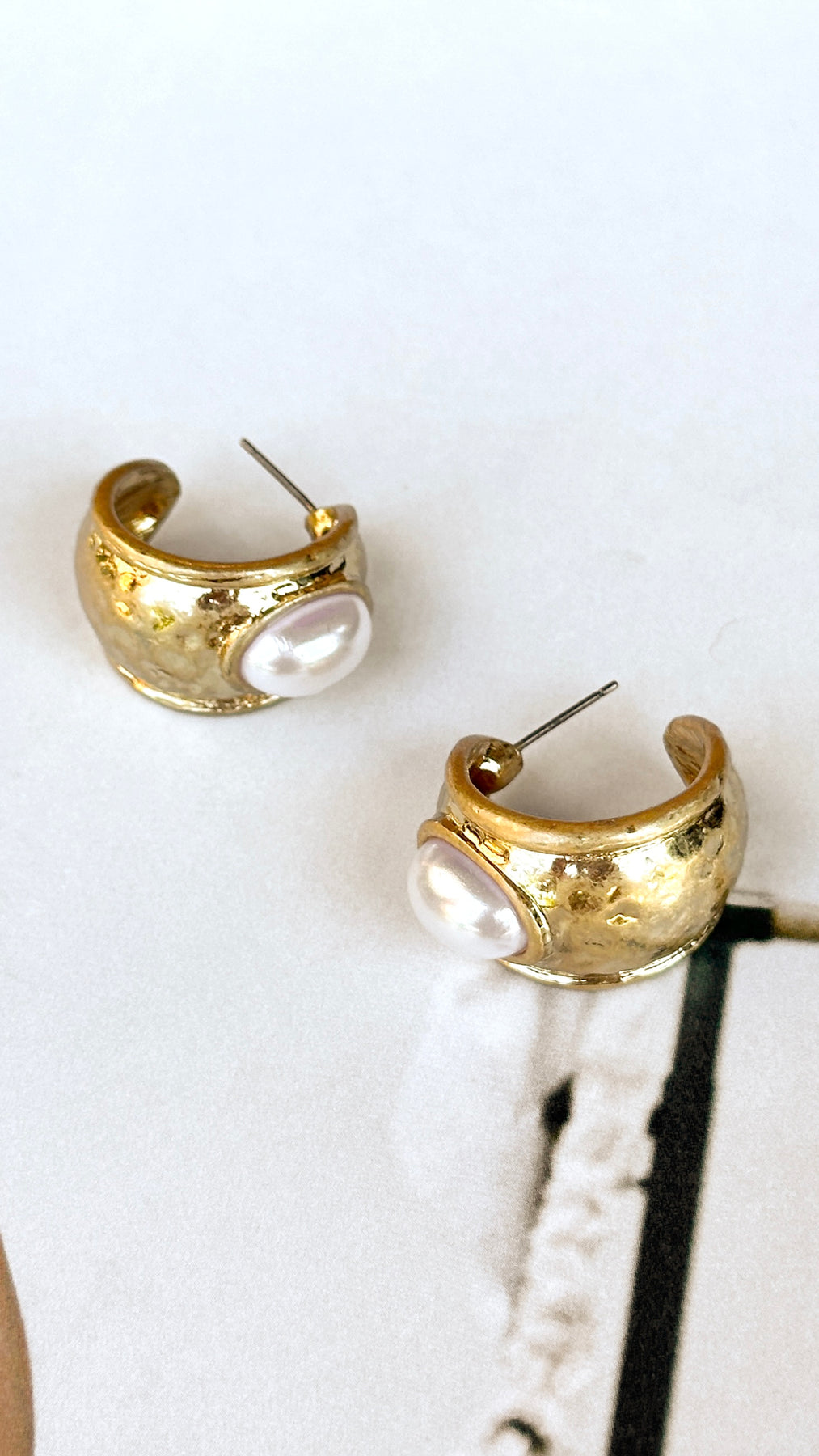 Gold hammered earrings with pearl center.