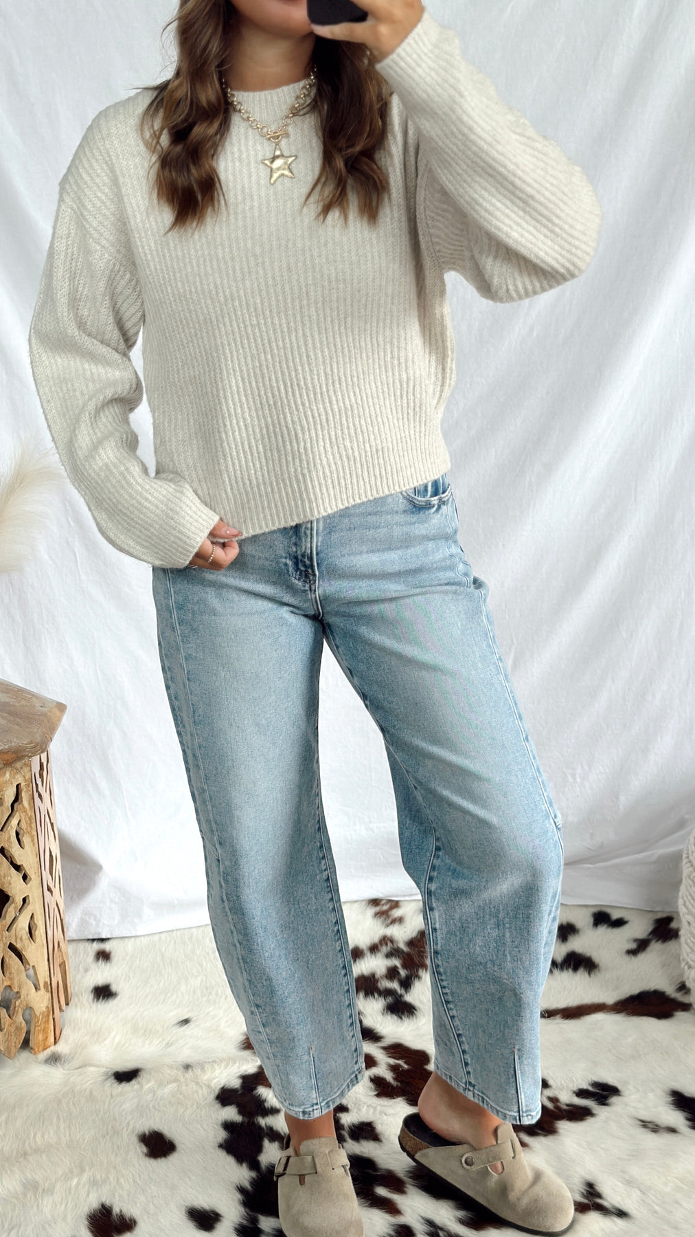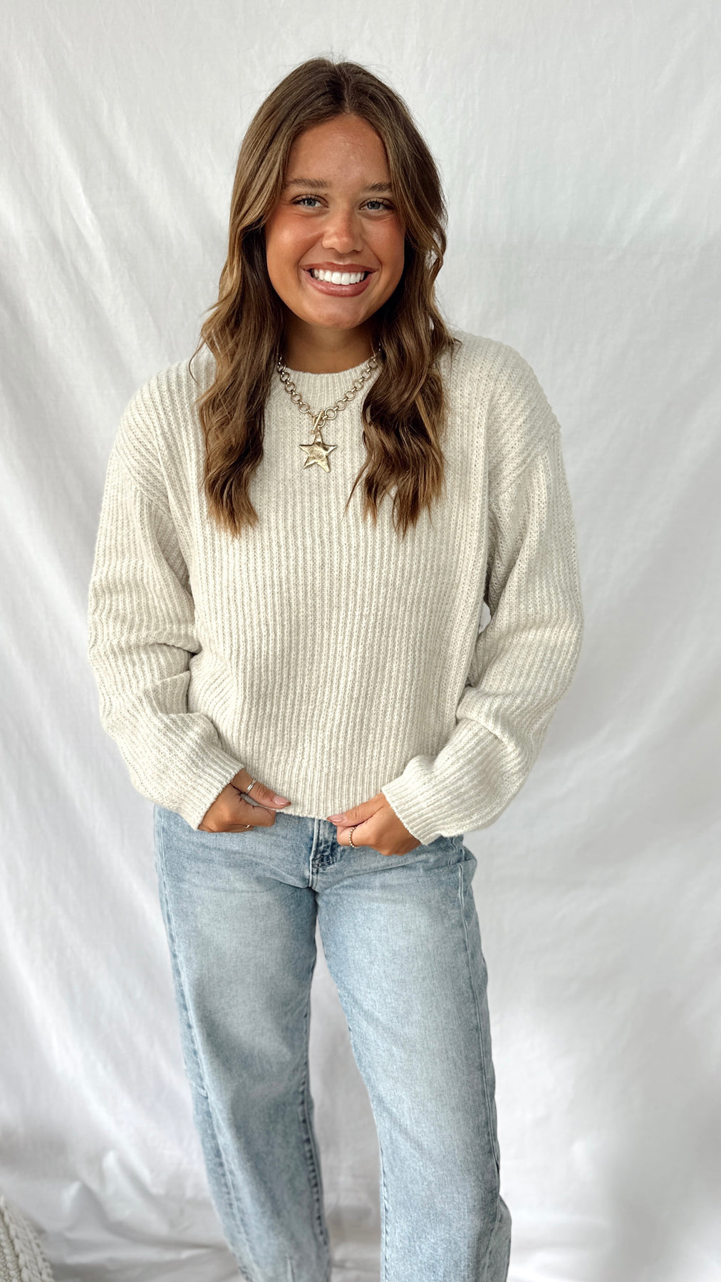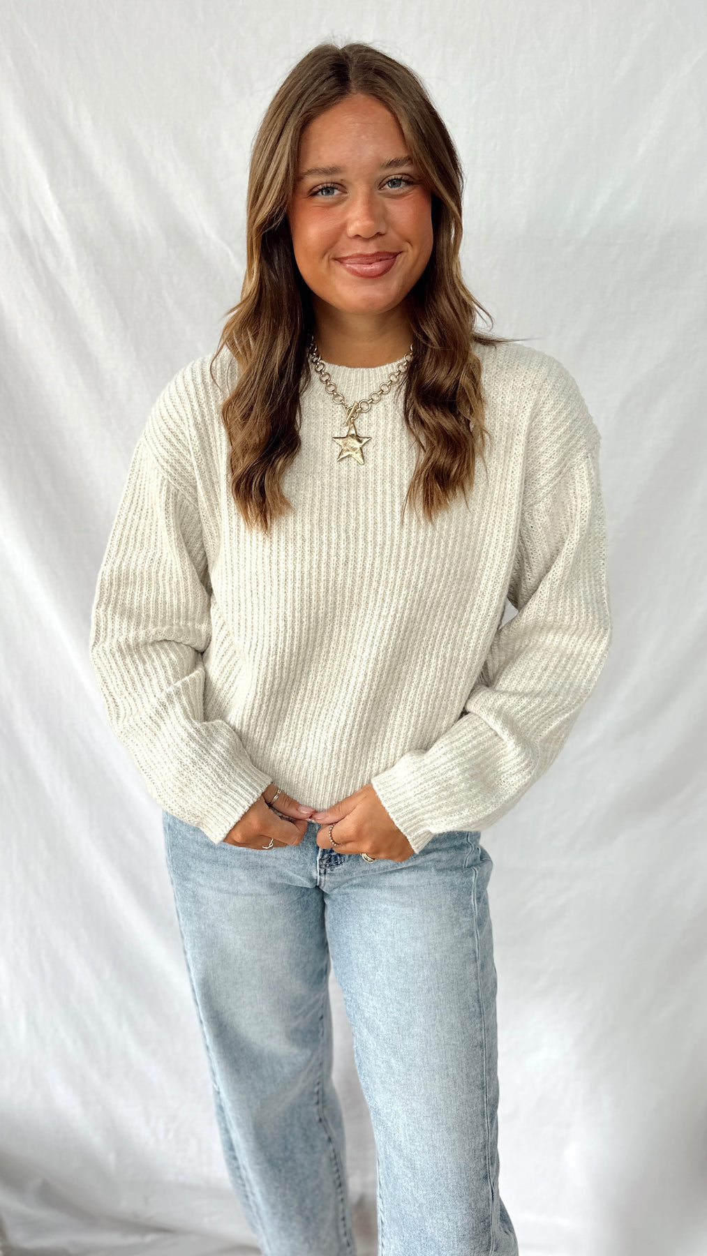 Stay cozy in The Harlo Sweater, a cream-colored long-sleeve that's perfect for everyday wear. Soft and comfortable, it’s easy to pair with anything and keeps you feeling warm all day long. Simple style with a fun, relaxed vibe!
