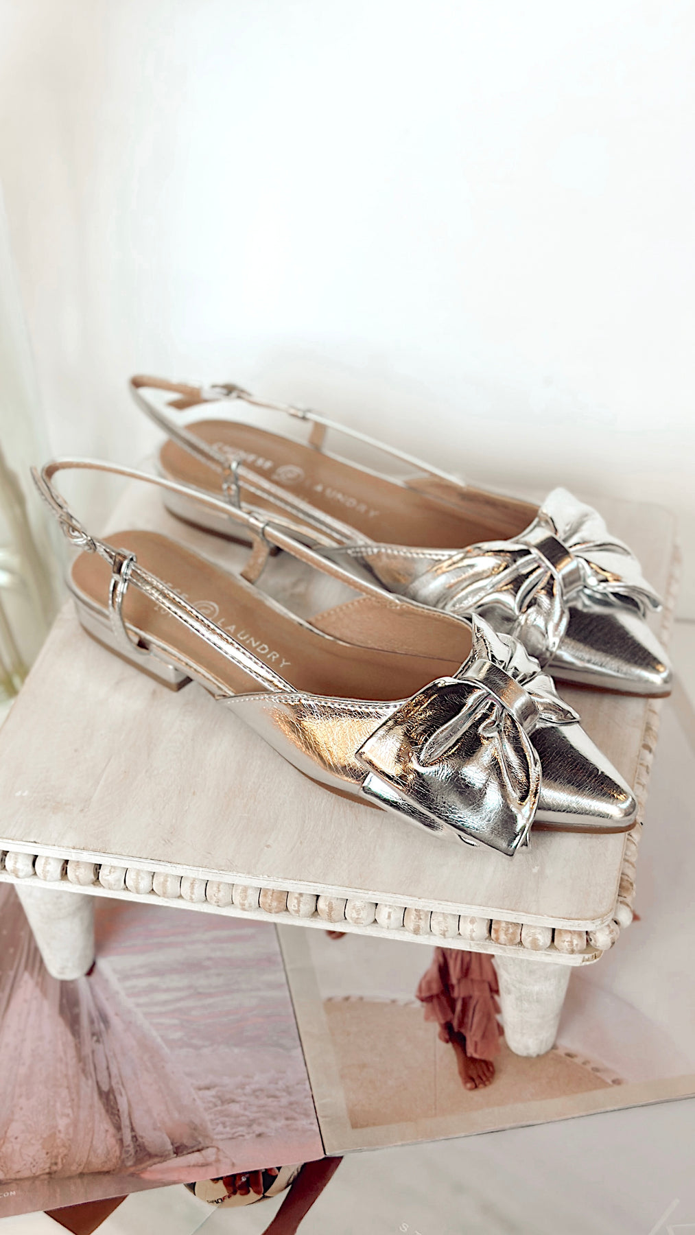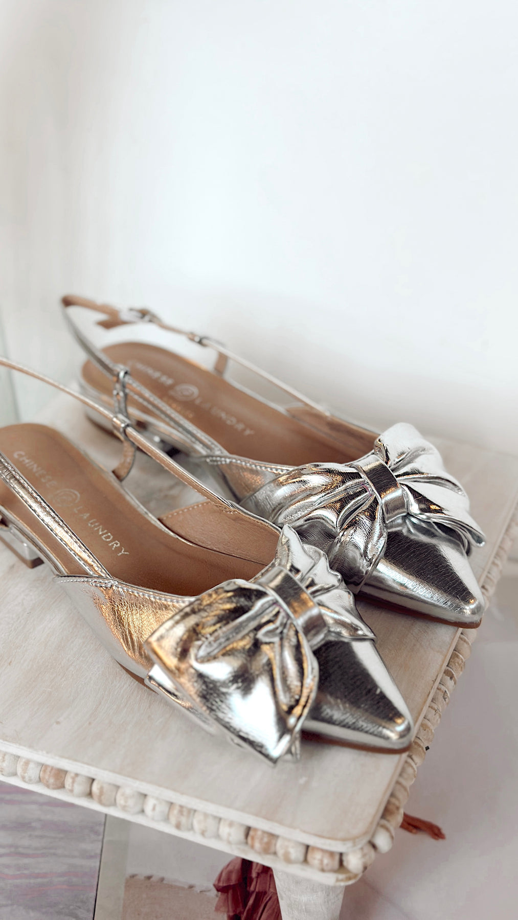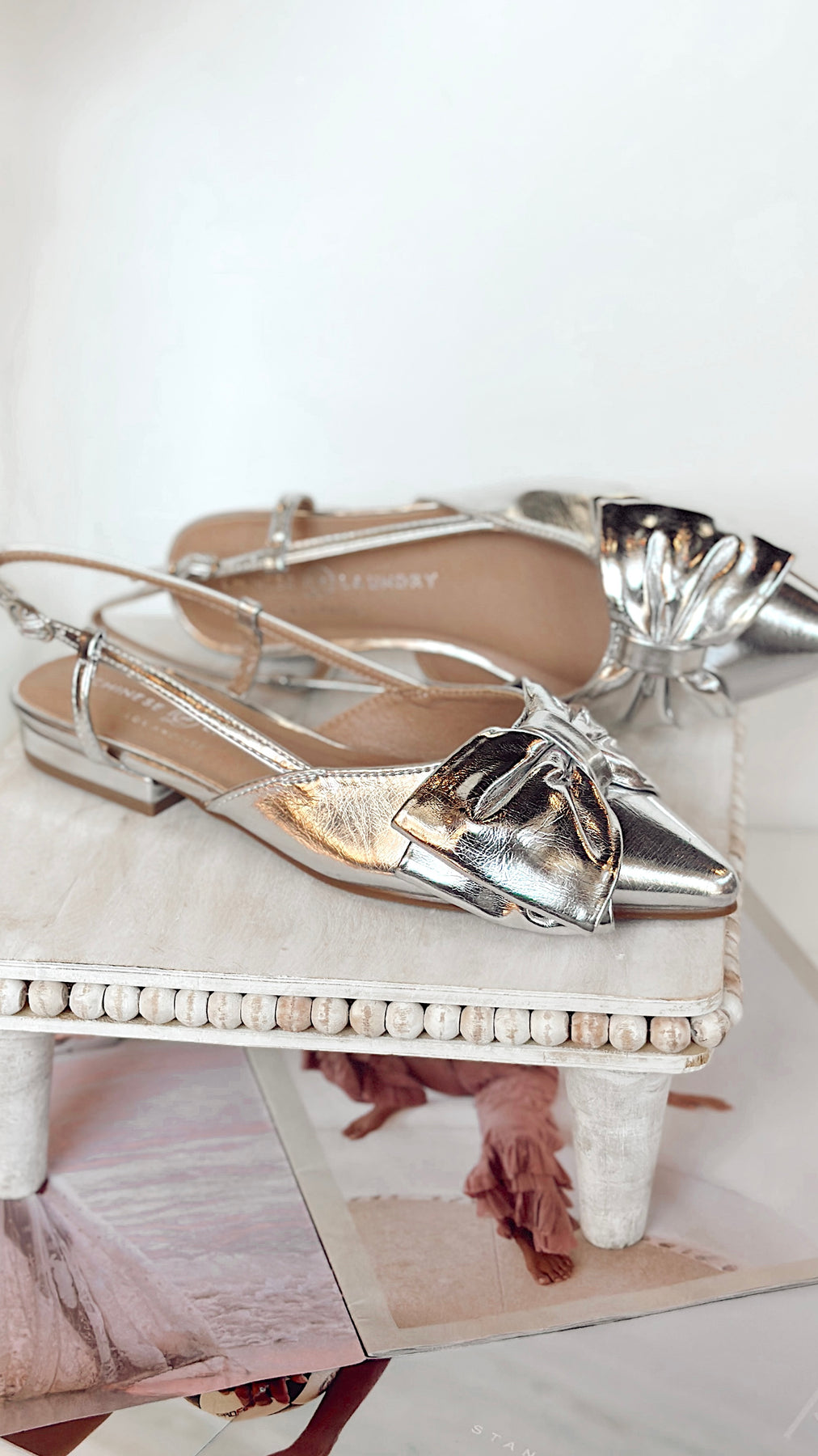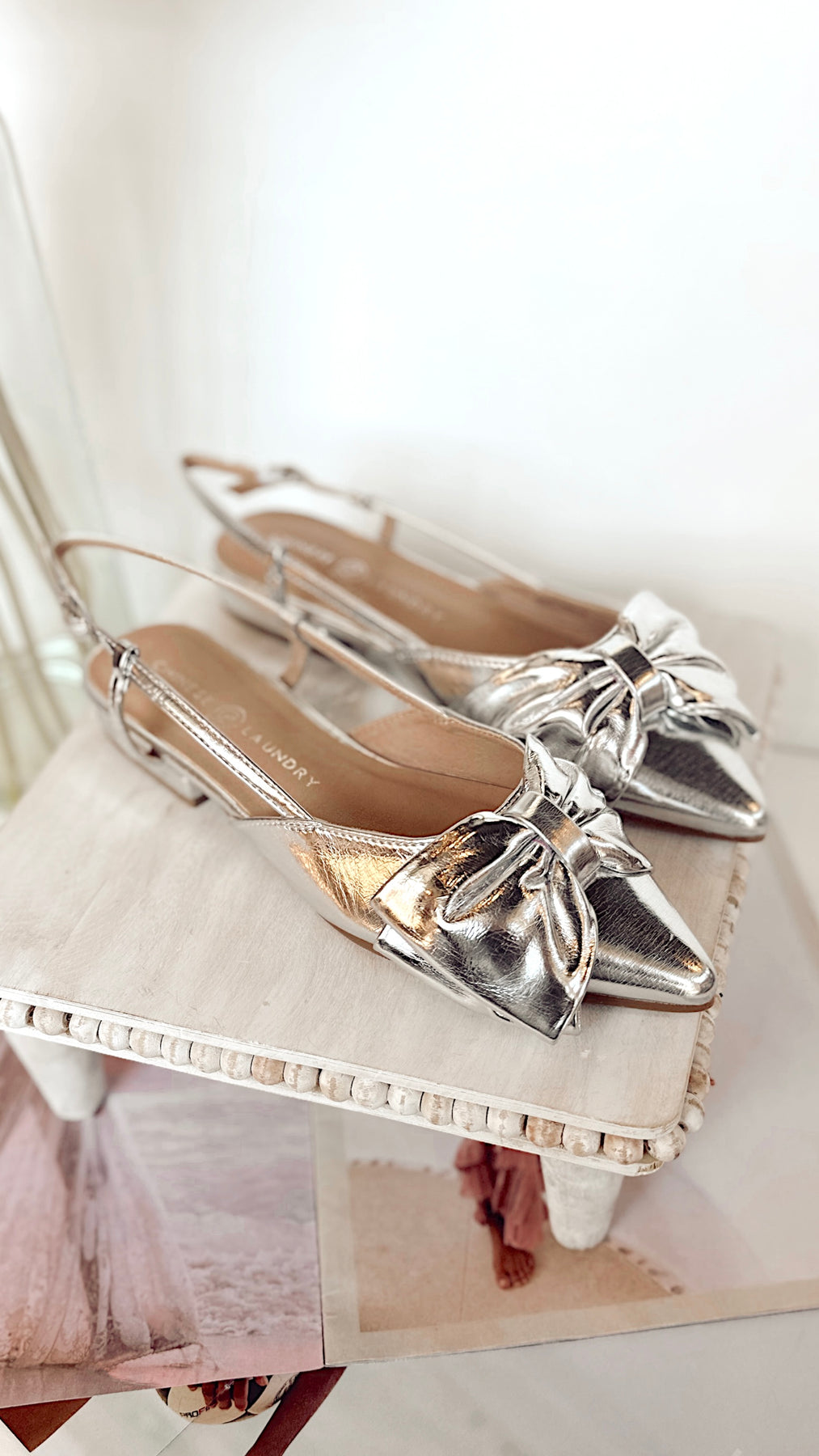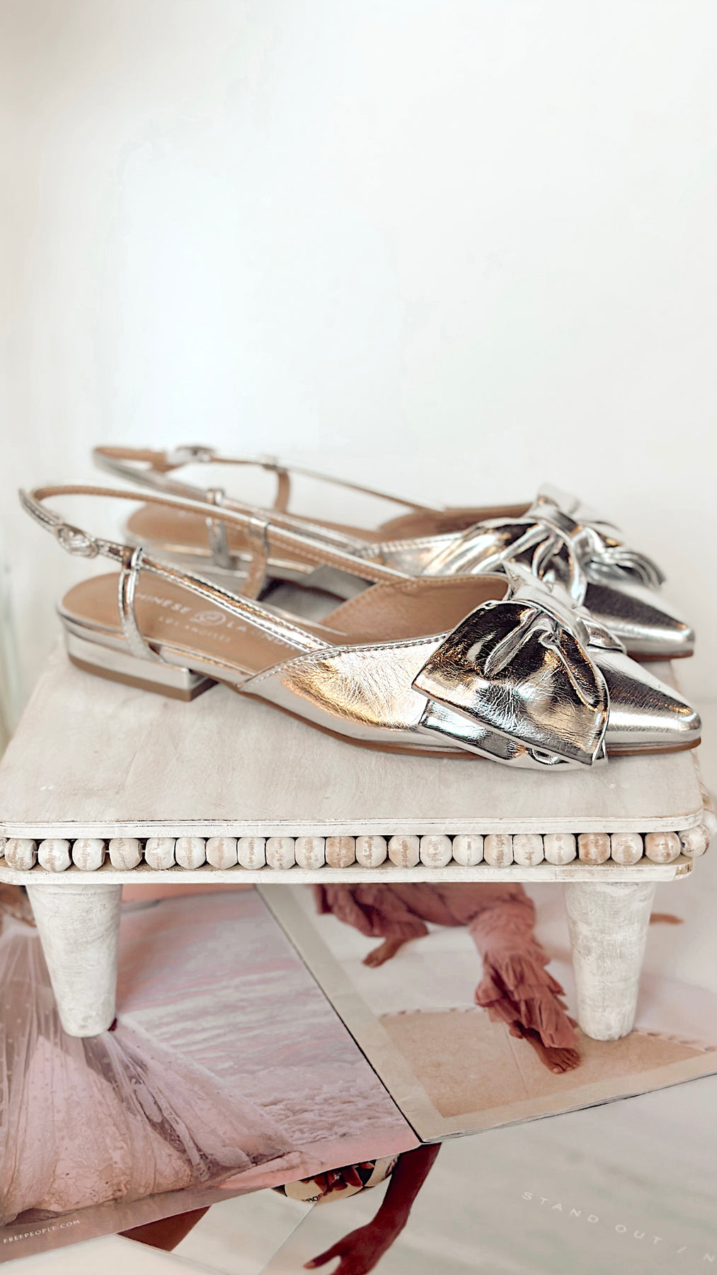 Step up your shoe game with The Harmony Metallic Slingback Flats! These fun and simple pointed flats come in a stunning metallic silver, perfect for dressing up any outfit. The adjustable slingback strap ensures a comfortable fit, while the bow detail adds a touch of feminine charm. Elevate your style with these must-have flats.
