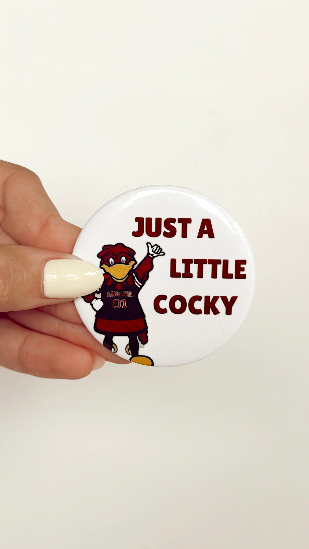 Show off your playful confidence with The Just A Little Cocky Pin. This white pin features the cheeky phrase "cocky" and "Just A Little Cocky," perfect for adding a fun, bold touch to your outfit or accessories. Simple, stylish, and full of attitude!