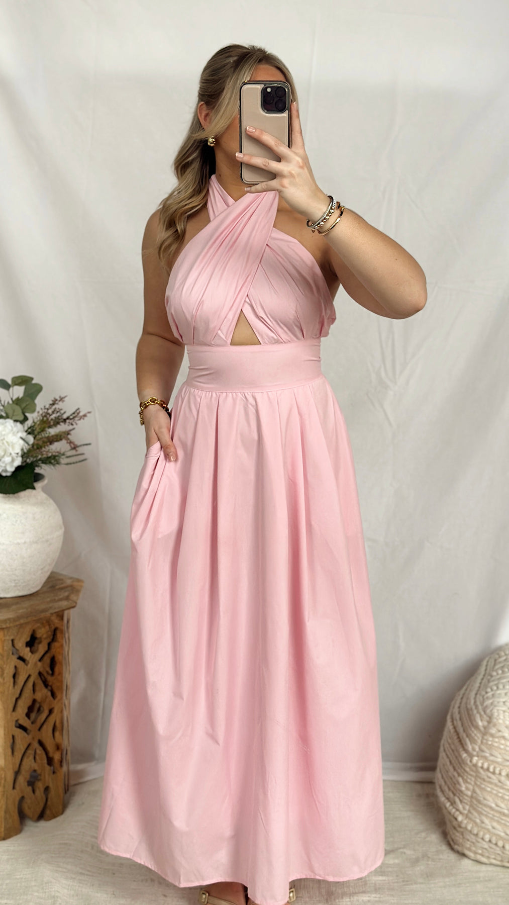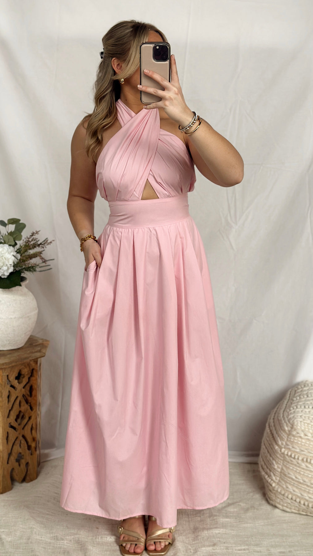 Pink halter neck maxi dress.