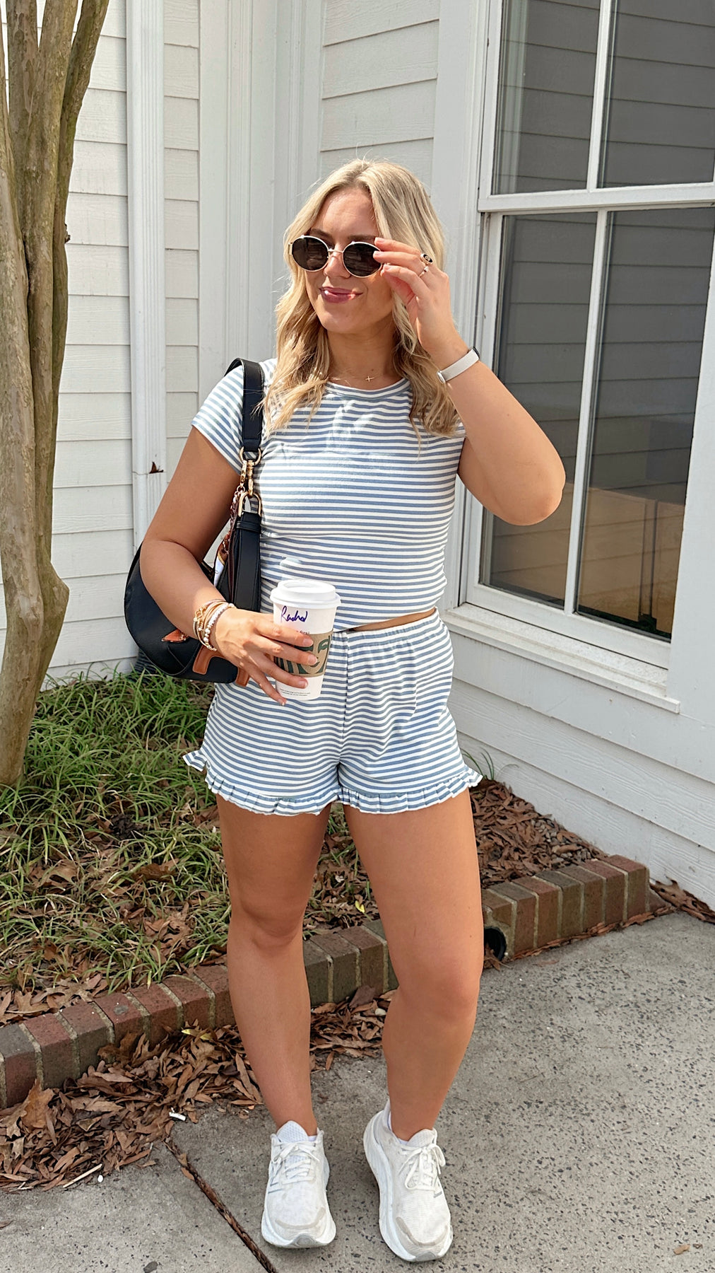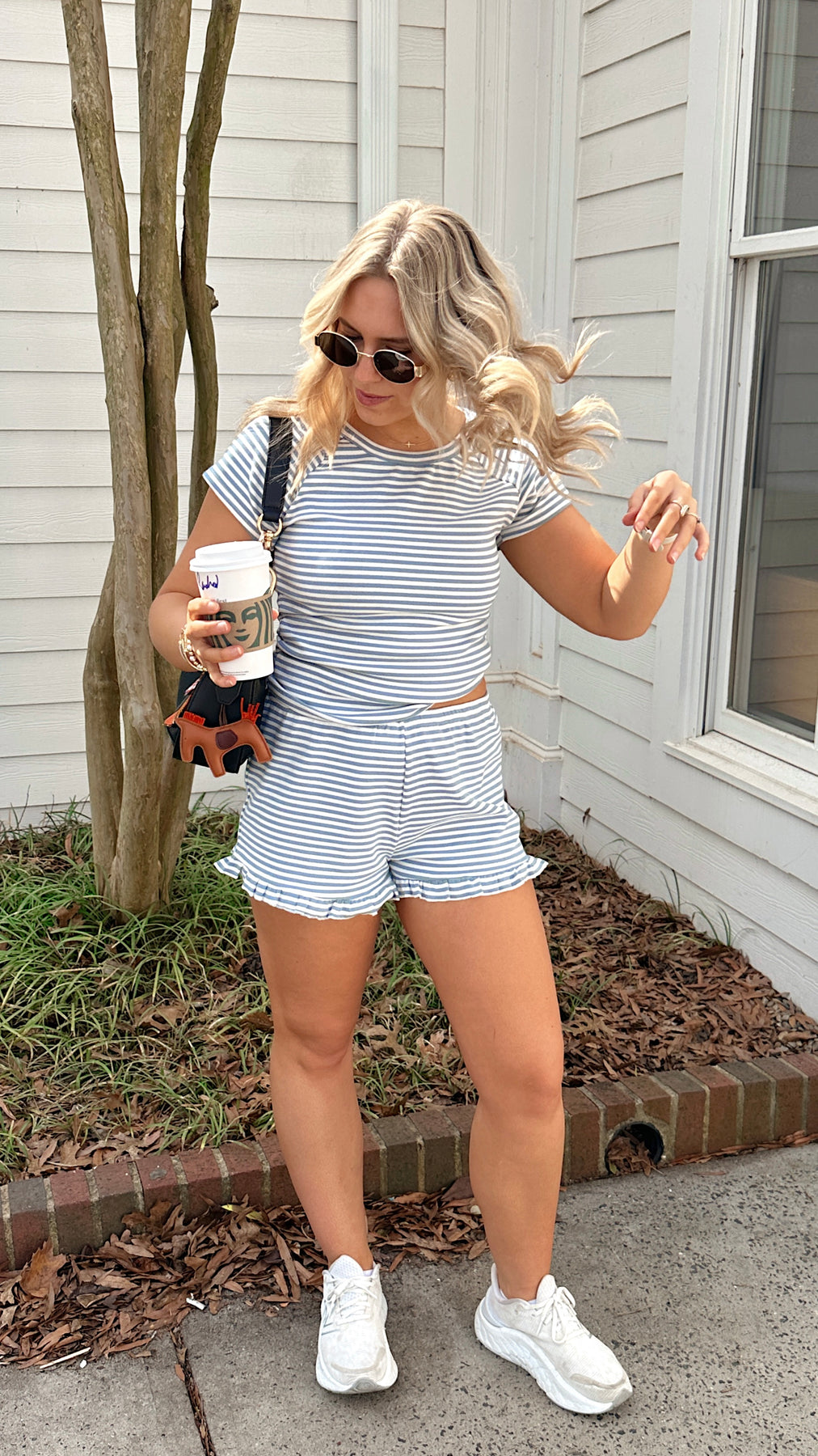 Blue and white striped ruffle detail shorts. Pairs perfectly with our Lily Top!