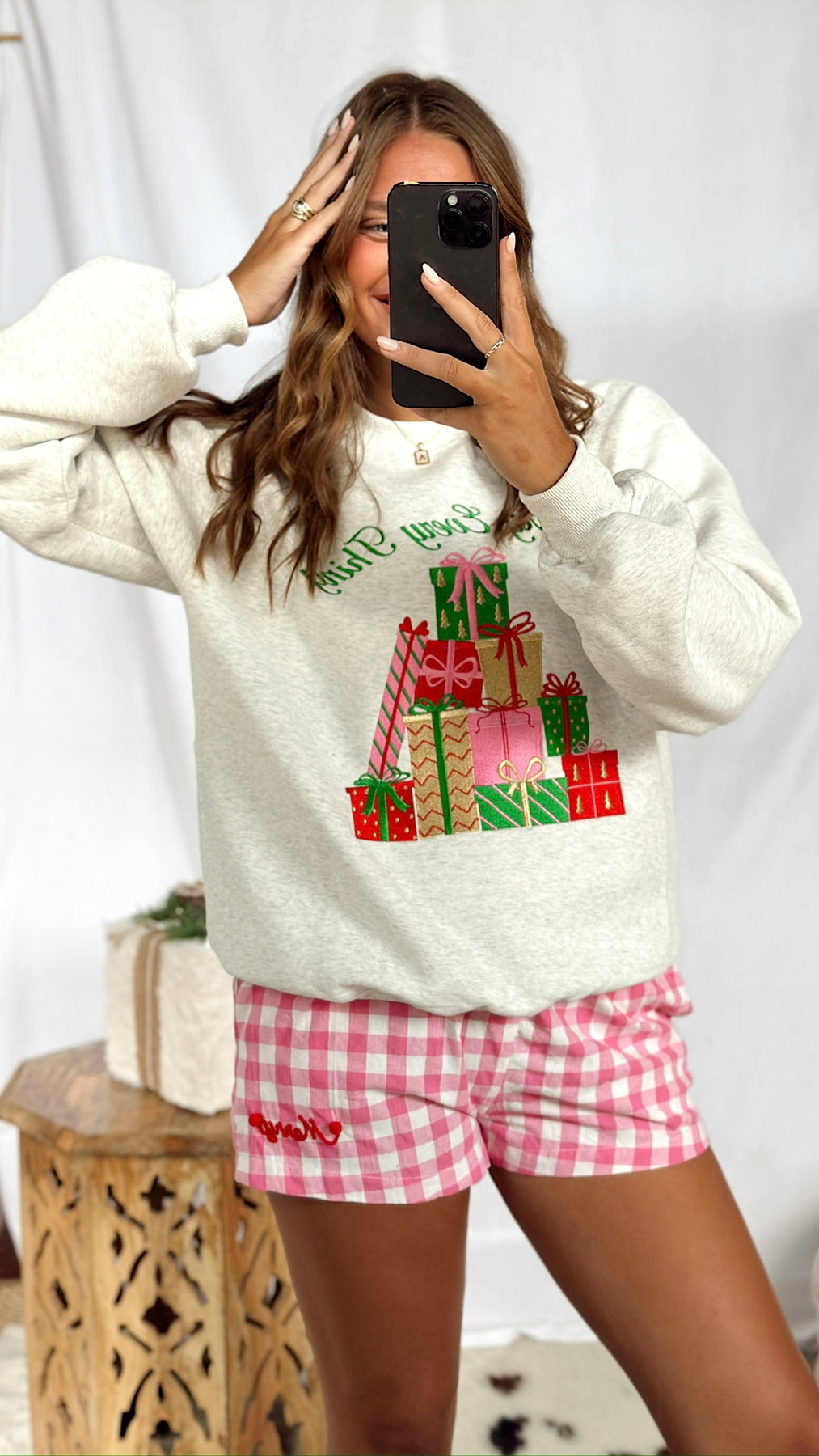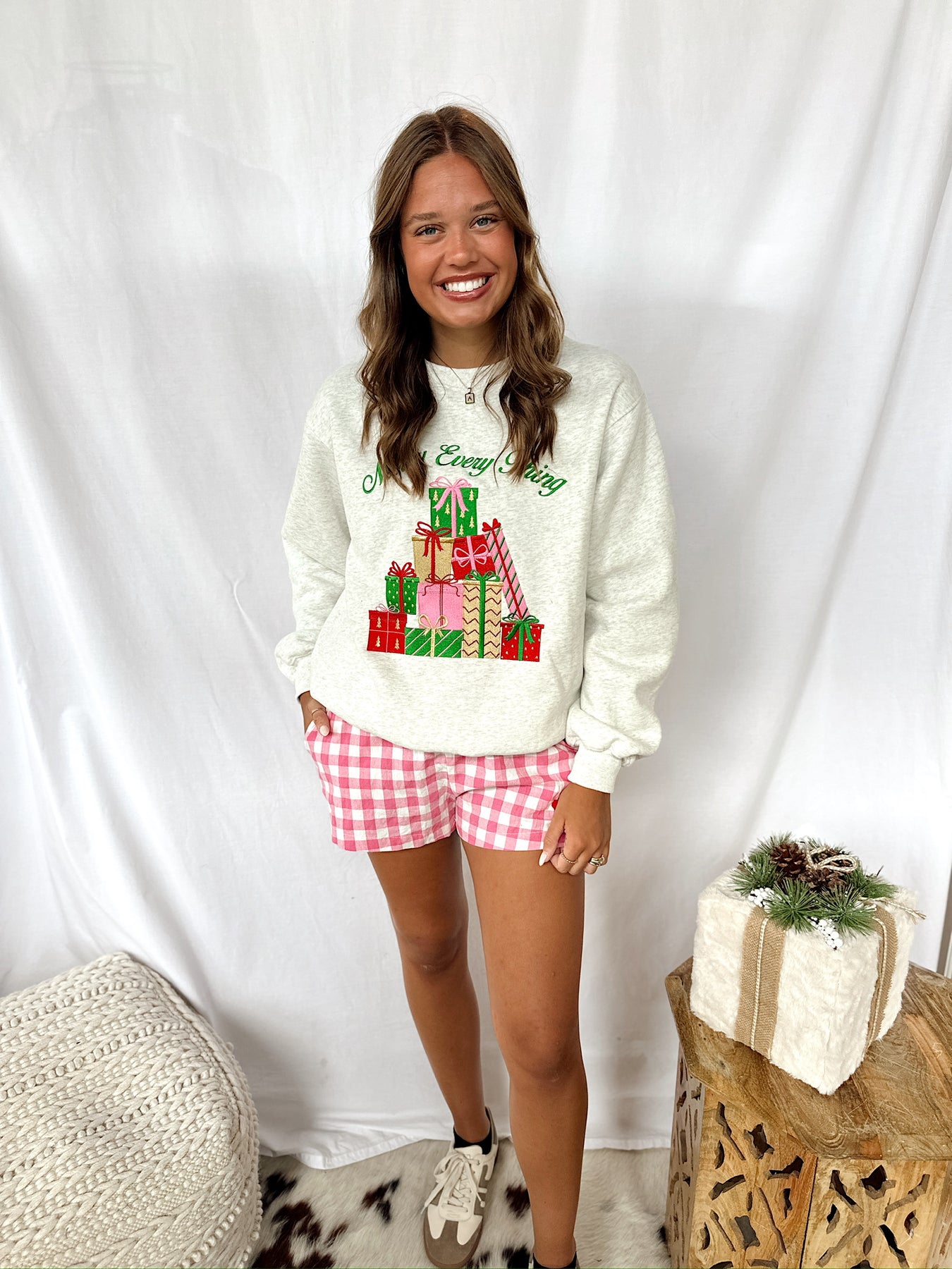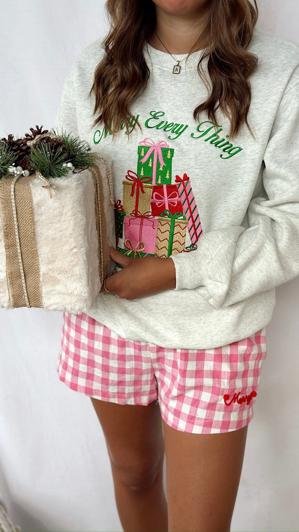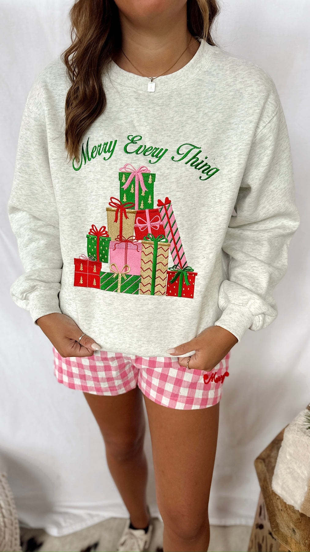 Stay cozy and festive in the Merry Everything Sweatshirt, featuring a soft feathered grey exterior and a warm fleece lining inside. Perfect for chilly holiday days, this comfy sweatshirt brings a relaxed, joyful vibe to all your seasonal celebrations. Feel the warmth and spread the cheer effortlessly!