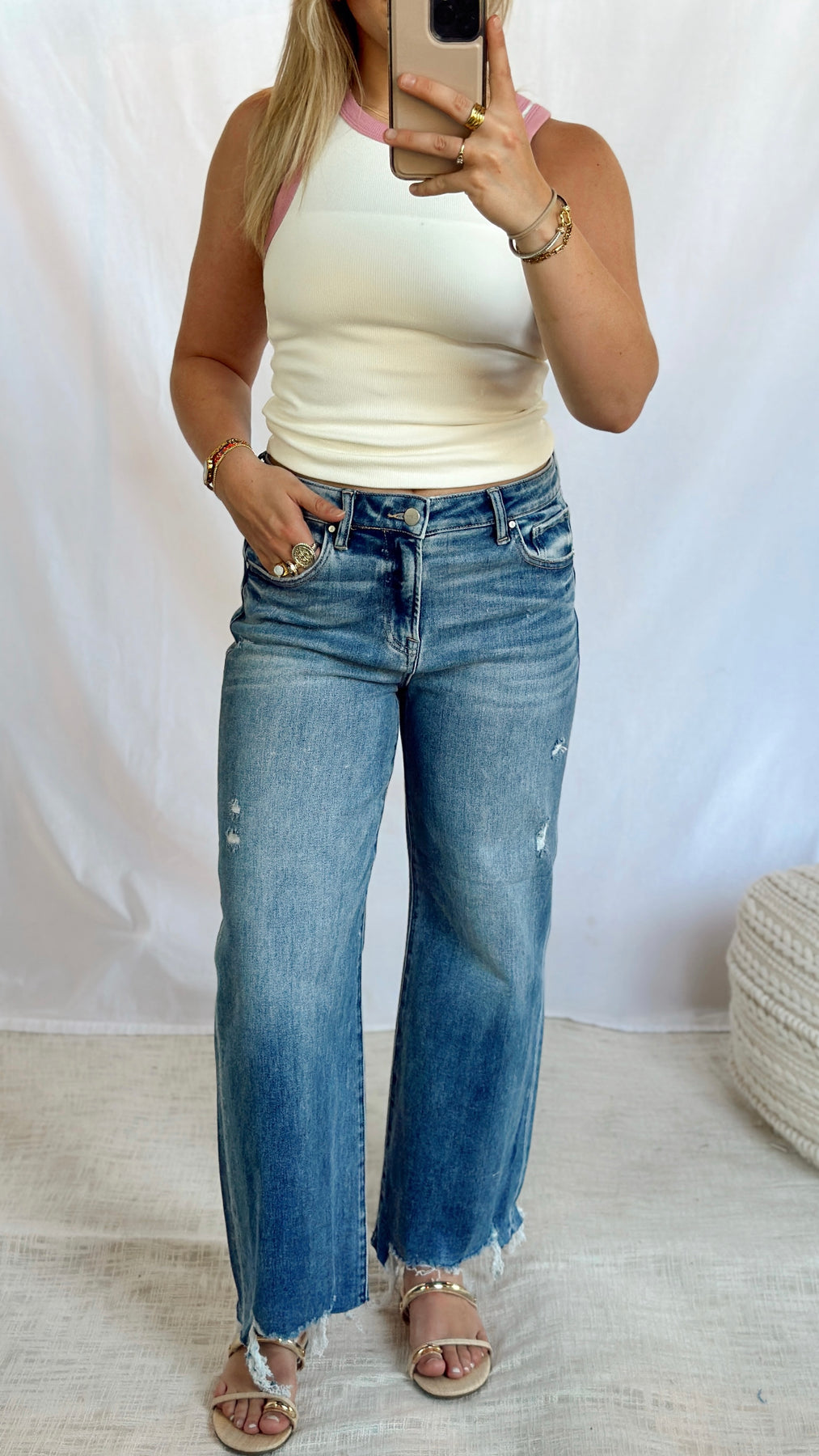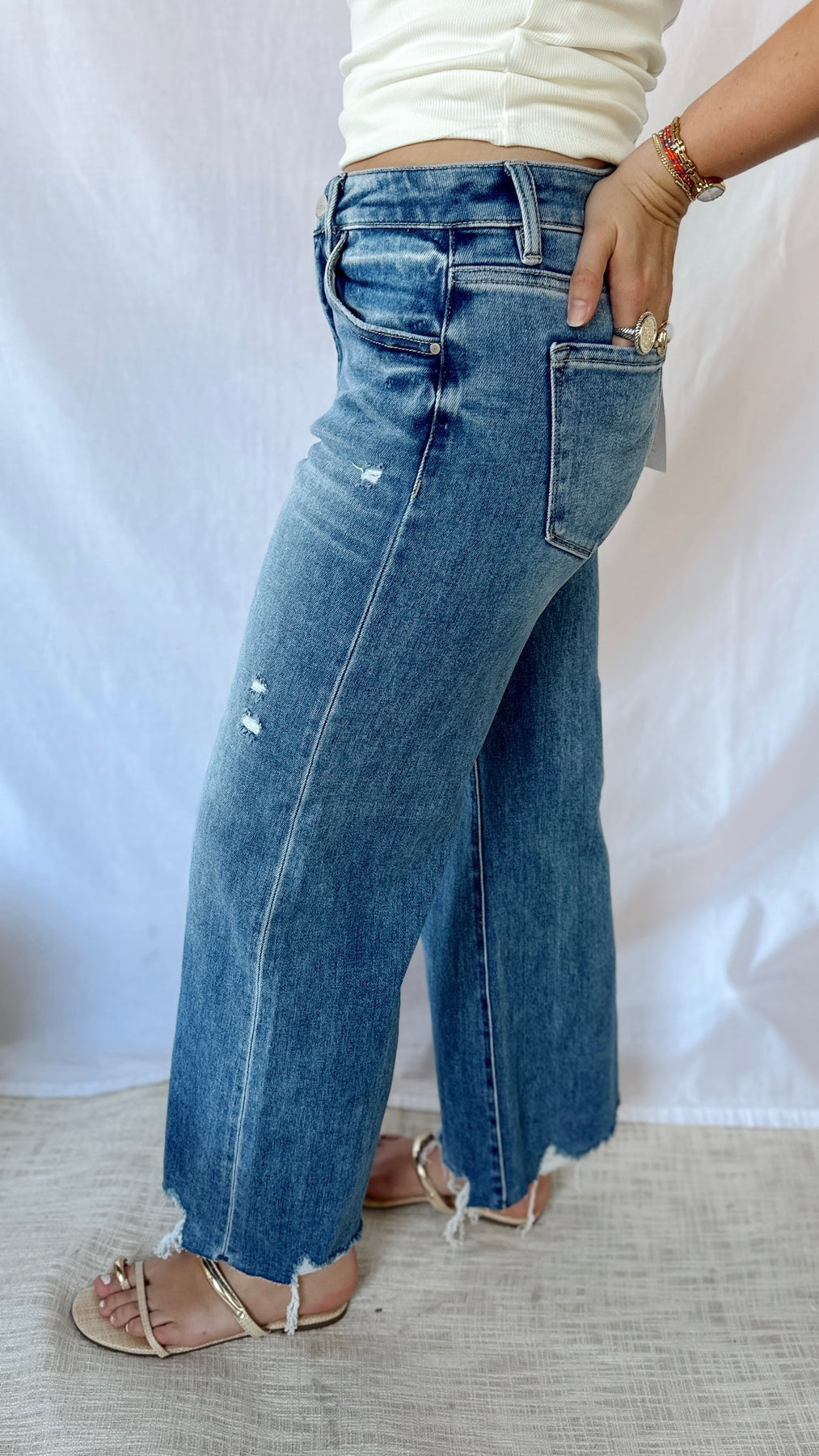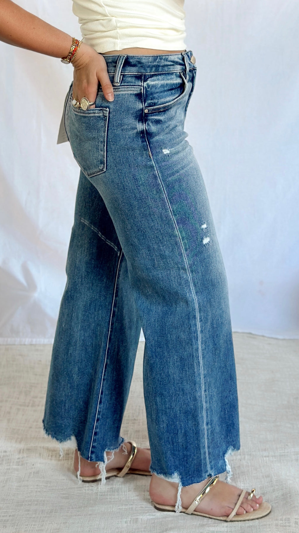High rise cropped wide leg jeans.